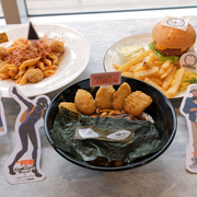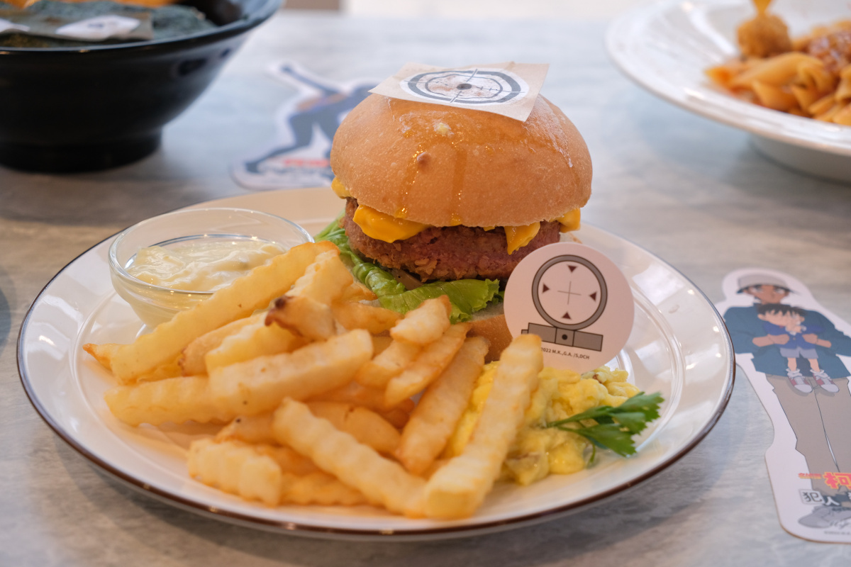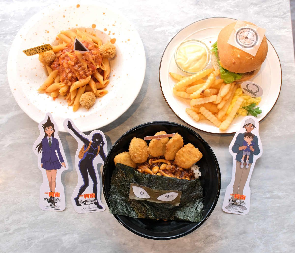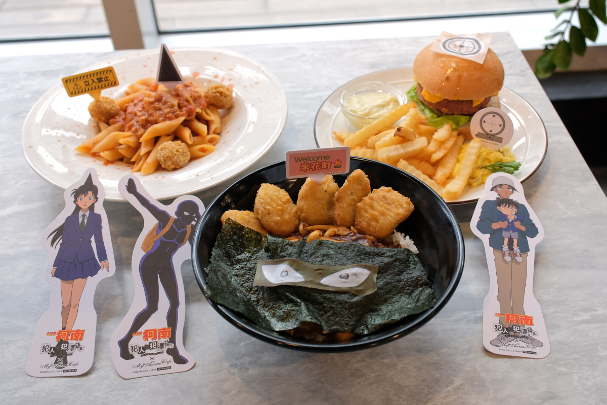 名偵探柯南 犯人.犯澤先生》主題咖啡廳,推出多款蔬食餐點,例如給犯澤先生的「Welcome 犯澤米花丼」、緊追犯澤先生謎樣雙人組的「追蹤者堡堡餐」、以及結合米花市的兇案印象及全作最強火力的「角力紅醬斜管麵」這種結合角色特色與食材的餐點,或者像是針對劇情及作品風格設計的「血紅野莓優格聖代」、「米花名物爆炸聖代」、「派對咖繽紛布朗尼」、「幸福相遇波士頓派」甜點,以及 10 款角色飲品,帶領粉絲進入犯澤先生的世界中。