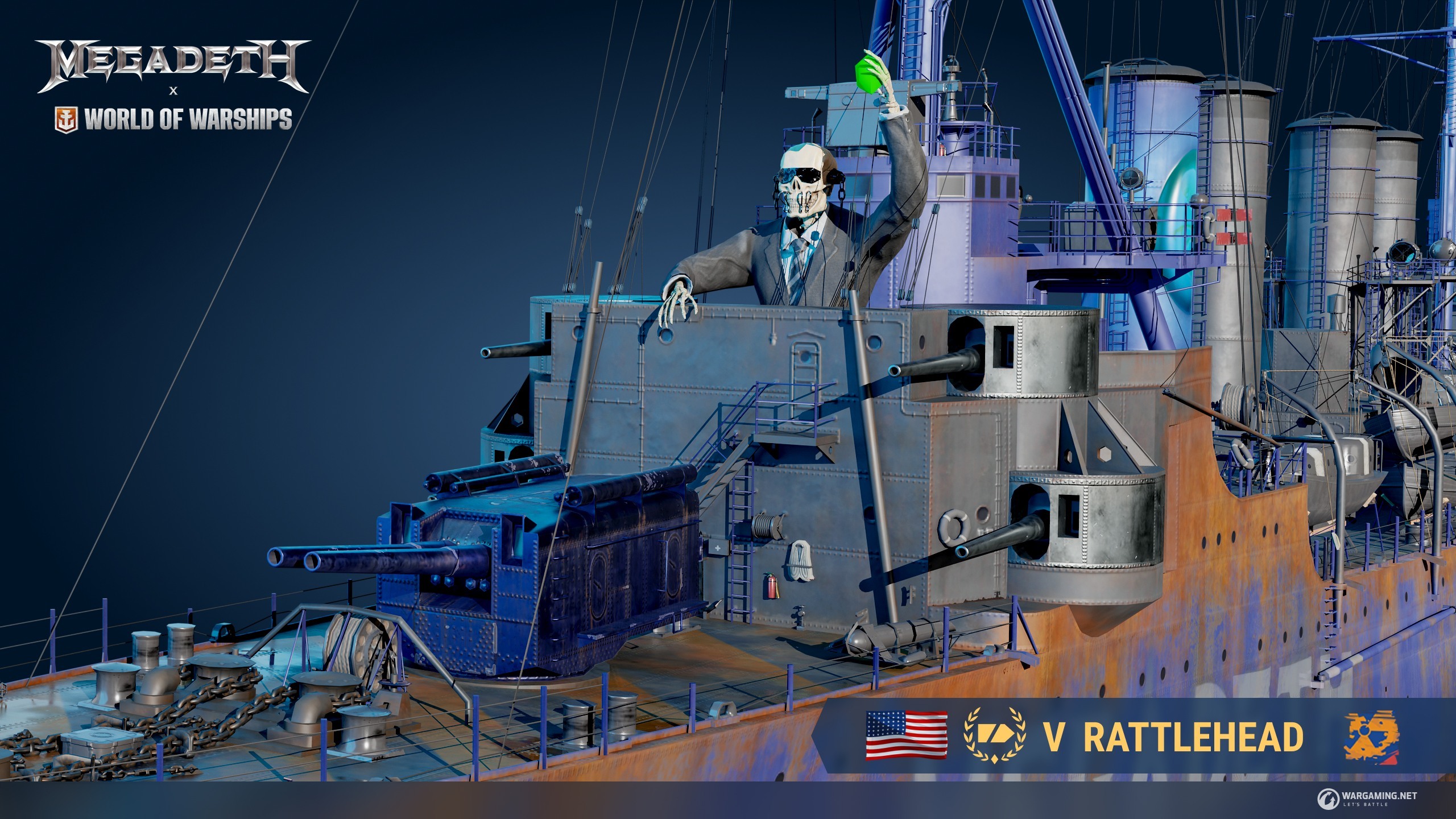 戰艦世界 》玩家將參與特殊任務來獲得專屬指揮官。樂團主唱 Dave Mustaine 將化身為附帶原創配音的指揮官,而吉祥物 Vic Rattlehead 也將加入戰鬥,Death Ray Patch 則為完成特殊任務的最終獎勵。此外,團隊將於《