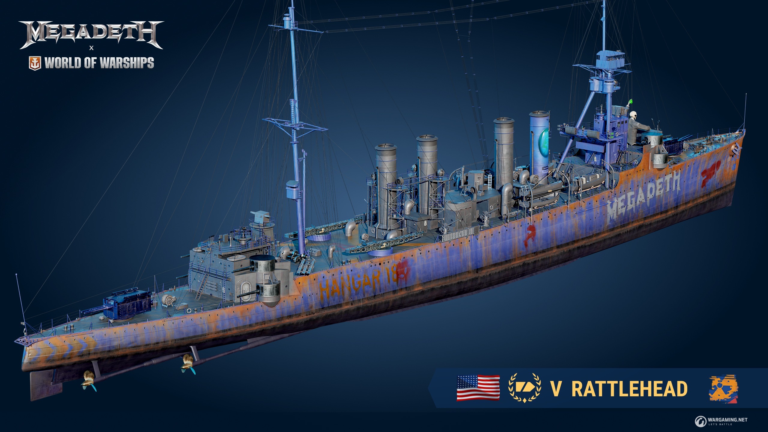 戰艦世界:傳奇 》玩家將獲得 Rattlehead 巡洋艦作為獎勵。在使用此戰艦時,玩家將能使用 Dave Mustaine 和 Vic Rattlehead 的偽裝作為獎勵。此外,玩家還可以獲得帶有樂團 logo 和 Vic Rattlehead 頭像的主題徽章和旗幟,以表達他們對鞭擊金屬先驅的忠誠。