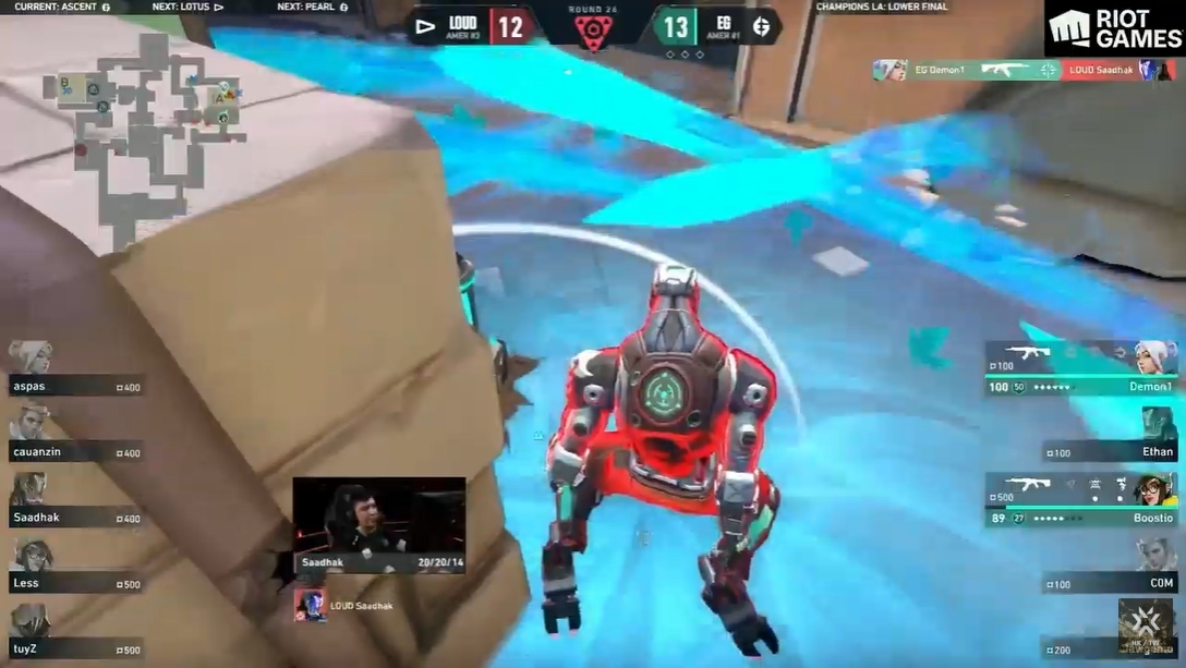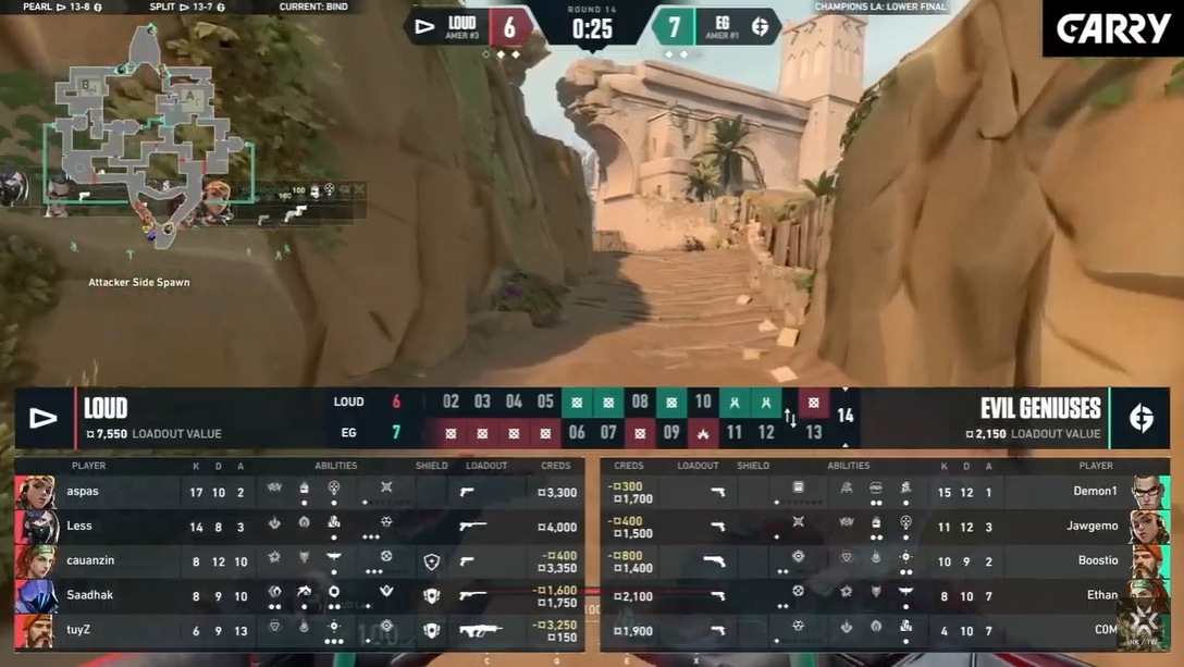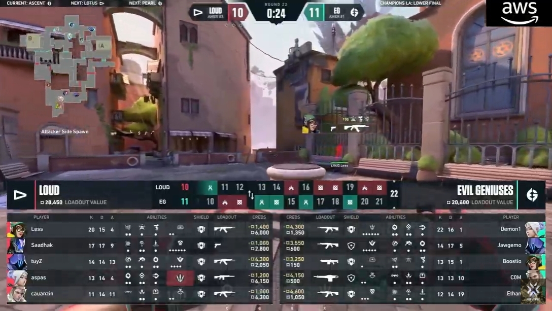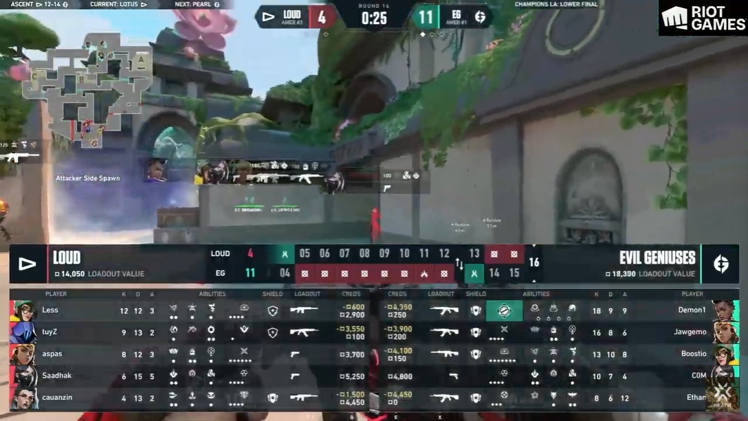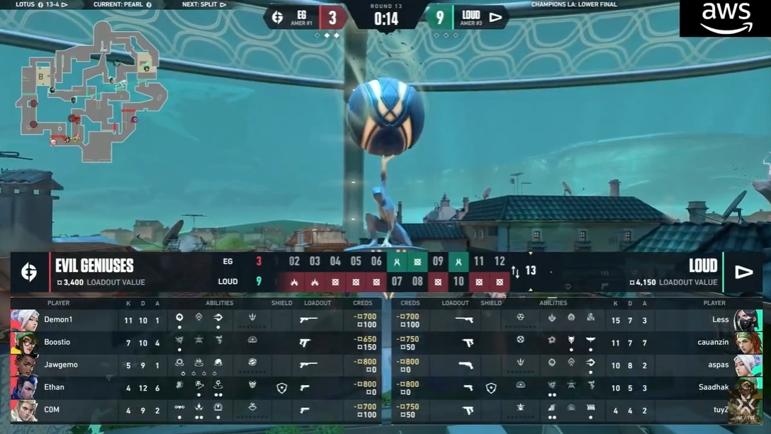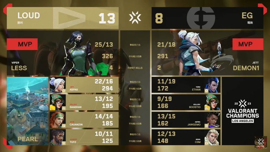 第一場比賽地圖為「義境空島」,LOUD 選擇先守。首場比賽雙方就打得十分激烈,LOUD 以 2:0 開局,但接下來兩局 EG 給了很大的壓力,比分來到 2:2。接下來進入比分拉扯,直到 11 局後 EG 逐漸拉開了比分,以 9:5 暫時領先。第 15 局後,雙方節奏慢了一下,LOUD 最後在人頭優勢上拿下了這局,暫時止住了 EG 的連續得分,下一局 EG 又扳回一城,比分來到 10:6。LOUD 沒有因落後亂了陣腳,反而穩穩緊追在後,在 21 局將比數追到 10:11,落後一分。下一局,EG 打出了驚險的對槍勝利,Ethan 順利守住第 12 分,EG 搶先聽牌。LOUD 在接下來兩局的節奏打得很快,連下兩城,將比數拉到 12:12 平手。第 25 局,EG 一換五拿下 13 分,再次聽牌,而下一局殘局 Saadhak 一打二惜敗,讓 EG 以 14:12 拿下第一場勝利。