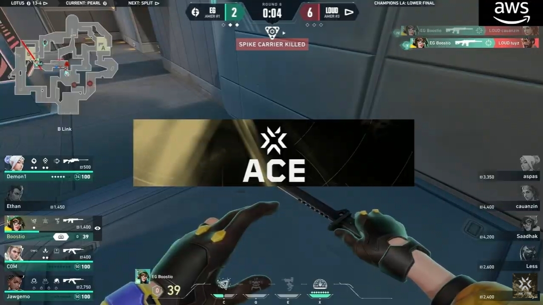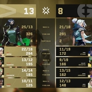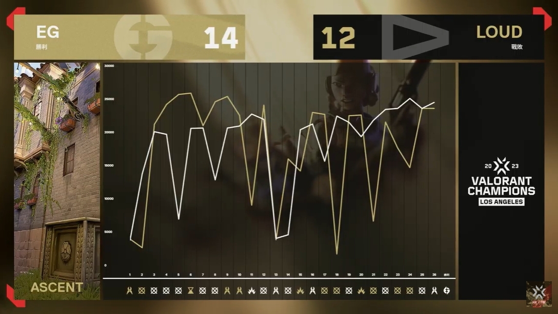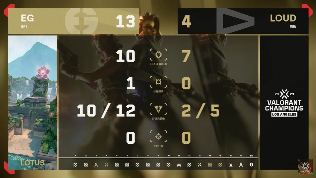 攻守交換,戰況越來越激烈。EG 氣勢如虹,在 16 局拿到 10:6 比分優勢。LOUD 喊出了暫停,也順勢收下 17 局比分,隨後換 EG 叫了暫停。EG 在 20 局拿下第 12 分,率先搶下決勝點。最後的殘局雙方一對一,EG Ethan 順利收下 LOUD Tuyz,以 13:8 取得第五場勝利。EG 峰迴路轉以三比二擊敗 LOUD,成功晉級。