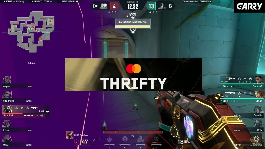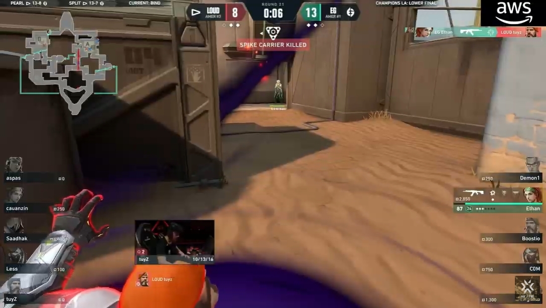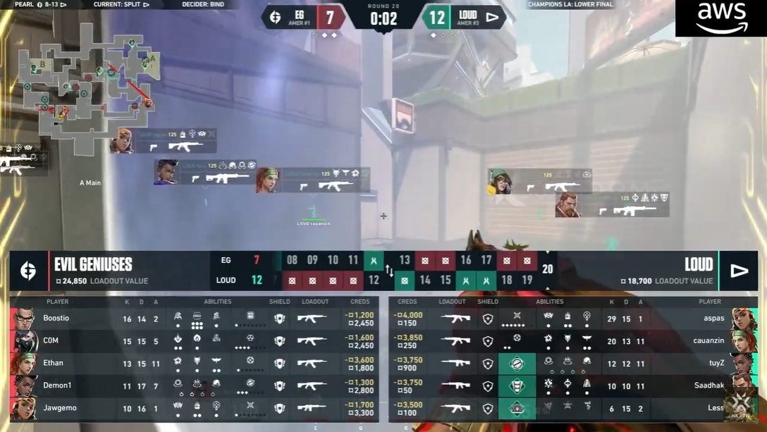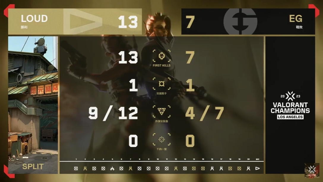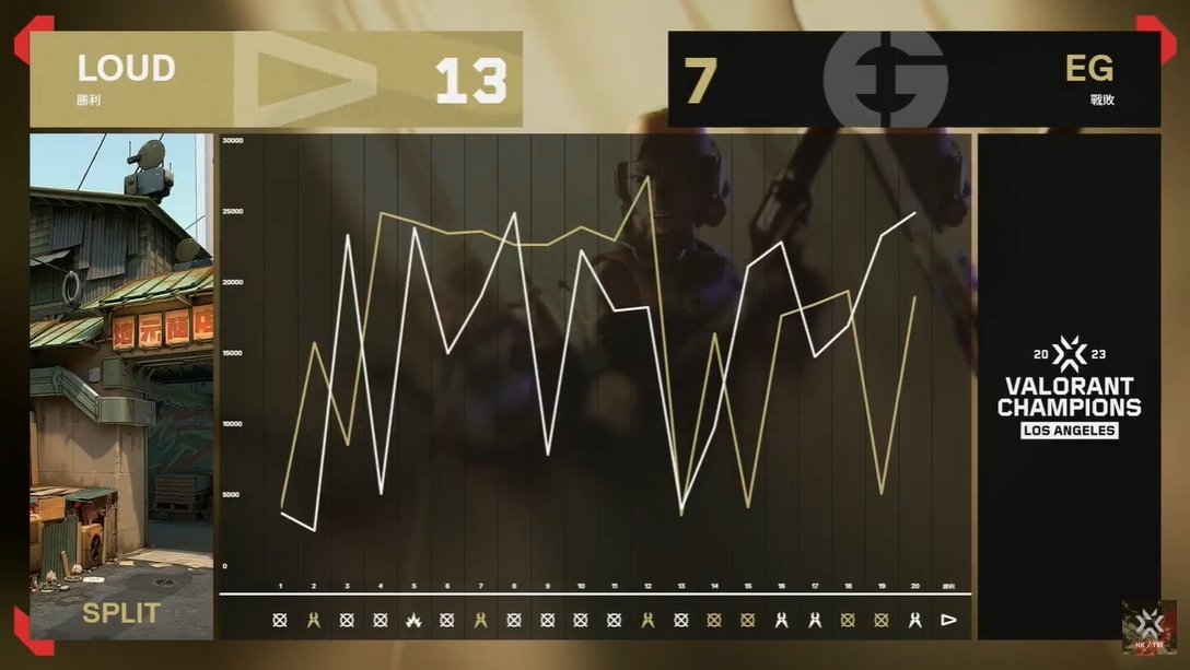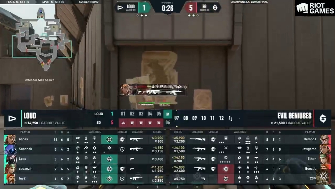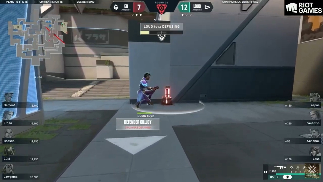 第五場比賽地圖為「劫境之地」,LOUD 選擇先守。開局雙方就激烈交手,EG 率先拿下第一分,接著更一鼓作氣打出 5:0 開局優勢,但第六局雙方直接碰頭,LOUD 迅速殲滅對手、止血。接下來幾局的節奏都很快速,LOUD 努力追分,但 EG 也沒有亂了腳步,仍穩穩維持比分差距。驚險 12 局,EG Bosito 接連擊殺對手後設置炸彈,但 LOUD Less 以一打二收下這場殘局,化解危機,以 5:7 縮減雙方差距。