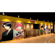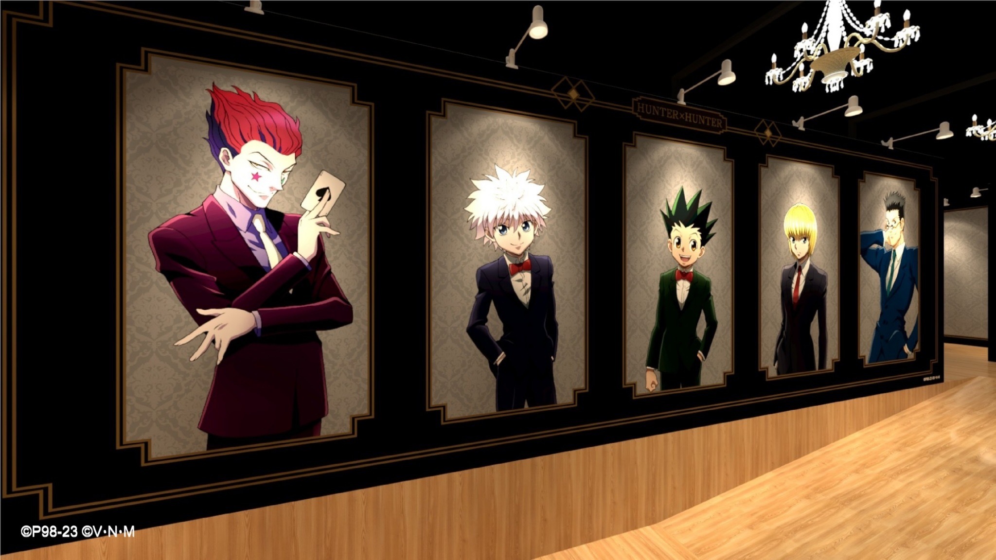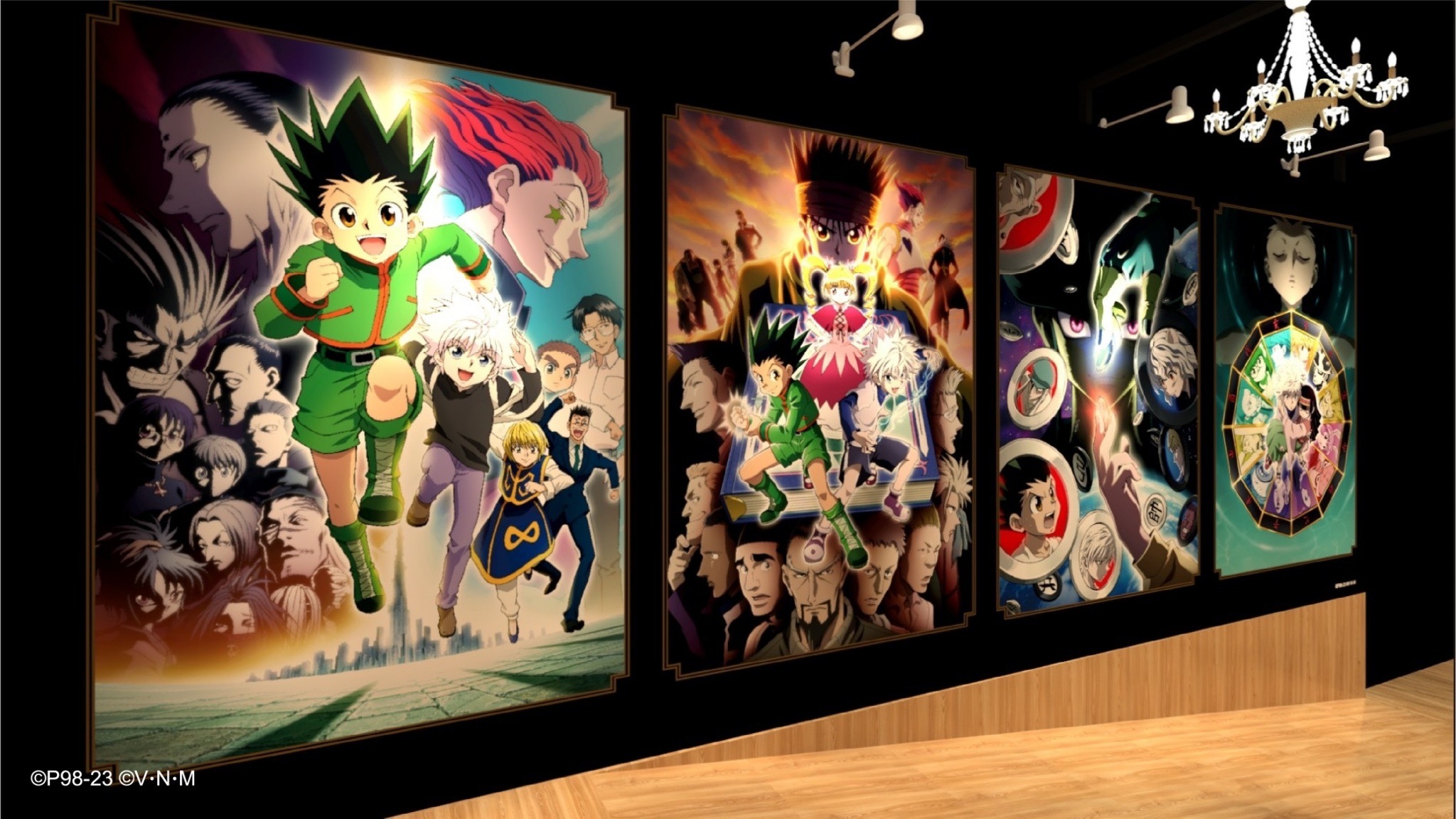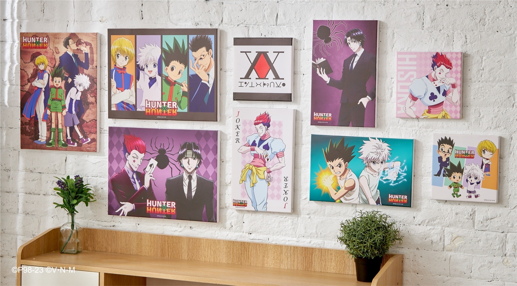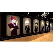 一進入「HUNTER×HUNTER 獵人快閃店」就可以看到幻影旅團篇、貪婪之島篇、嵌合蟻篇及會長選舉篇等篇章的「動畫主視覺牆」。接著還有主角群為了前往拍賣會而穿上西裝的「拍賣會造型區」,以及小傑與奇犽施展念能力場景的「念能力牆」。走進店內的櫃台左側有著庫洛洛、西索,右側有著小傑、奇犽、酷拉皮卡及雷歐力四位主角的「主角群打卡牆」。展場內也散佈了小傑、奇犽、酷拉皮卡、雷歐力及西索等五個「角色立牌」。