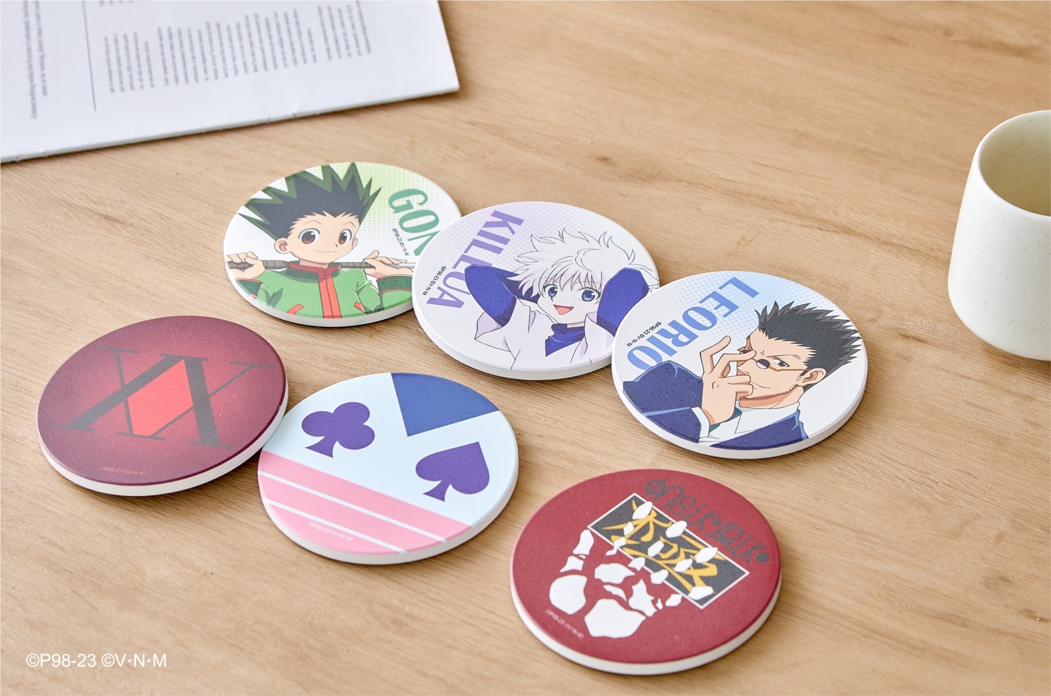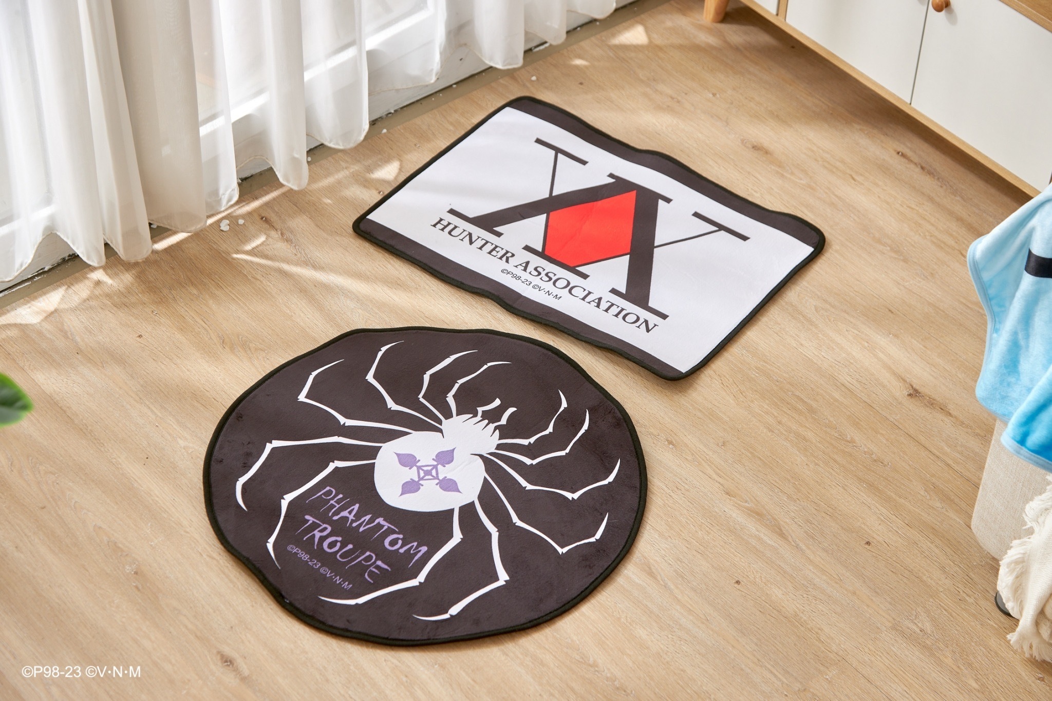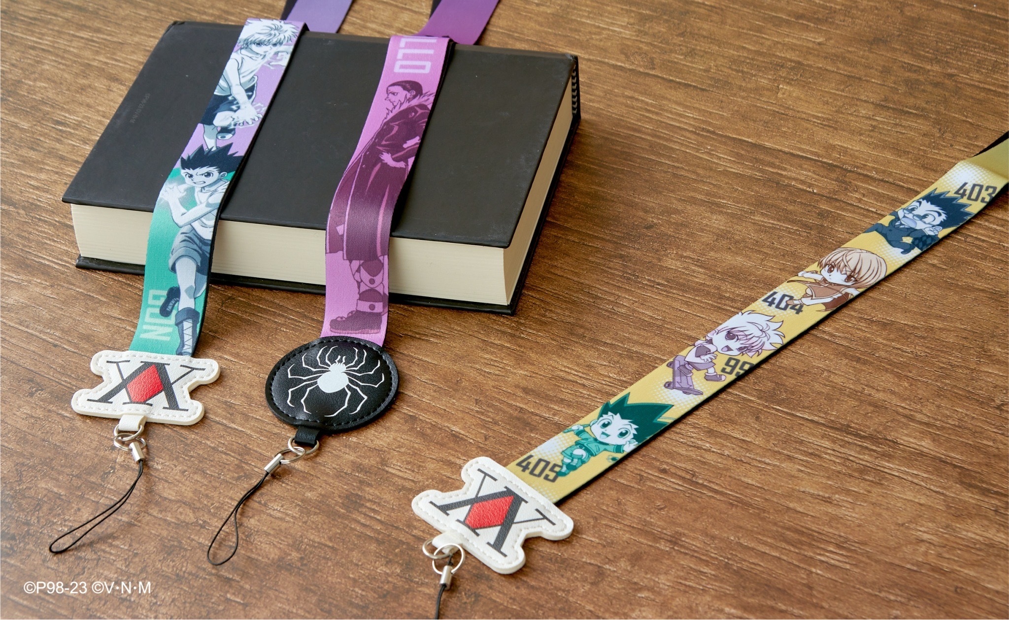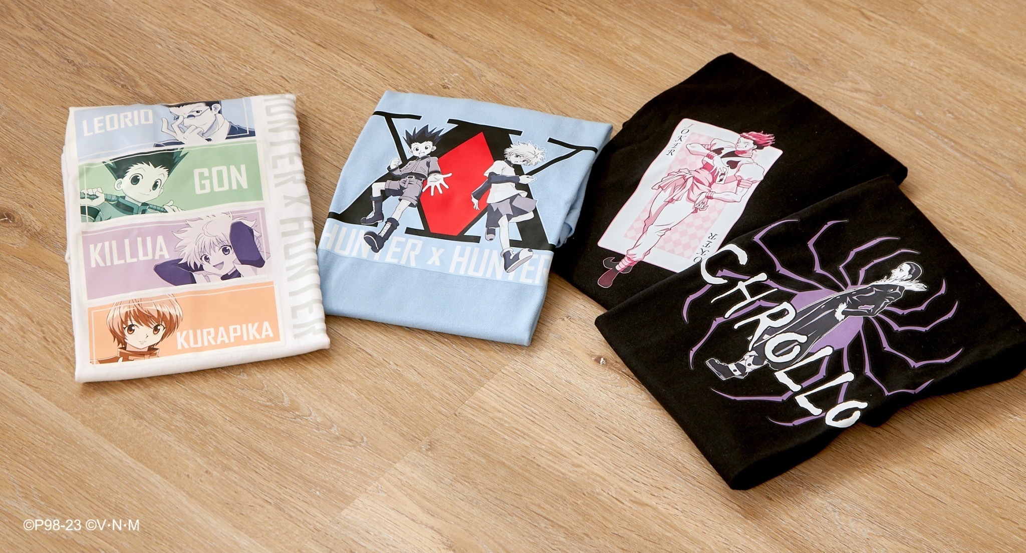 本次推出的周邊商品部分,有小傑與奇犽私服掛軸、西索與庫洛洛西裝等多款尺寸圖樣無框畫、六種款式吸水杯墊、四位主角立牌、四款滑鼠墊、四款角色造型鑰匙圈、四款角色Q版抱枕、獵人執照與撲克牌造型擴香石、幻影旅團及獵人協會款式地墊、三款造型門簾、空調毯、擦手巾、車用套組、造型夾、長吊繩、識別套、文件夾、側背包、Airpods 保護套等各式各樣的內容,提供給大家參考。