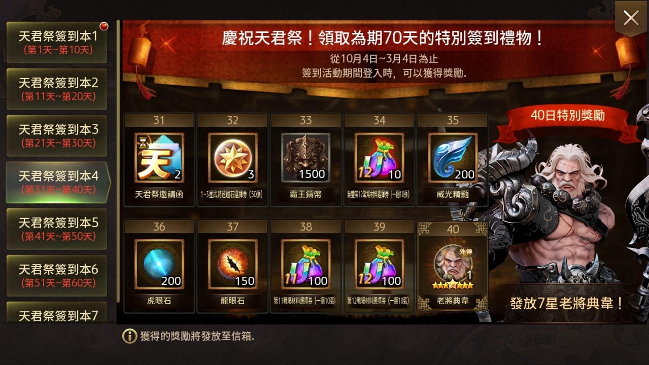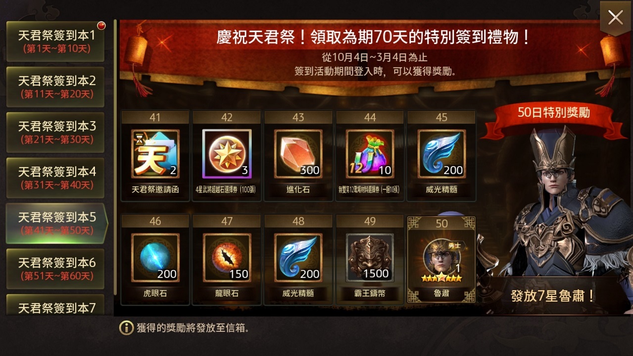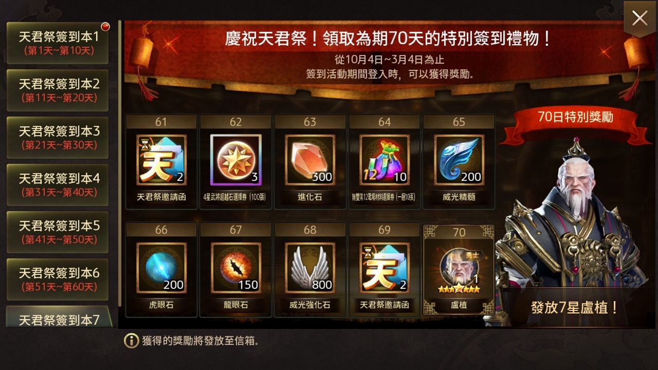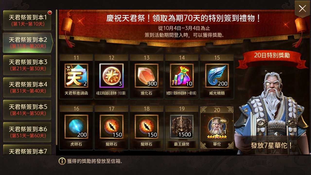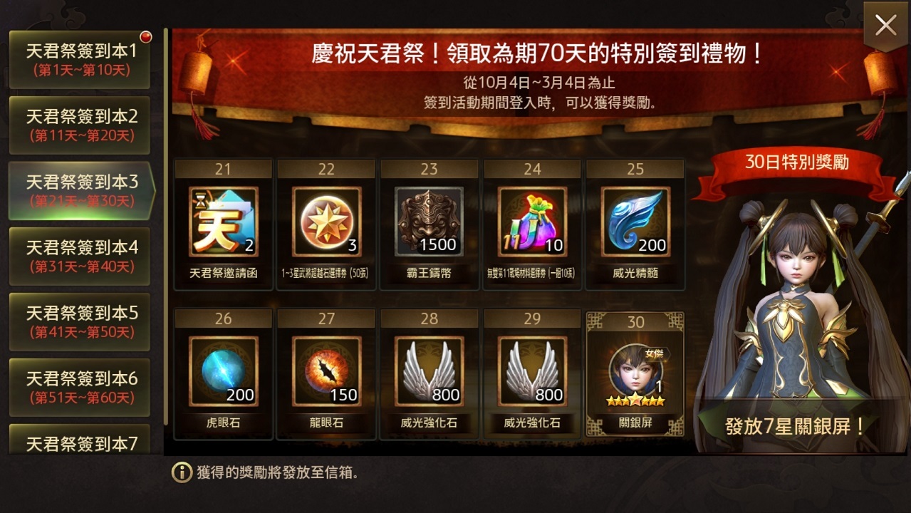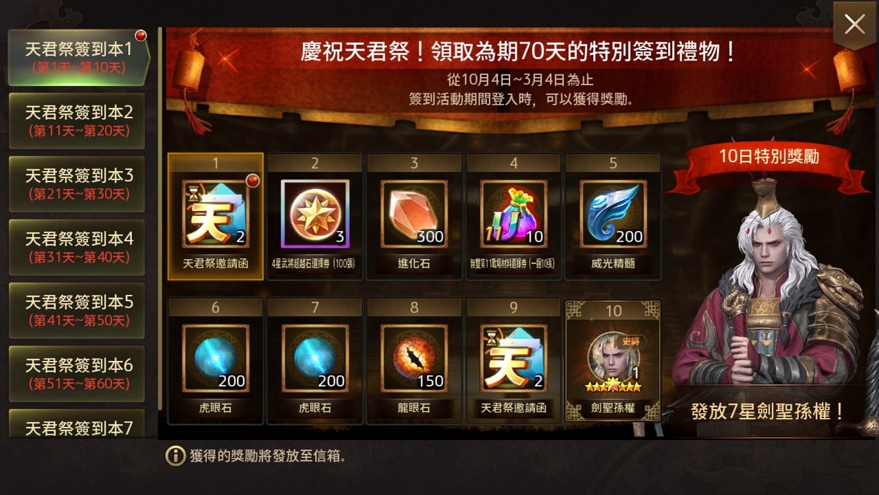除此之外,首次復刻的主公專屬慶典「天君祭紀念活動」將進行長達七十天的簽到活動,且玩家還可獲得「天君祭邀請函」