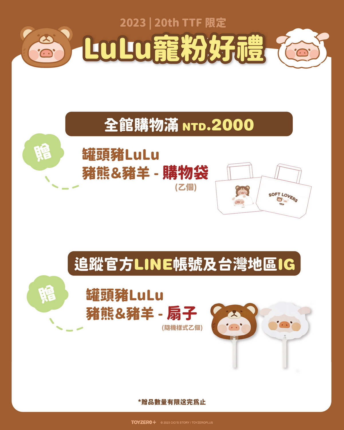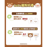 凡於活動期間不限金額消費,加入官方LINE好友及追蹤官方Instagram即贈限量「罐頭豬LuLu豬熊&豬羊涼扇」乙個(隨機樣式)。消費滿NTD2,000:贈送「罐頭豬LuLu豬熊&豬羊療癒購物袋」乙個。