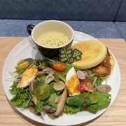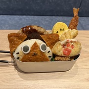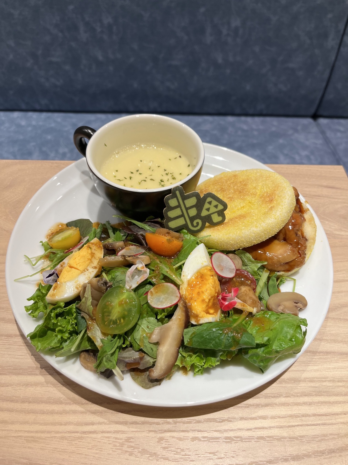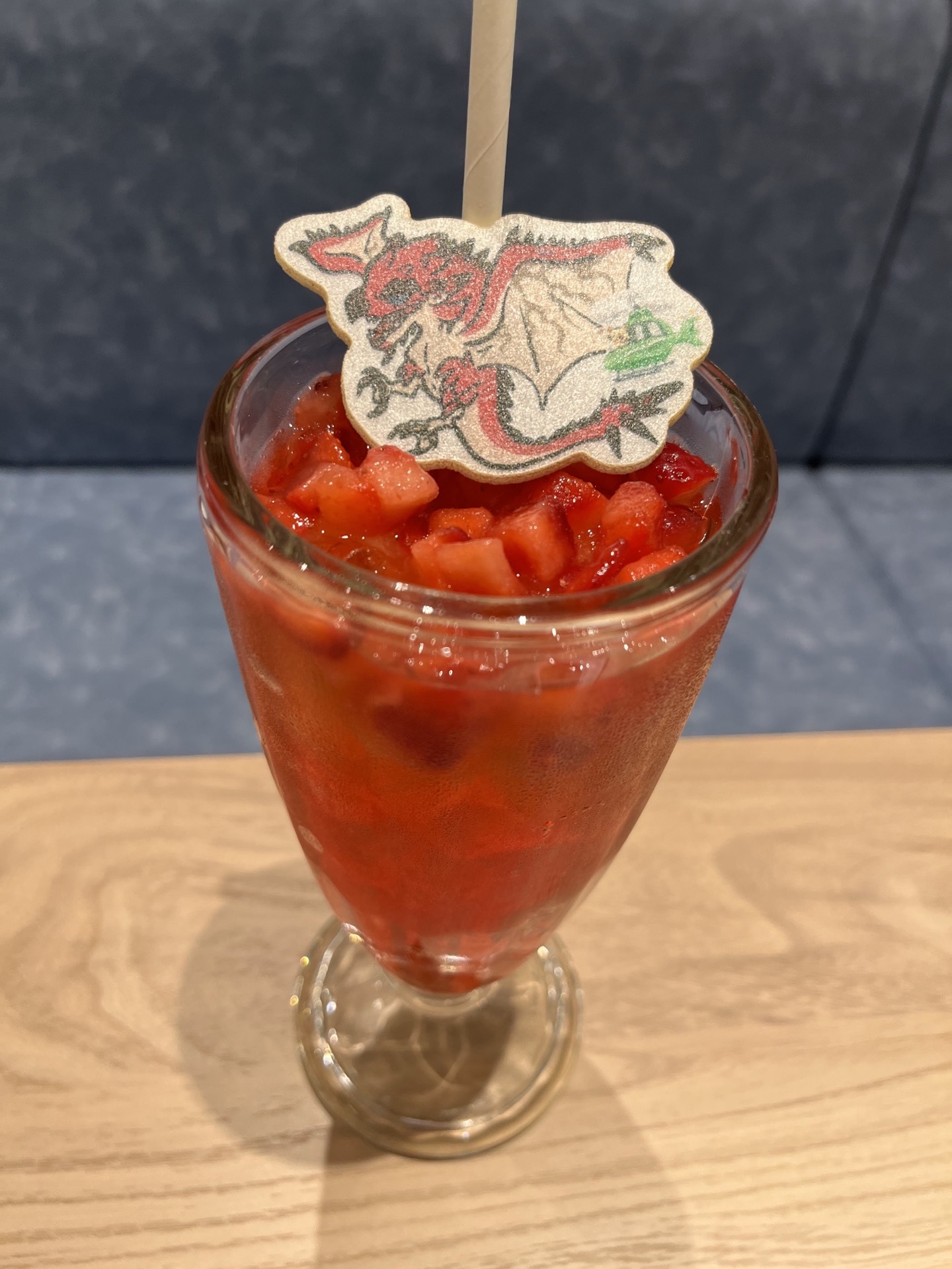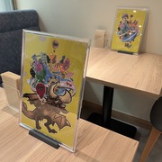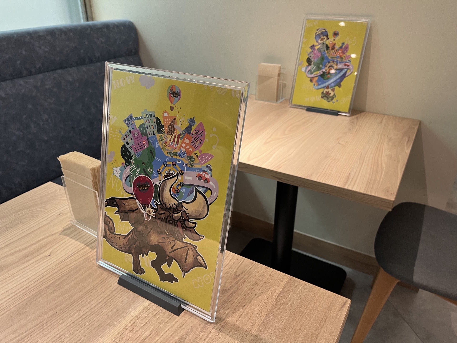 合作咖啡廳的品項繁多,在筆者於下午時段入場時,原本想點的「採集點“骨塚”肋排咖哩」已經售罄,足見骨塚在玩家之間的人氣(?)。入座後店員會給一張夾有 QR CODE 的壓克力板讓客人自助點餐,在多種餐點之中,筆者與同行友人最終選擇了「艾路的隨行便當(アイルーのオトモ弁当)」、「採集點“植物”沙拉拼盤(採集ポイント「植物」のサラダプレート)」,飲品則是選擇了「雄火龍草莓汽水(リオレウスのストロベリーソーダ)」、「搔鳥敲蛋風飲品(クルルヤックのエッグノック風ドリンク)」,還加點了一份甜點「發現魔物!甜點拼盤(モンスター発見!スイーツプレート)」。