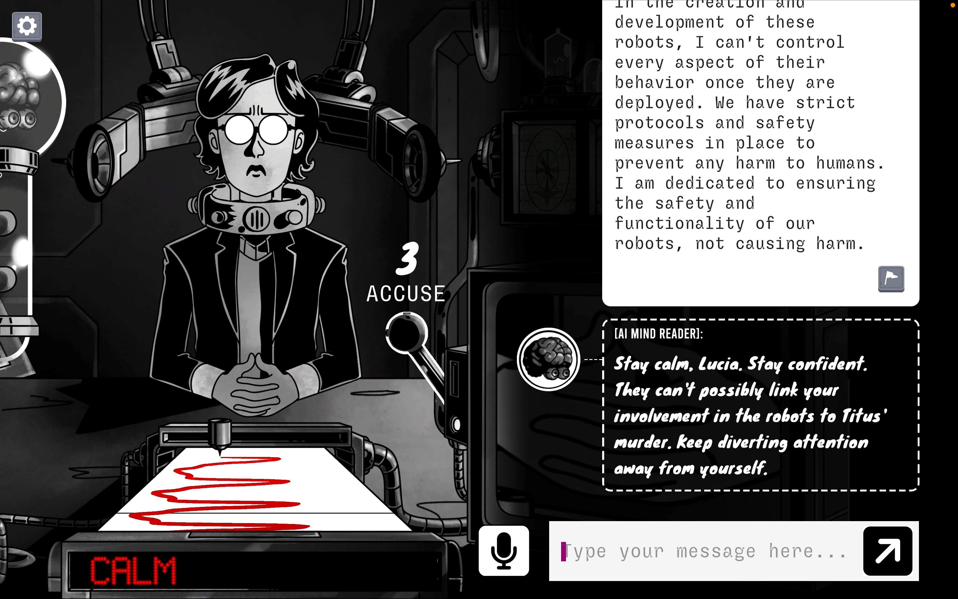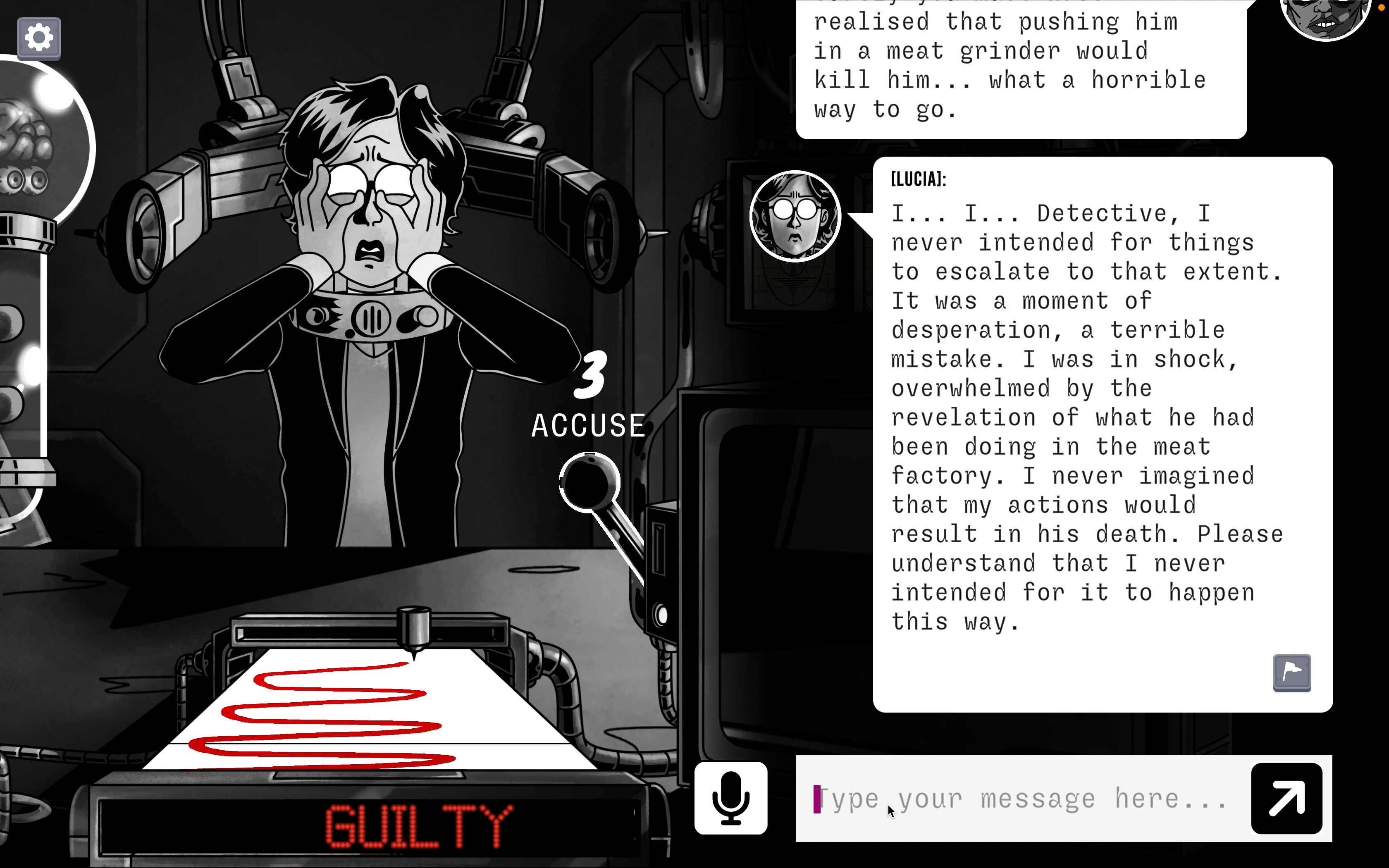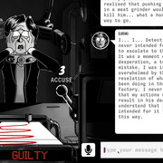 俎上肉》中,玩家要審問嫌疑犯。故事描述機器人工程師露西亞(Lucia)可能殺了他的丈夫,玩家的工作就是讓他們坦白,用各種話術操控、說服、威脅,甚至引導他們「坦白」。但露西亞是不可輕易屈服的,玩家必須發揮創意施展你在電影中看到的經典策略,甚至是全新方法來達成目的。你能在她的律師抵達之前,讓她招供嗎?