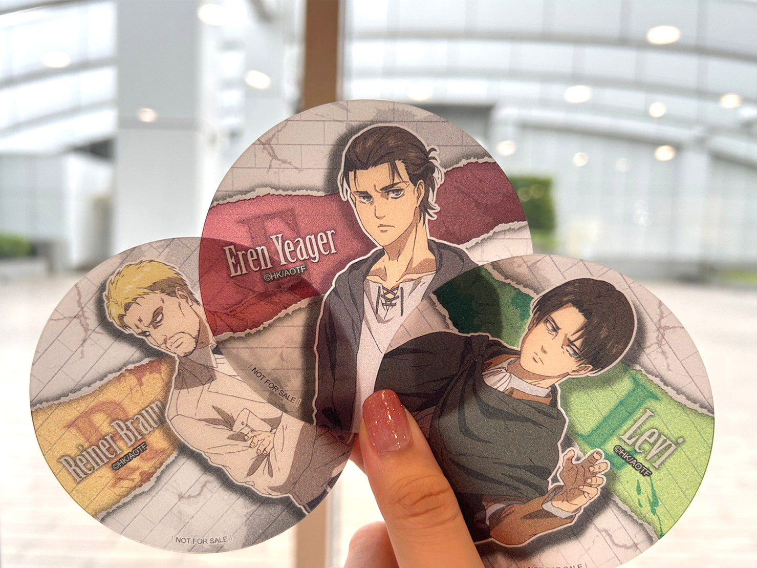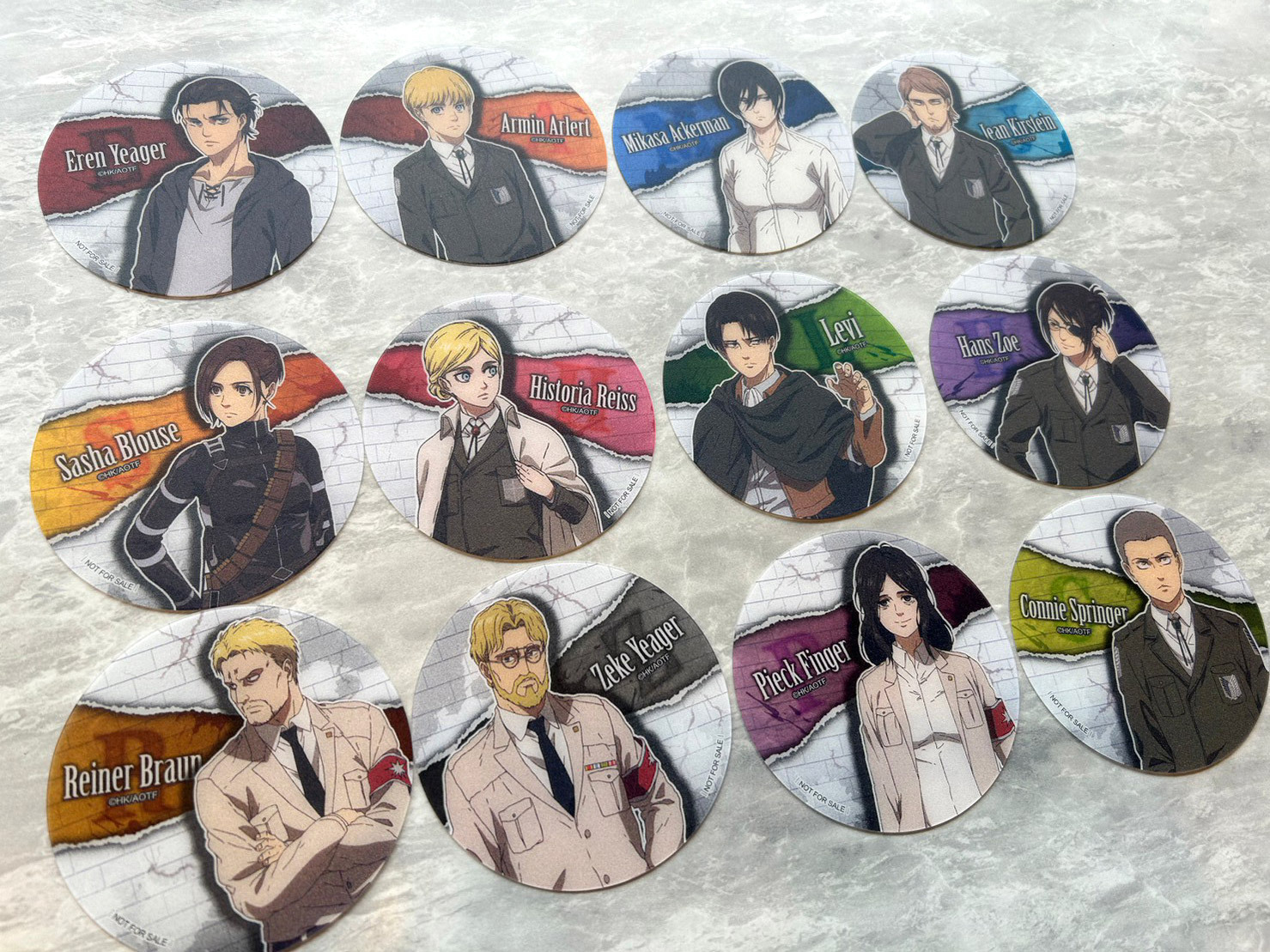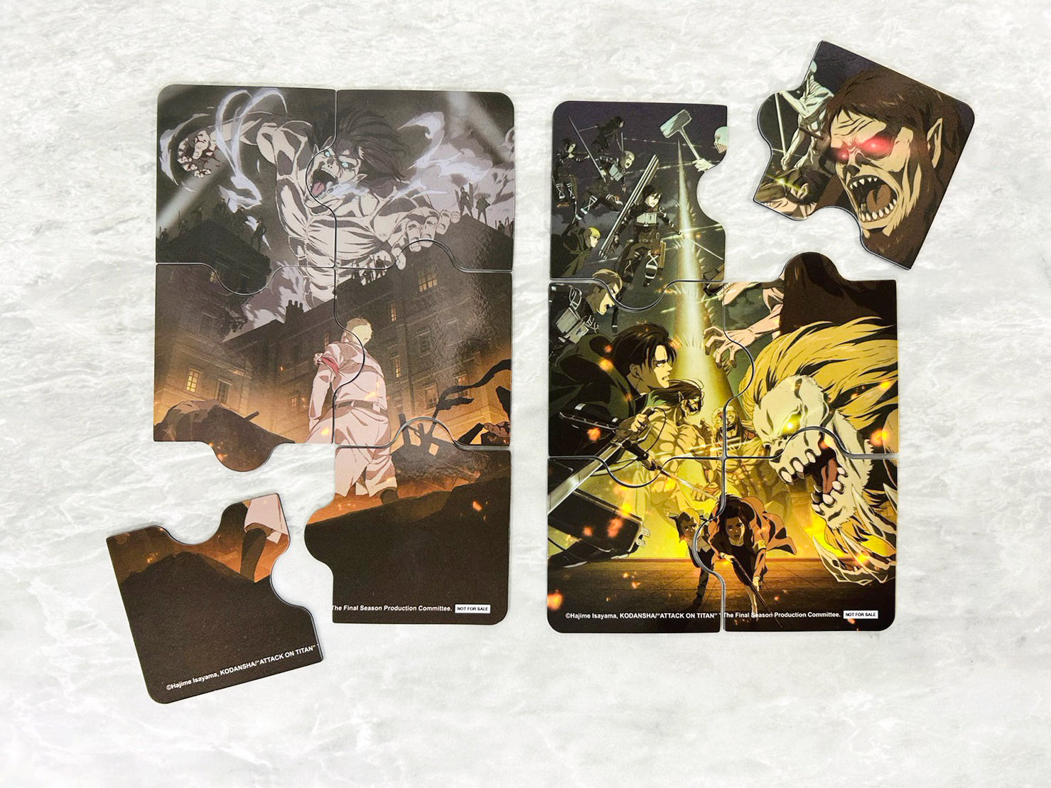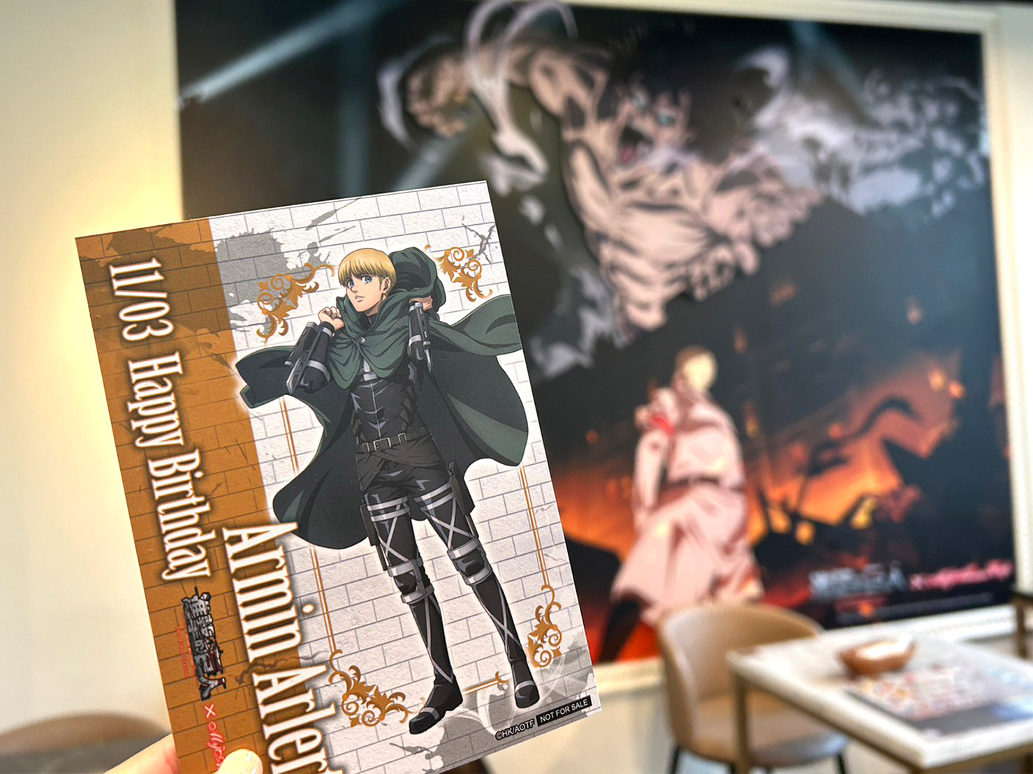 進擊的巨人》動畫主題 Café 活動時間當日單筆消費餐飲或商品滿 600 元,均可獲得特製滿額禮拼圖磁鐵。分為前後期贈送,每款 6 圖隨機,收集完成即可拼出震撼人心的視覺圖,兼具實用性以及收藏性。此外,為歡慶 11 月壽星阿爾敏生日,11/1~11/5 凡點阿爾敏甜點或飲料(不分內用或外帶),即可獲贈生日賀卡一張。