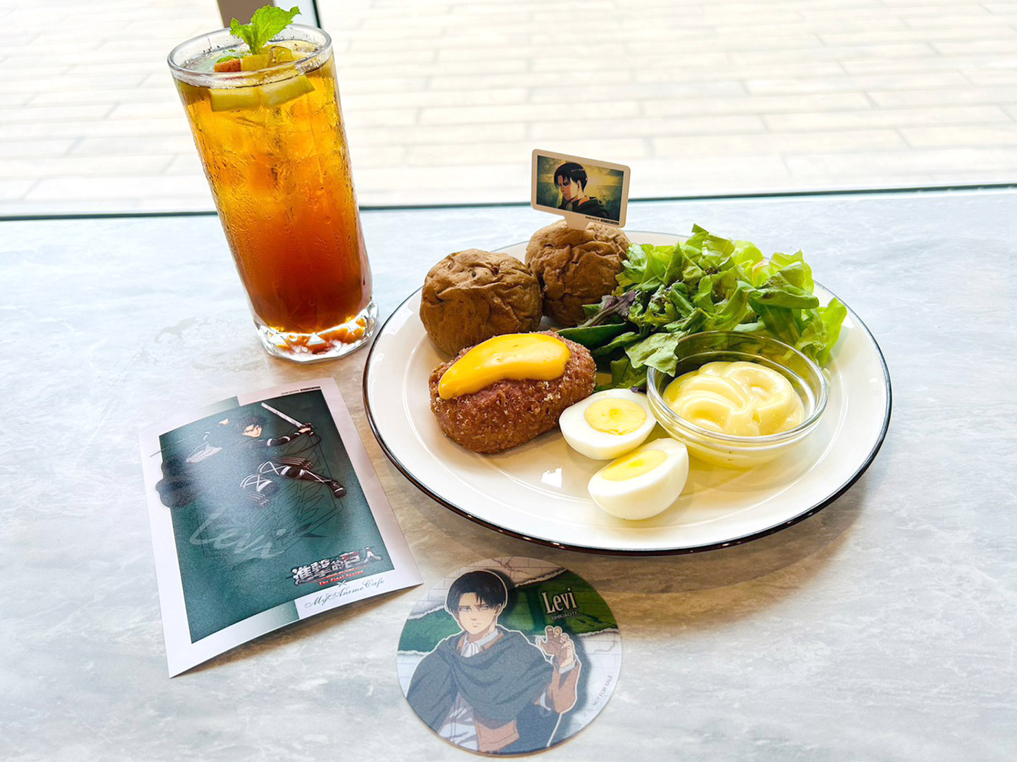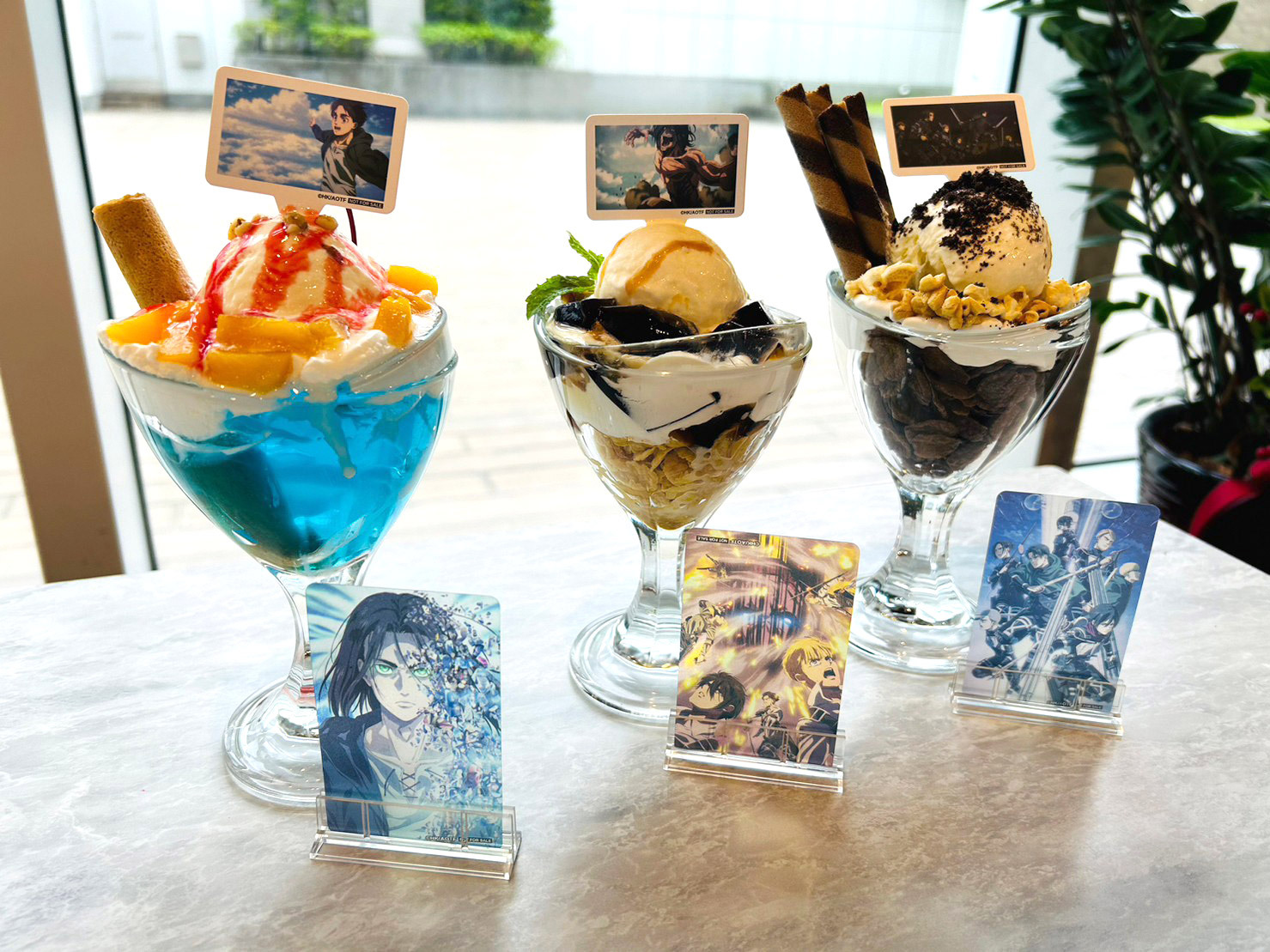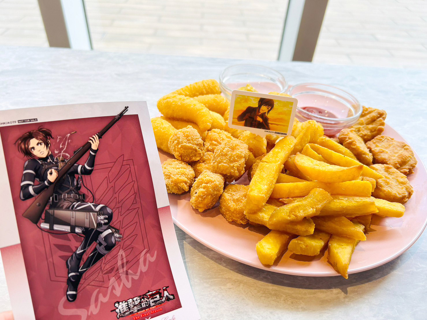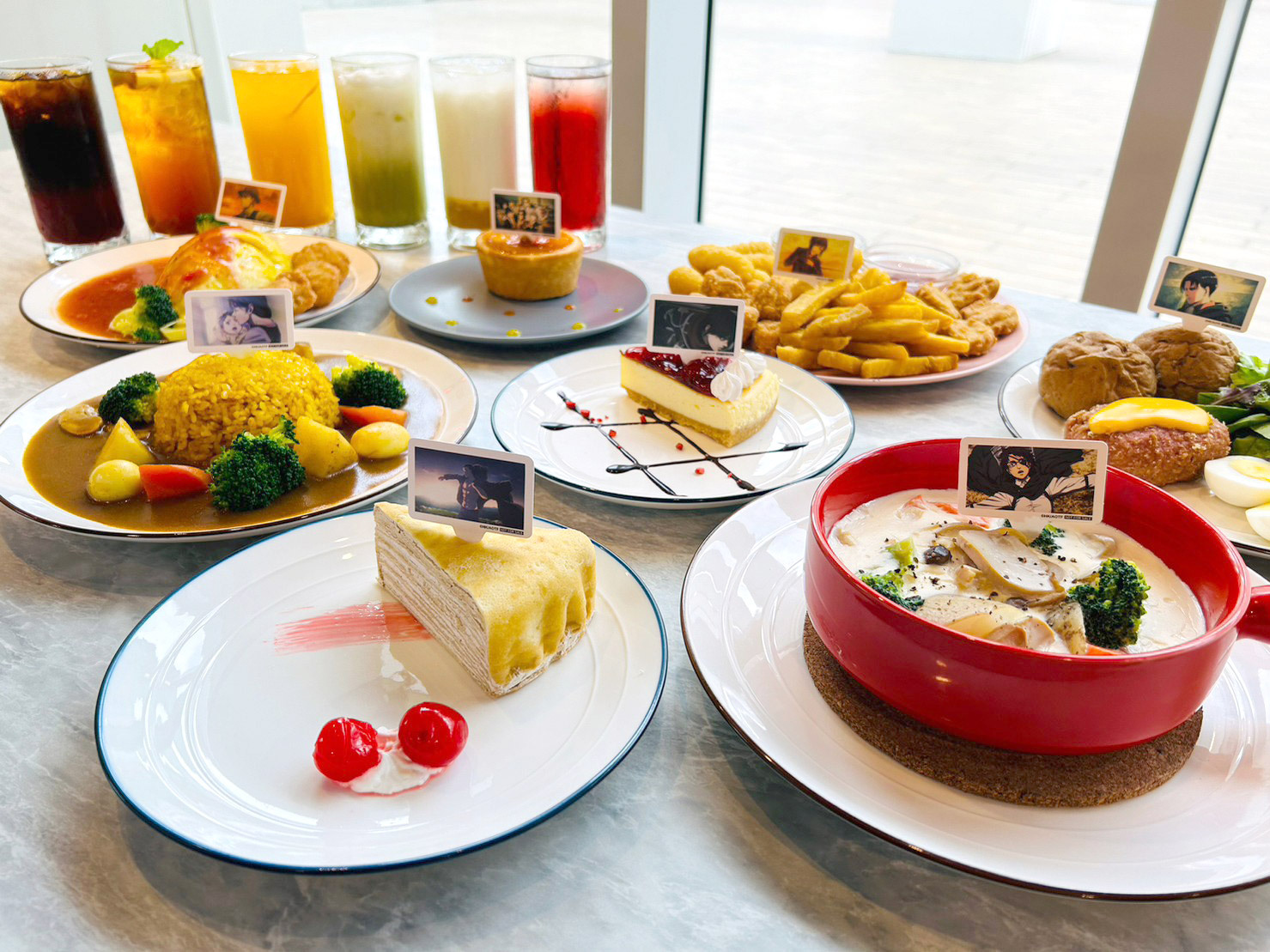 進擊的巨人》動畫主題 Café 推出主要角色專屬餐點,包含主要角色艾連、里維、米卡莎、阿爾敏、萊納等人的特製餐點,例如講到莎夏就能聯想到的炸薯拼盤、約翰從小就愛吃的蛋包飯、漢吉為大家在野外料理的燉菜等等,此外,還有以作品情境為概念的聖代,以及 12 名角色專屬飲品,更在主餐、甜點、聖代都加上充滿回憶的精選劇照插卡。活動期間點餐即贈精美特典,包含點主餐送寫真卡、點甜點送 Q 版角色小卡、點聖代送 PP 紀念卡、點飲料送 PP 杯墊,全數均為對應贈送無隨機。