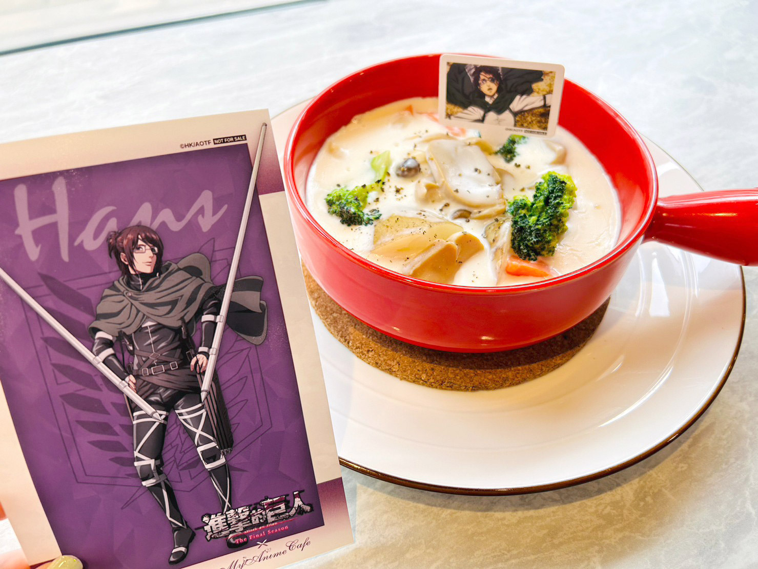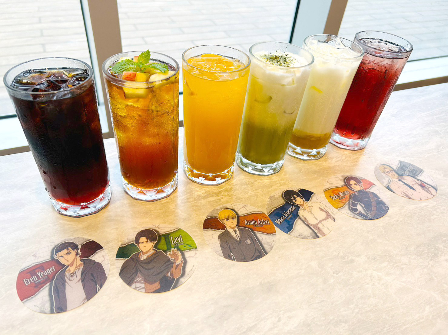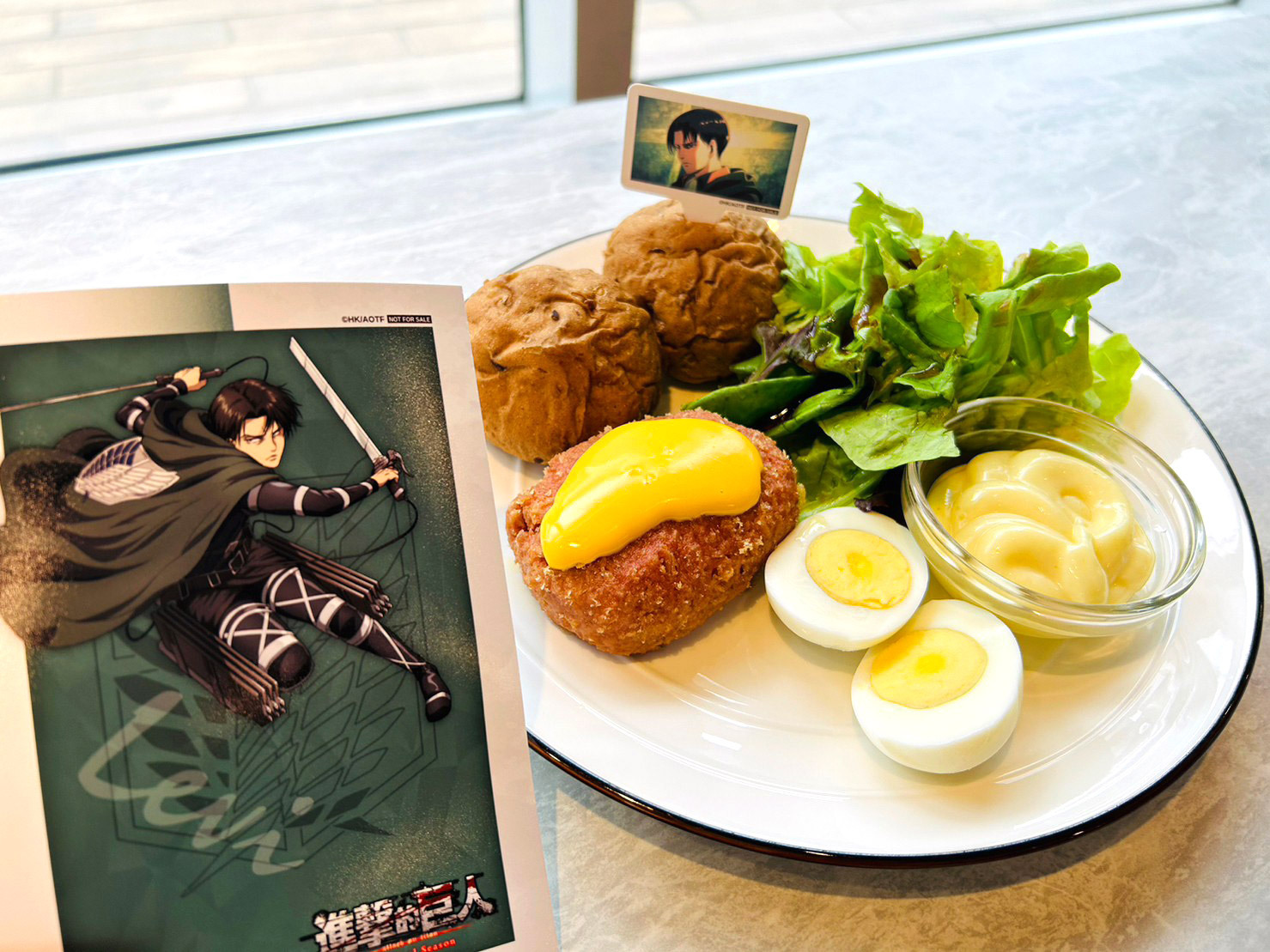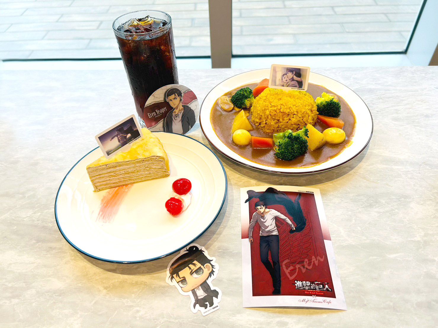進擊的巨人》動畫主題 Café 推出主要角色專屬餐點,包含主要角色艾連、里維、米卡莎、阿爾敏、萊納等人的特製餐點,例如講到莎夏就能聯想到的炸薯拼盤、約翰從小就愛吃的蛋包飯、漢吉為大家在野外料理的燉菜等等,此外,還有以作品情境為概念的聖代,以及 12 名角色專屬飲品,更在主餐、甜點、聖代都加上充滿回憶的精選劇照插卡。活動期間點餐即贈精美特典,包含點主餐送寫真卡、點甜點送 Q 版角色小卡、點聖代送 PP 紀念卡、點飲料送 PP 杯墊,全數均為對應贈送無隨機。