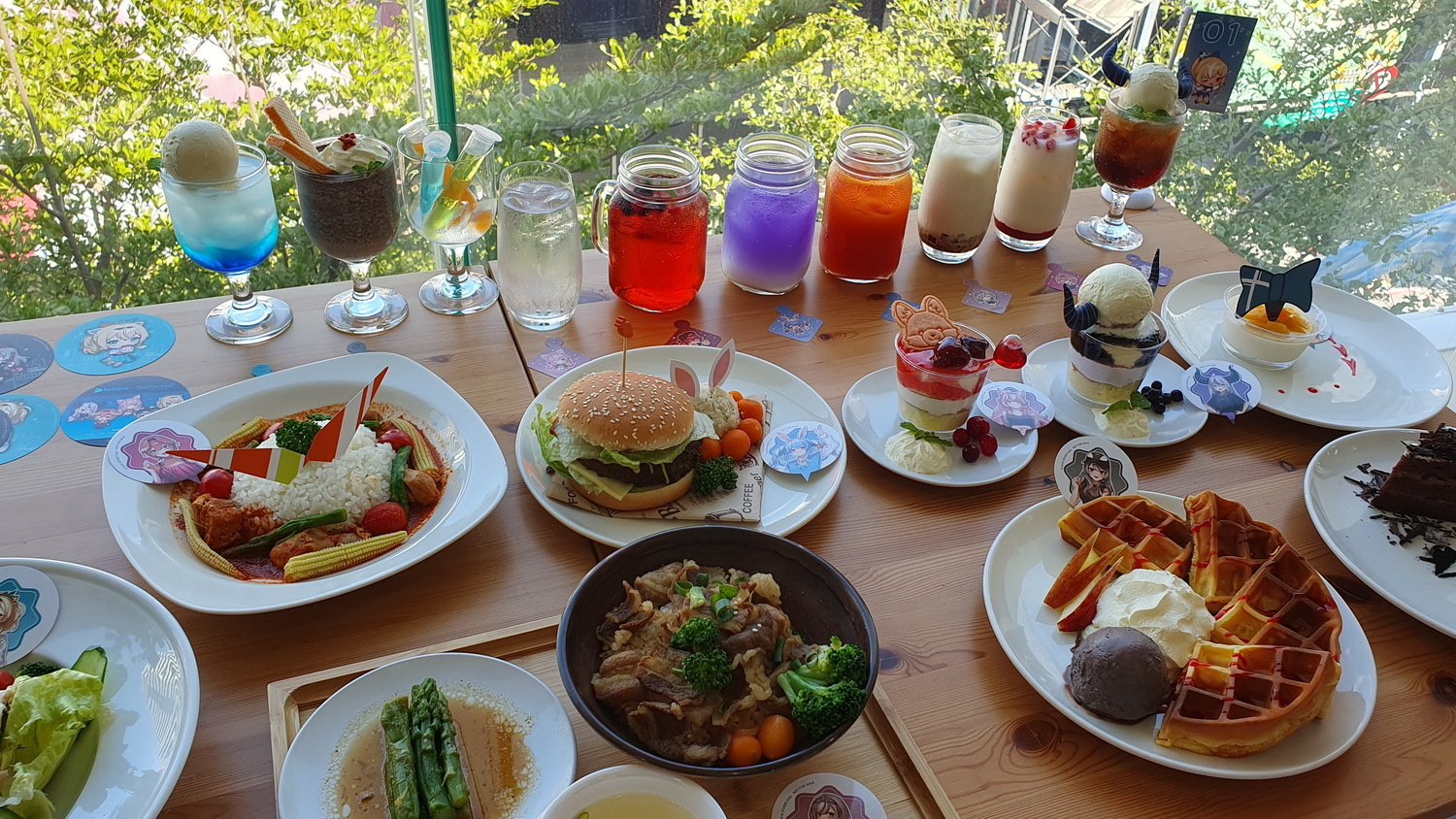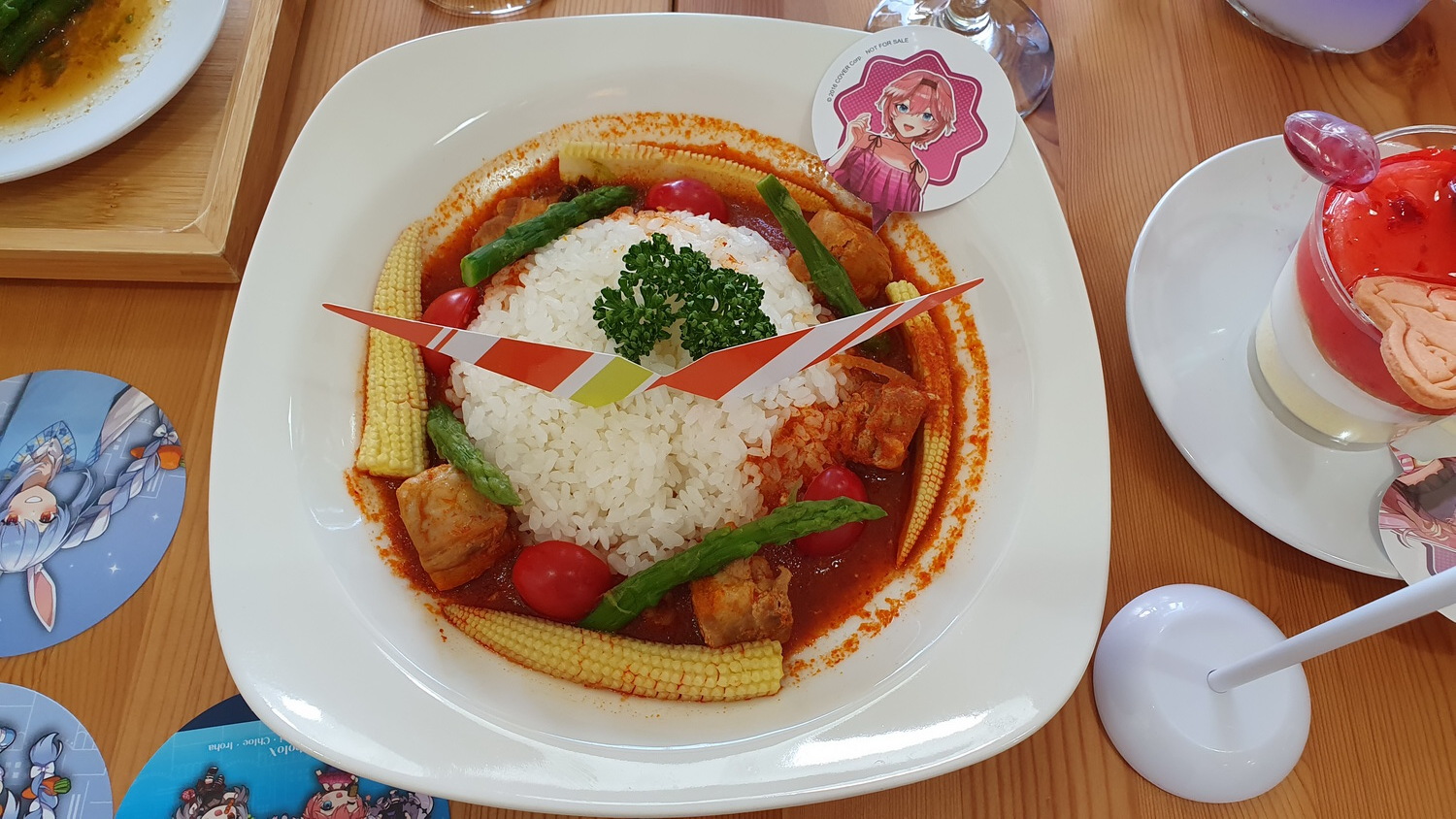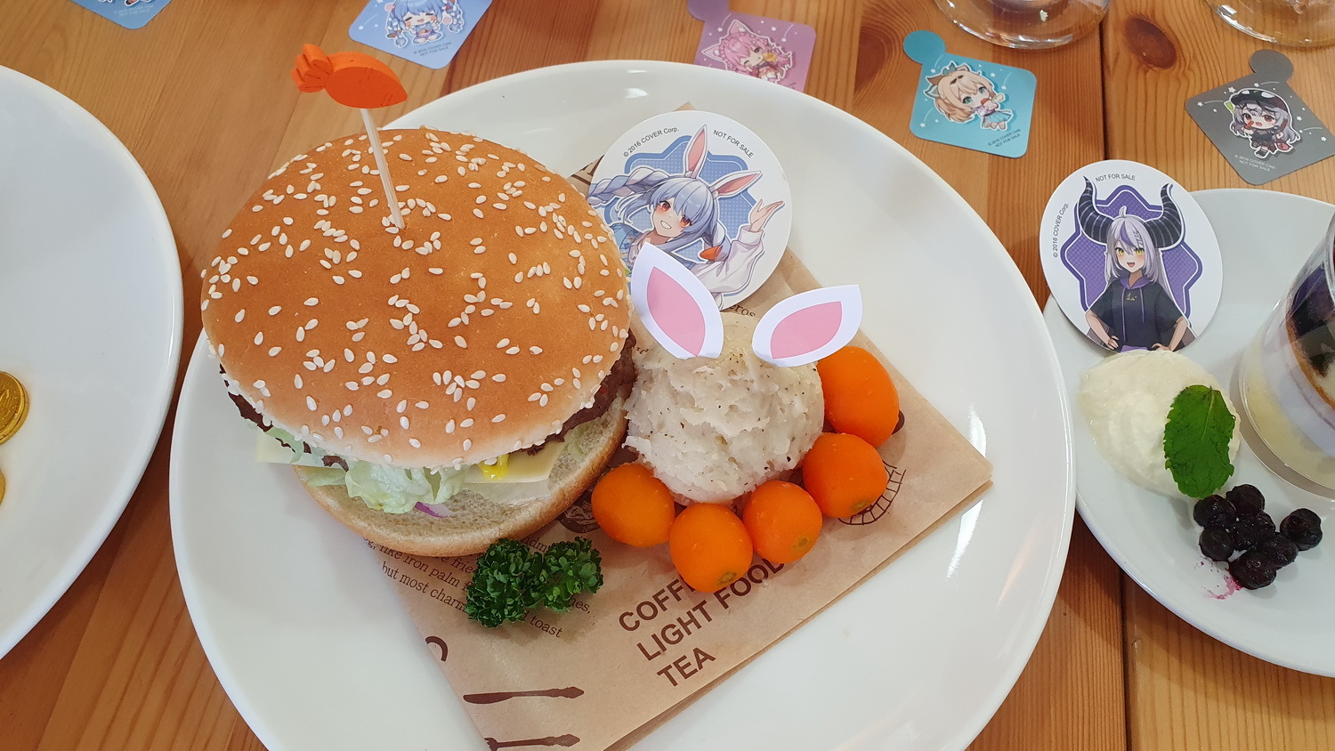 本次合作主餐,有以成員喜歡的食物發想的「兔兔族長的漢堡 Peko」、白銀諾艾爾的牛丼「力量的來源」,「琉依的留學回憶」泰式紅咖哩,及「伊呂波喜歡的食物沙拉」共四款。甜點則有寶鐘瑪琳的「寶藏就在這裡」黑森林蛋糕、立體還原拉普拉斯‧暗黑頭上的角「首先征服你的胃」藍莓蛋糕。