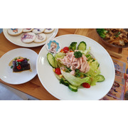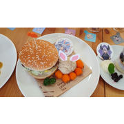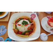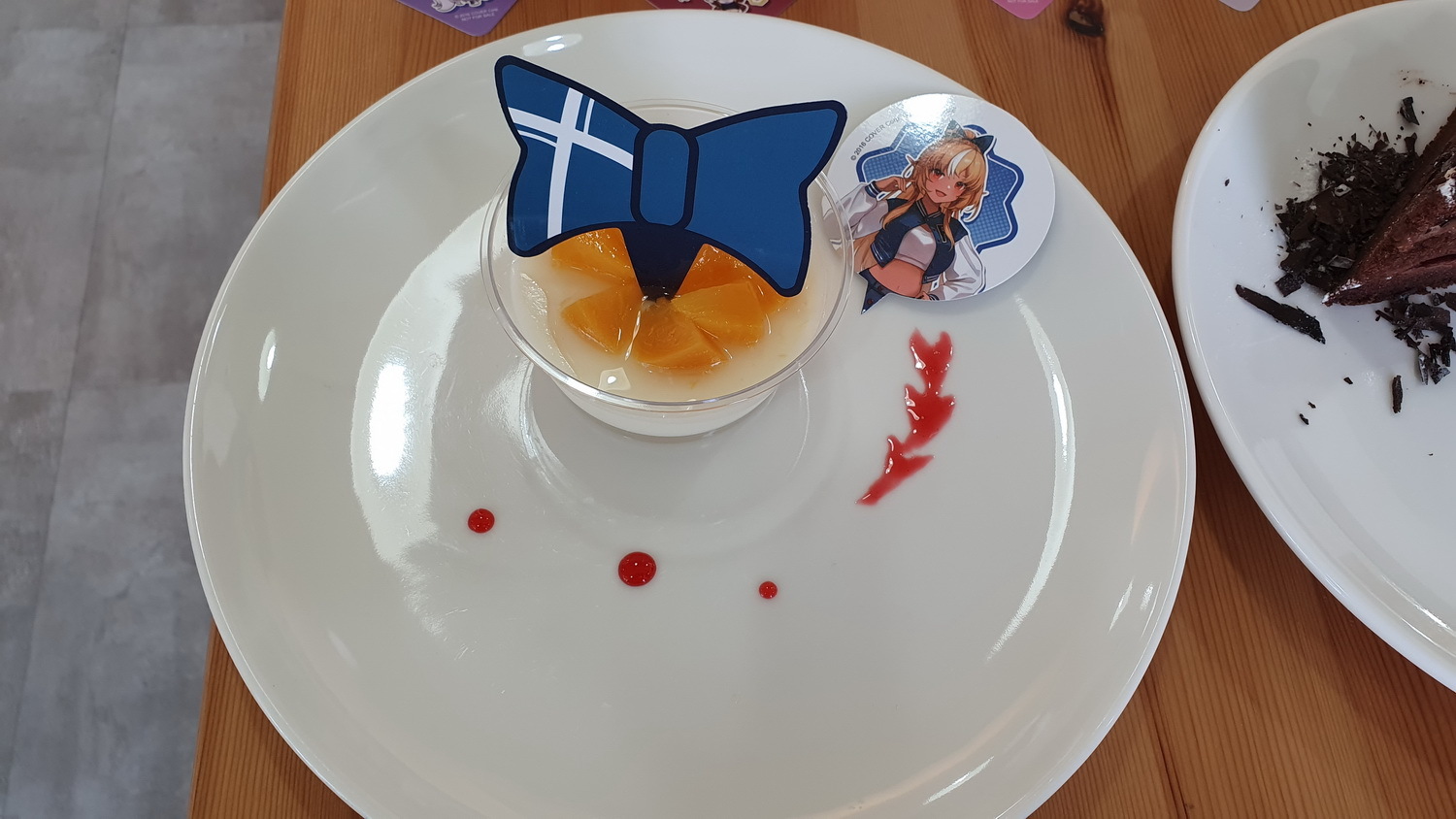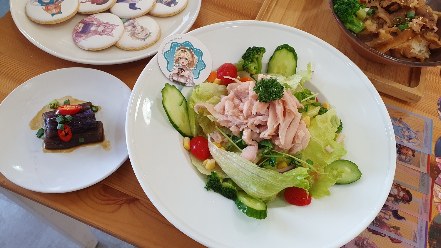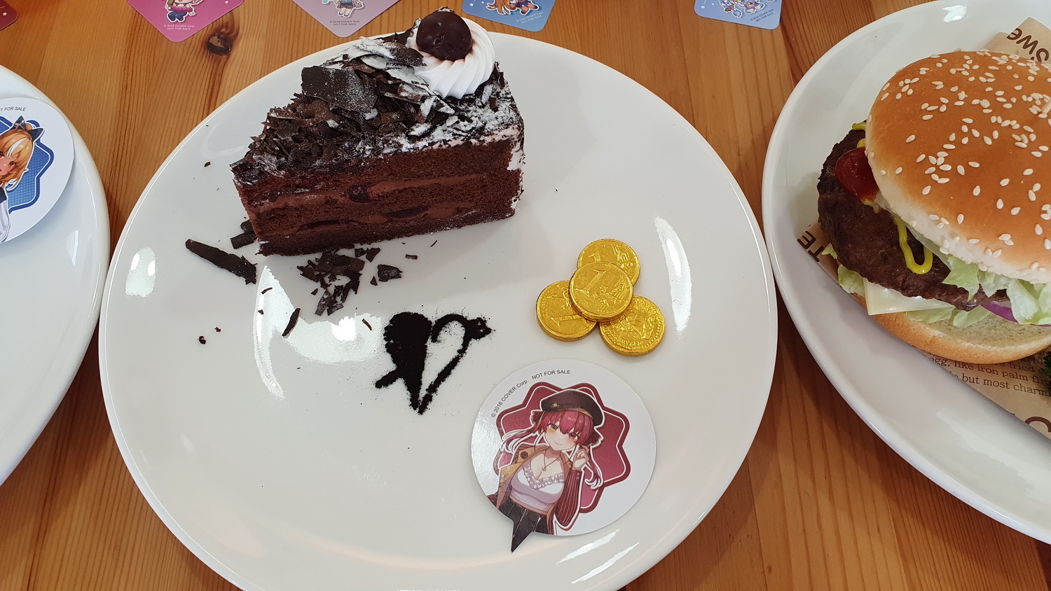 本次合作主餐,有以成員喜歡的食物發想的「兔兔族長的漢堡 Peko」、白銀諾艾爾的牛丼「力量的來源」,「琉依的留學回憶」泰式紅咖哩,及「伊呂波喜歡的食物沙拉」共四款。甜點則有寶鐘瑪琳的「寶藏就在這裡」黑森林蛋糕、立體還原拉普拉斯‧暗黑頭上的角「首先征服你的胃」藍莓蛋糕。