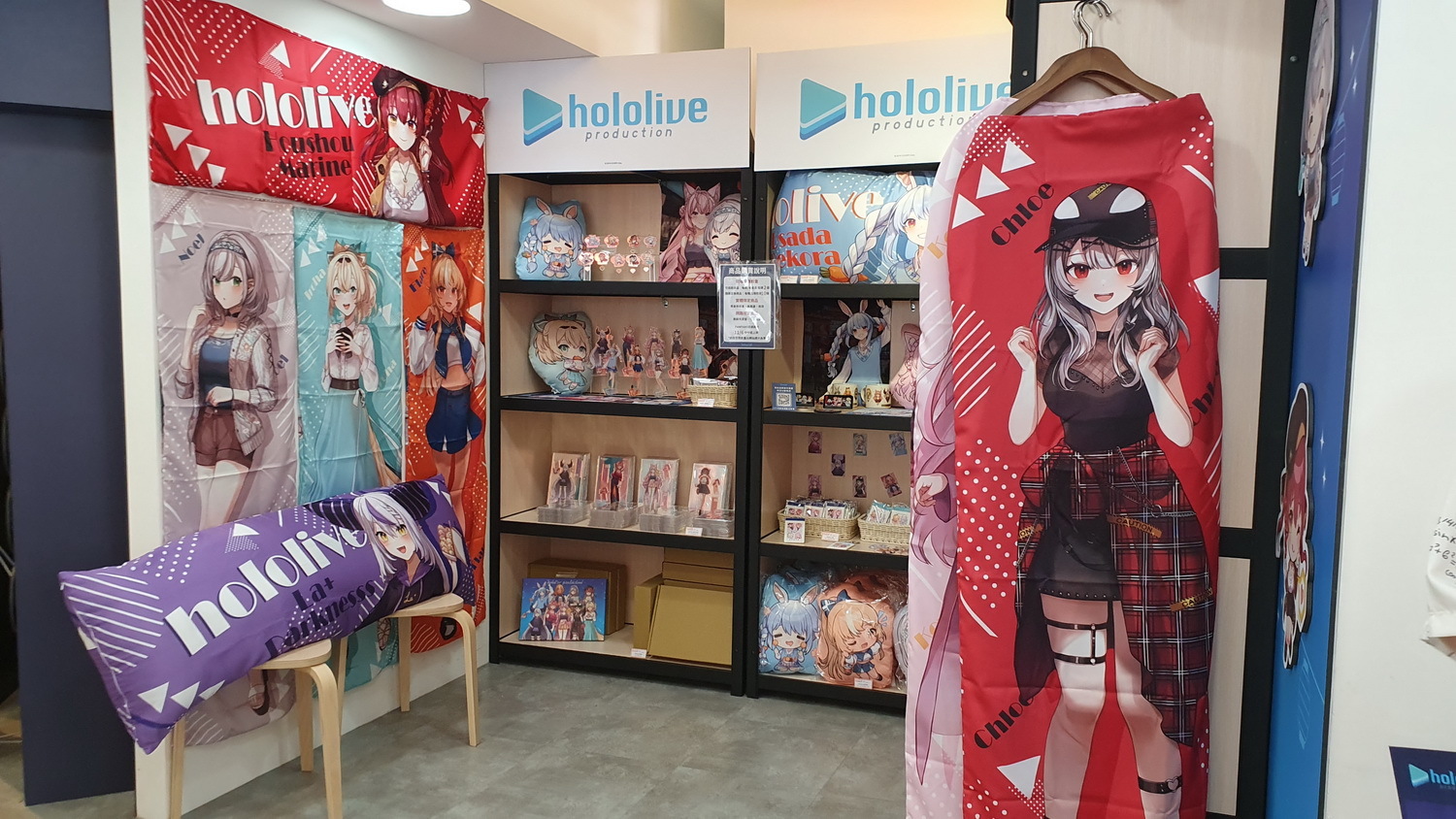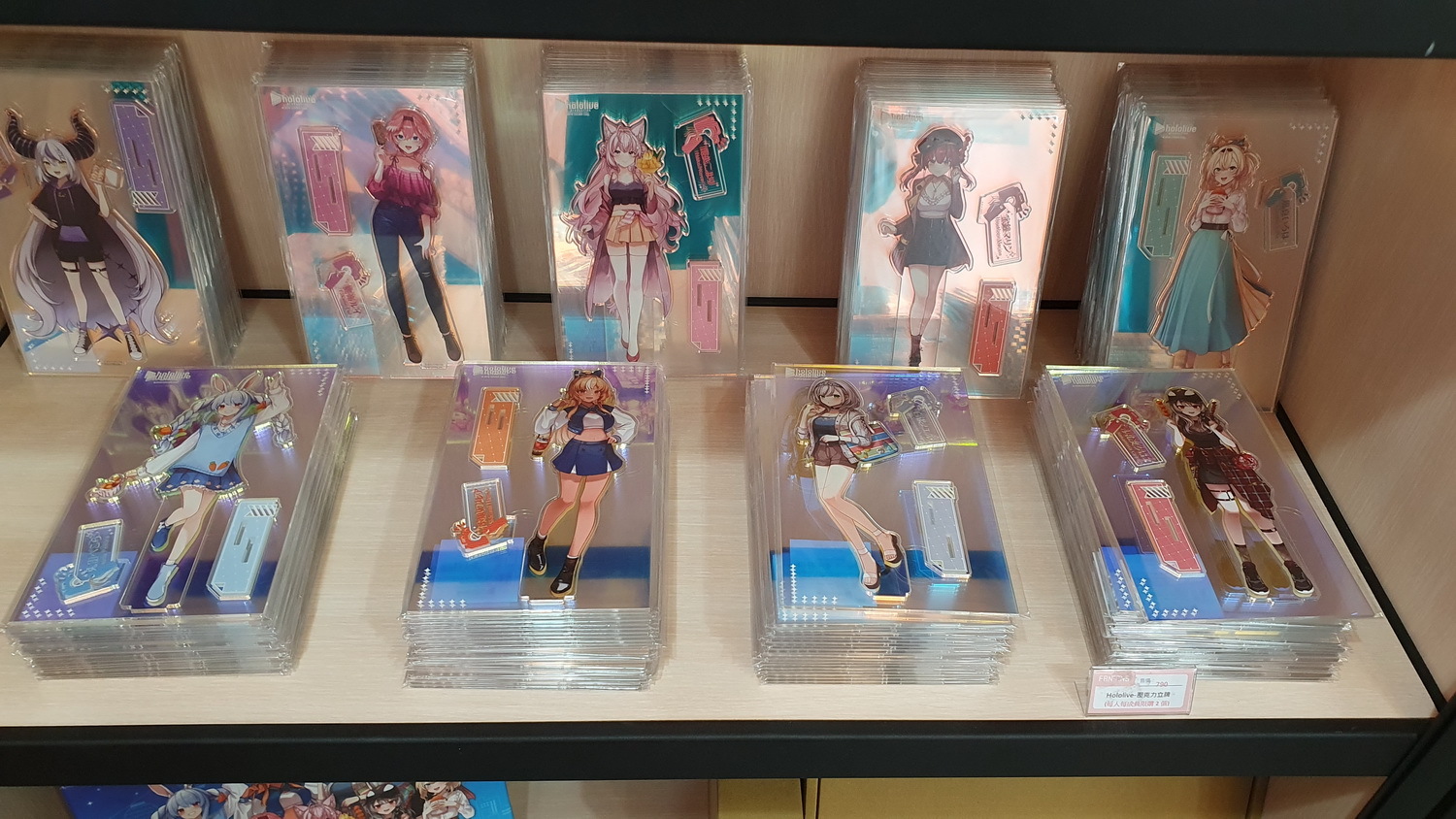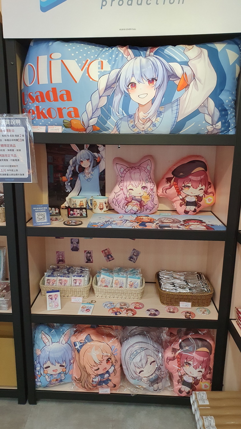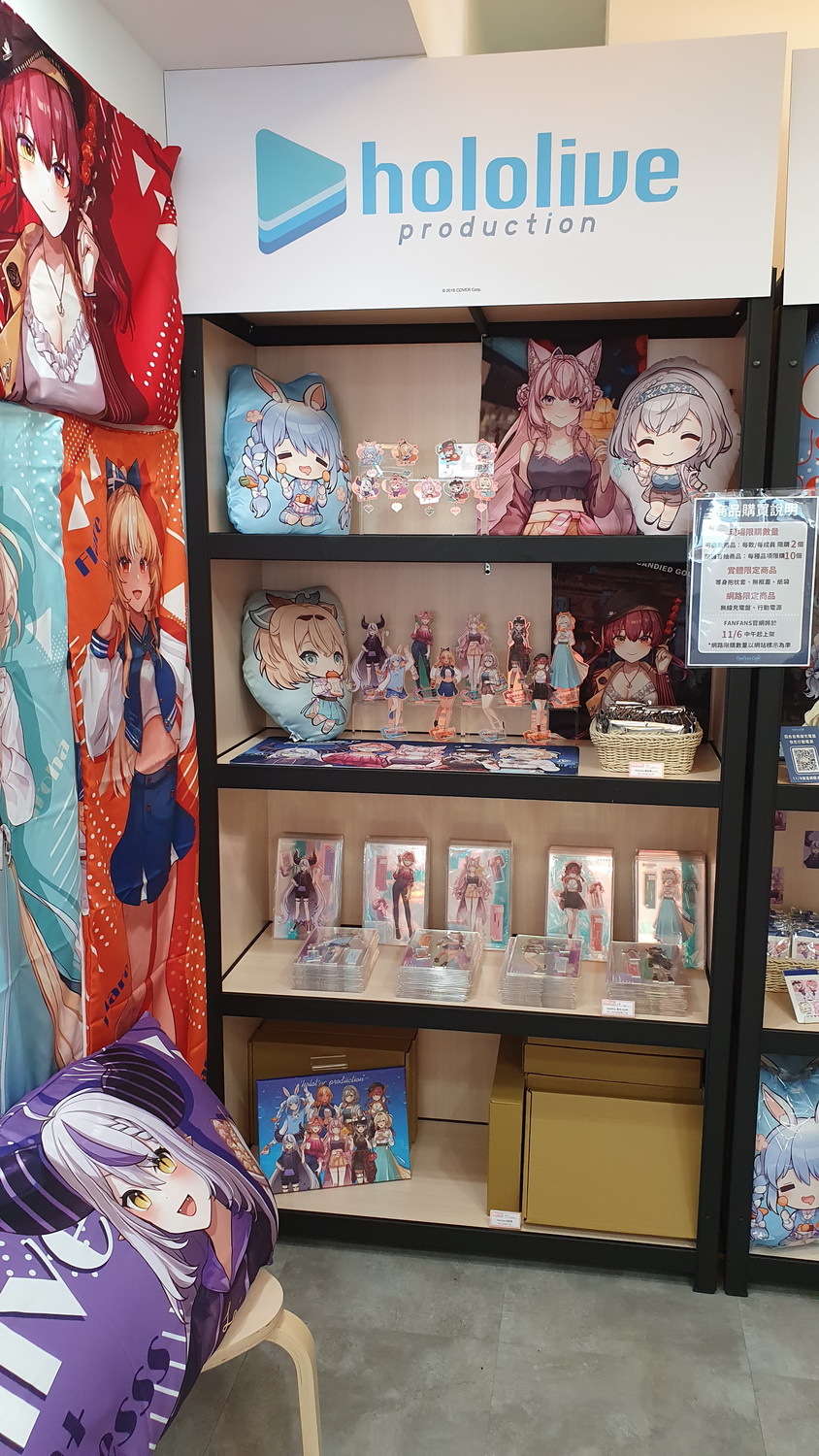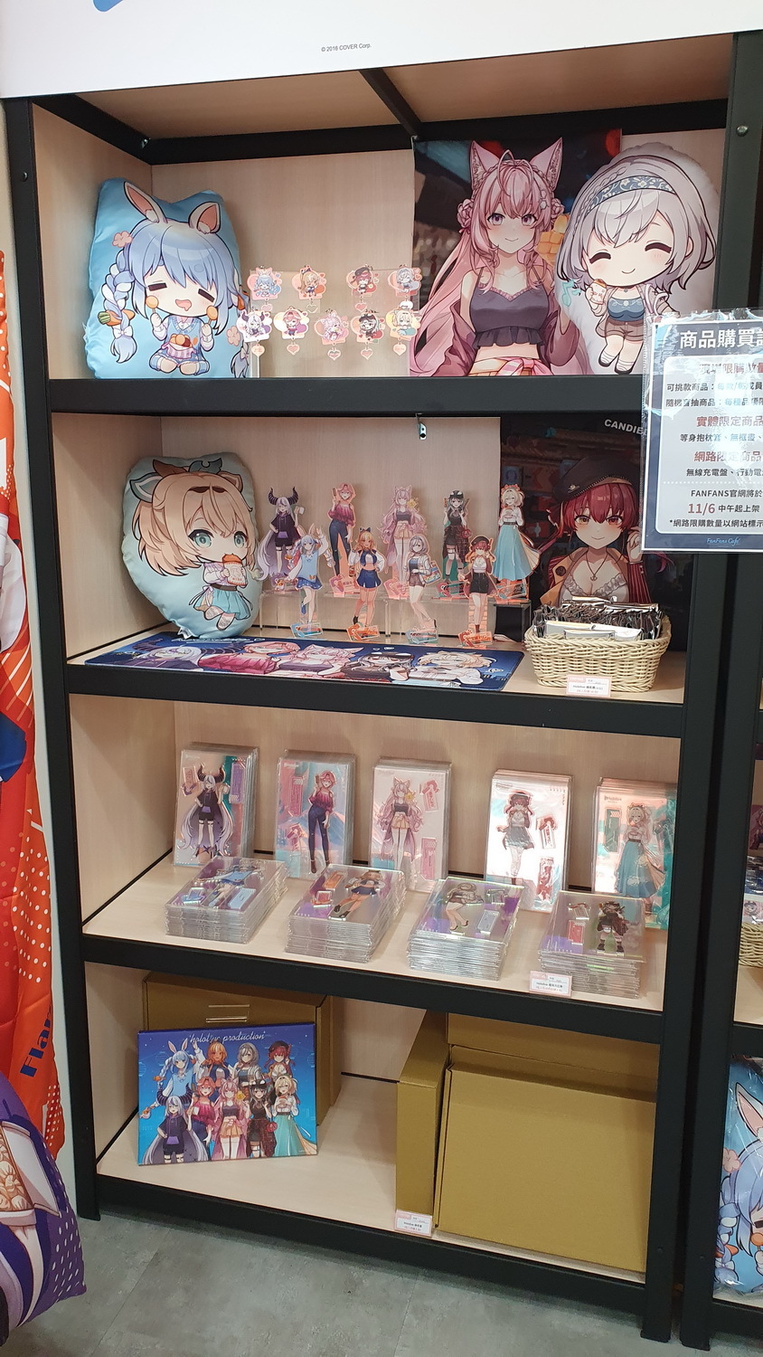週邊商品的部分,則是將陸續推出幻彩壓克力立牌、掛軸、杯墊、壓克力色紙、毛巾、T-shirt...等新品,還有實體限定的等身抱枕套、無框畫、紙袋。另外「FANFANS 粉粉」官網也將於 11/6 上架本次合作系列,及網路限定的無線充電盤、行動電源,網路消費 hololive 系列商品滿 $999,將加送 hololive 成員 SNS 造型透卡一張(款式隨機、送完為止)。
