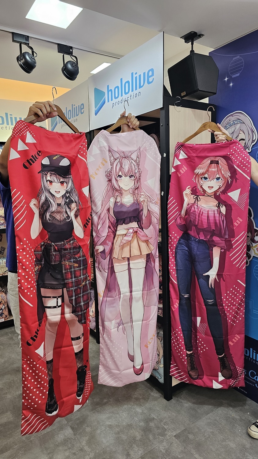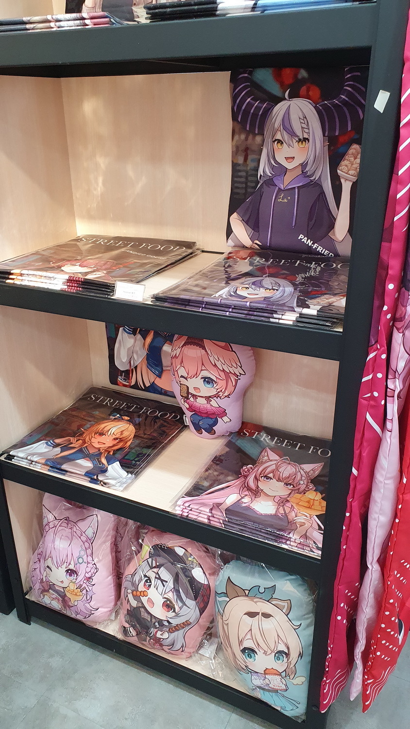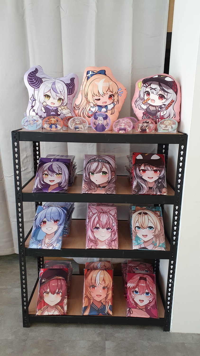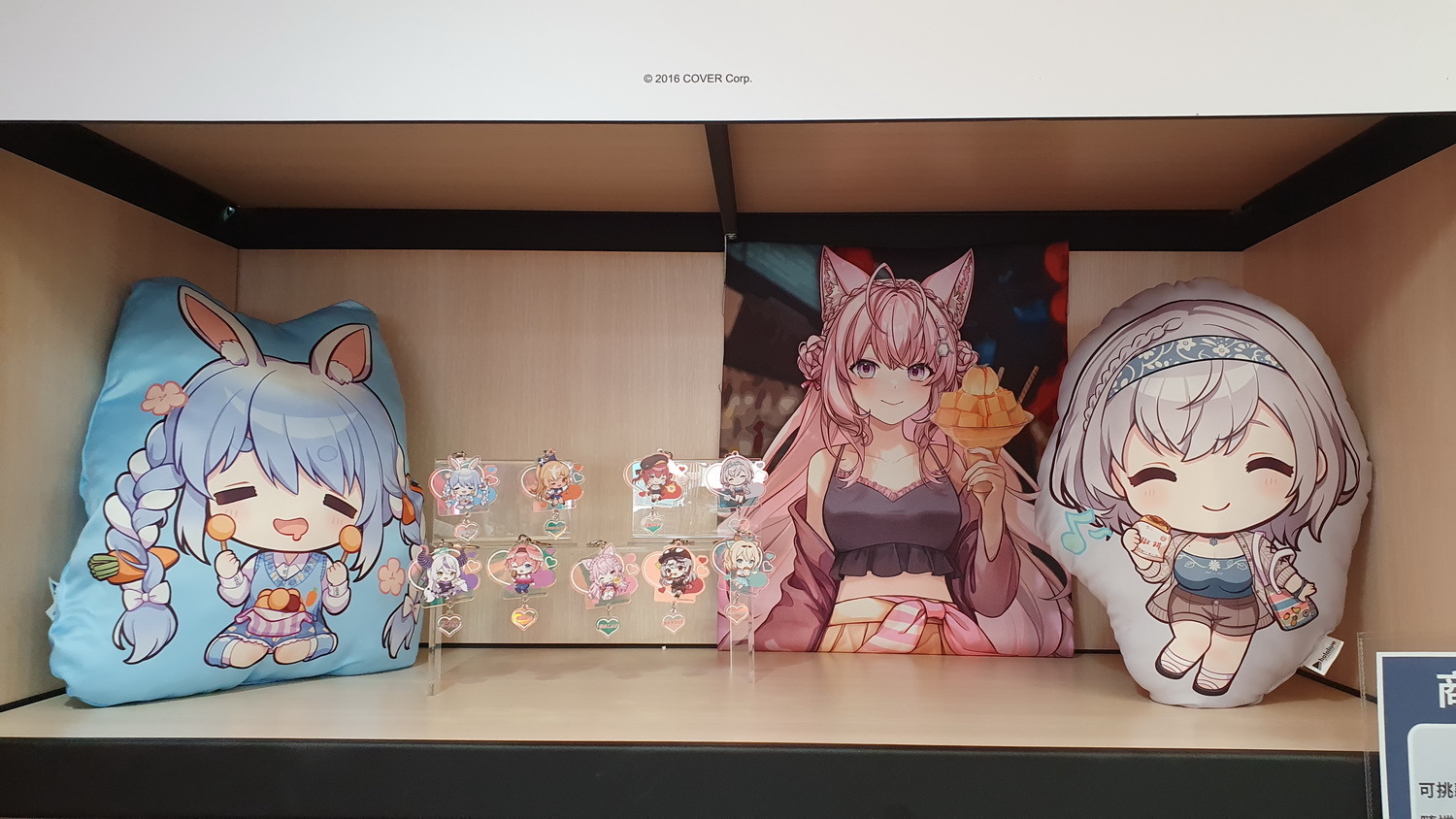 週邊商品的部分,則是將陸續推出幻彩壓克力立牌、掛軸、杯墊、壓克力色紙、毛巾、T-shirt...等新品,還有實體限定的等身抱枕套、無框畫、紙袋。另外「FANFANS 粉粉」官網也將於 11/6 上架本次合作系列,及網路限定的無線充電盤、行動電源,網路消費 hololive 系列商品滿 $999,將加送 hololive 成員 SNS 造型透卡一張(款式隨機、送完為止)。