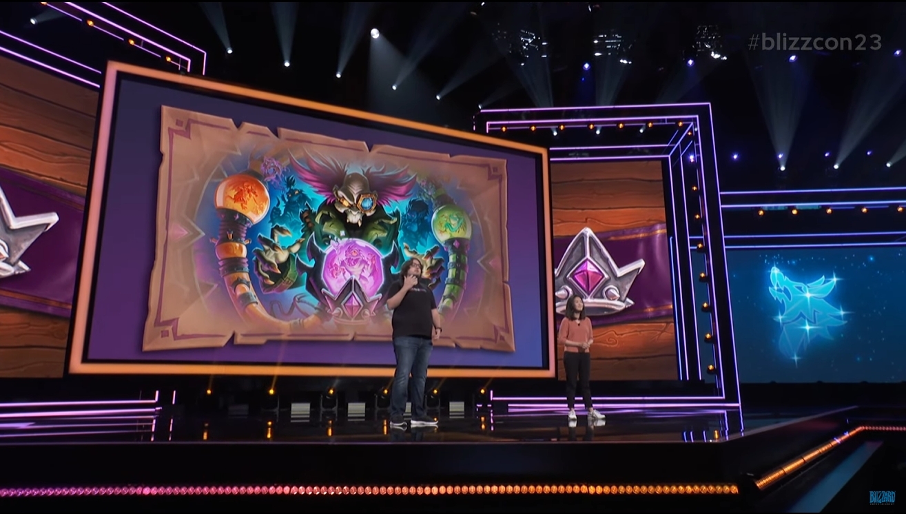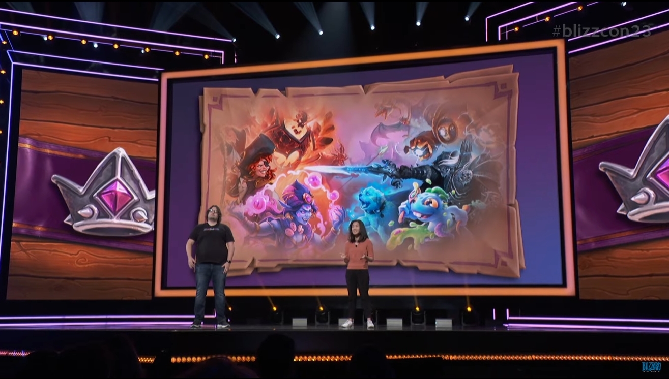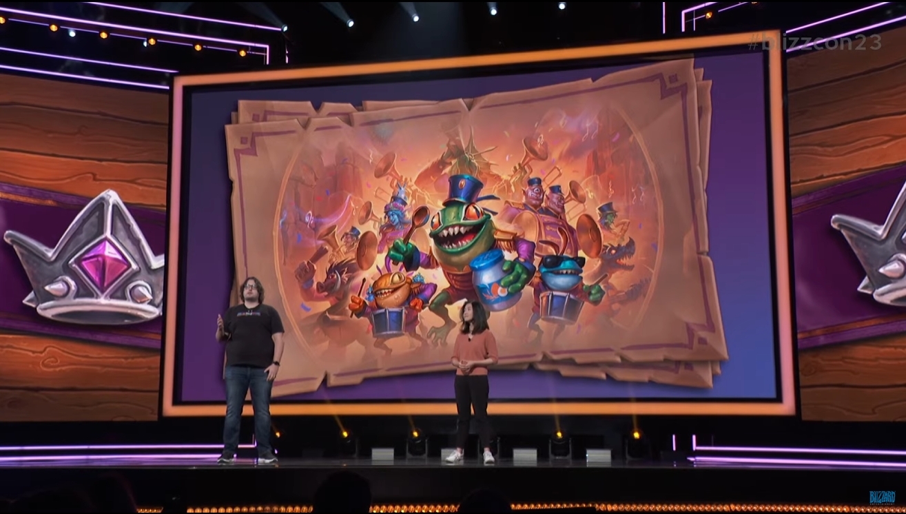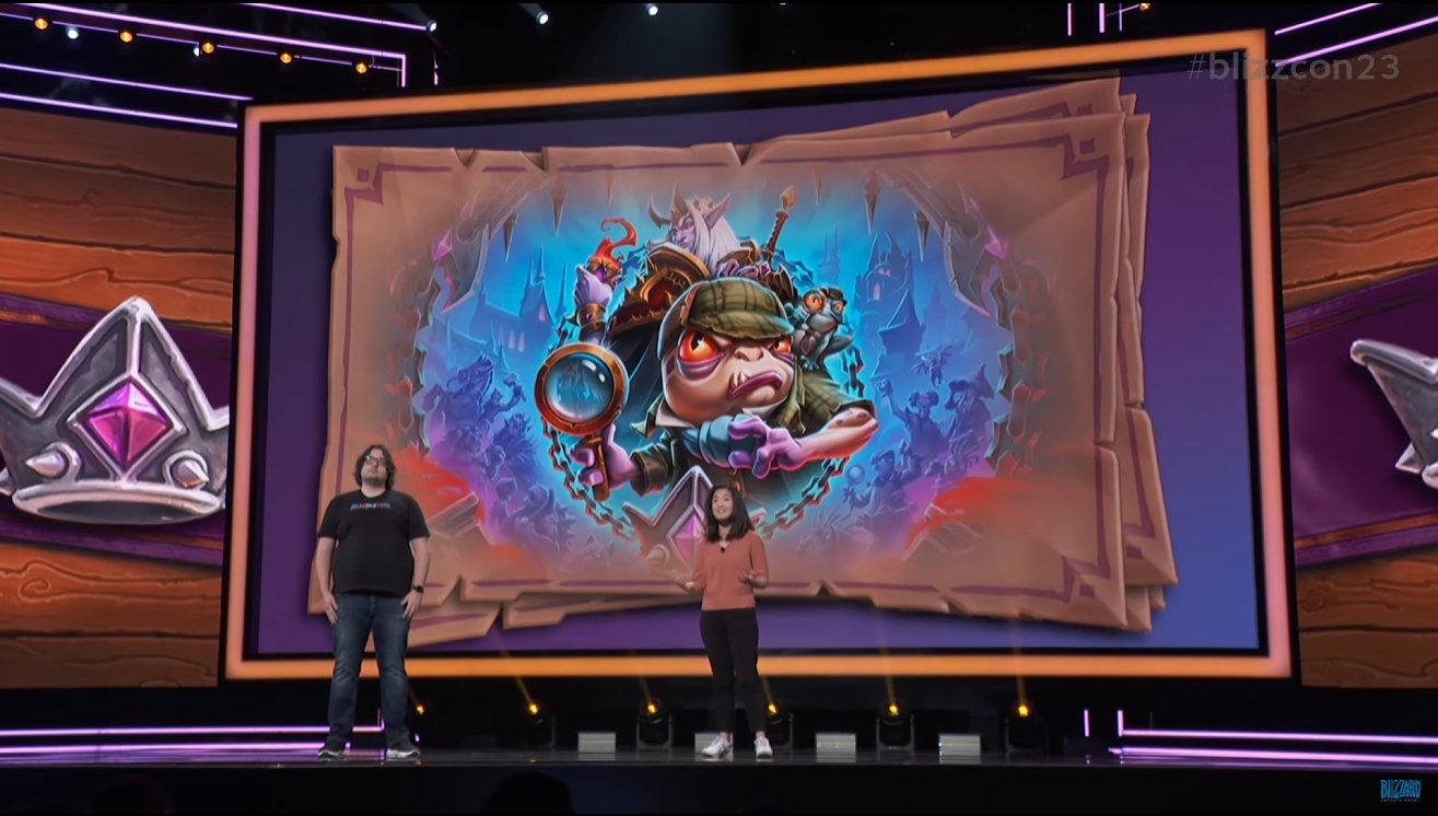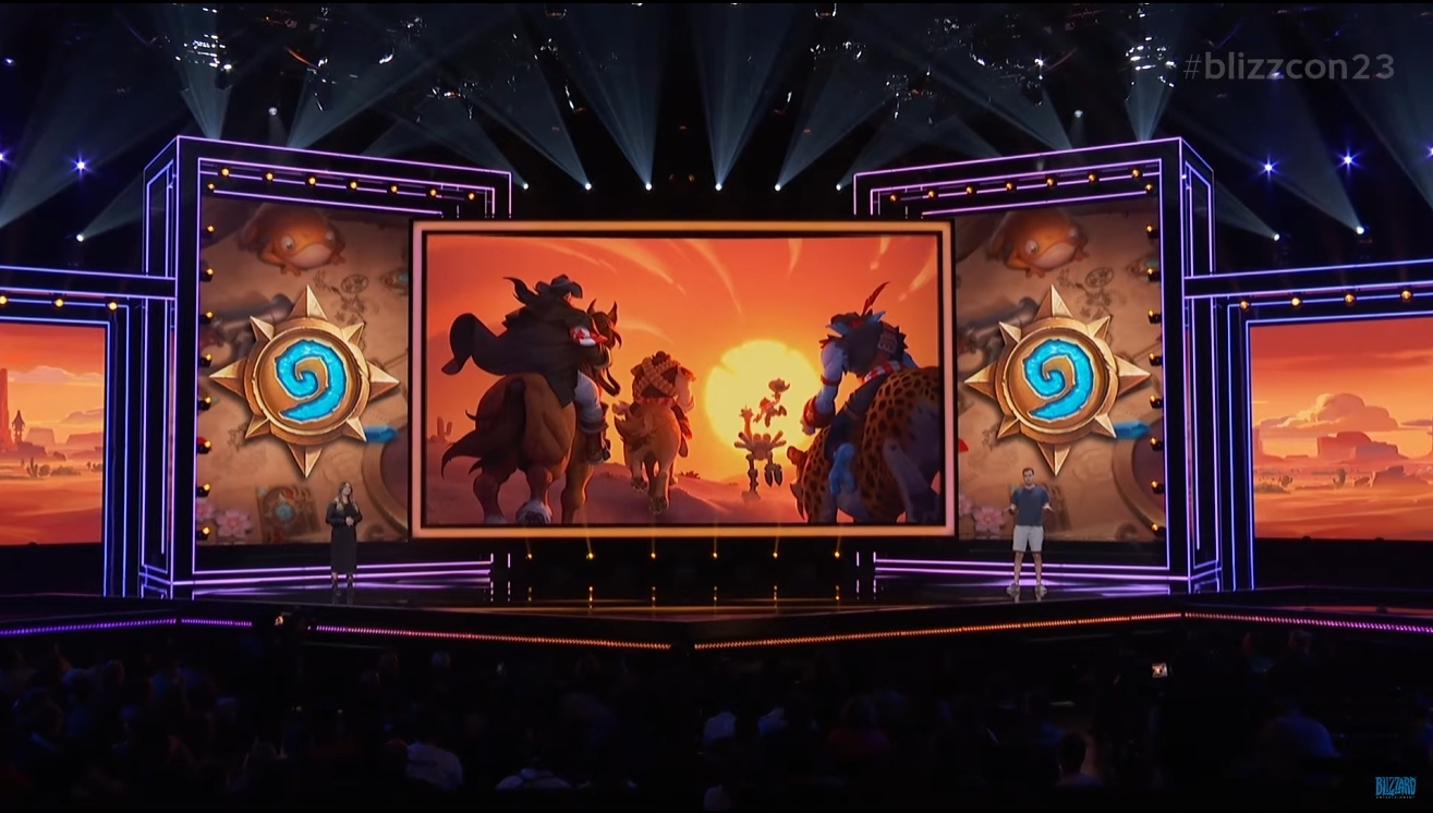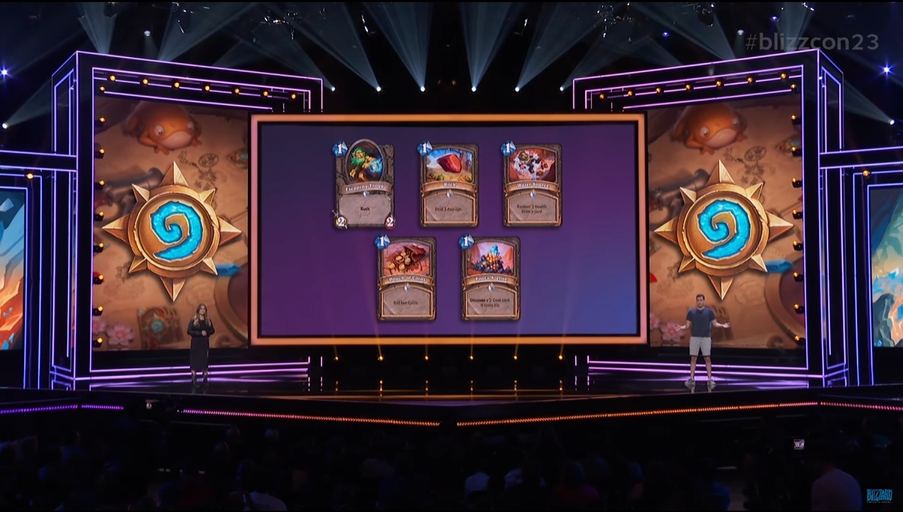 爐石戰記》的遊戲團隊將帶領玩家搶先目睹即將推出的內容。緊接著再由開發者親自引領了解最新情報,包含像是《決戰荒蕪之地》全新卡牌、追趕進度包以及可與好友並肩作戰的「英雄戰場雙打」模式。