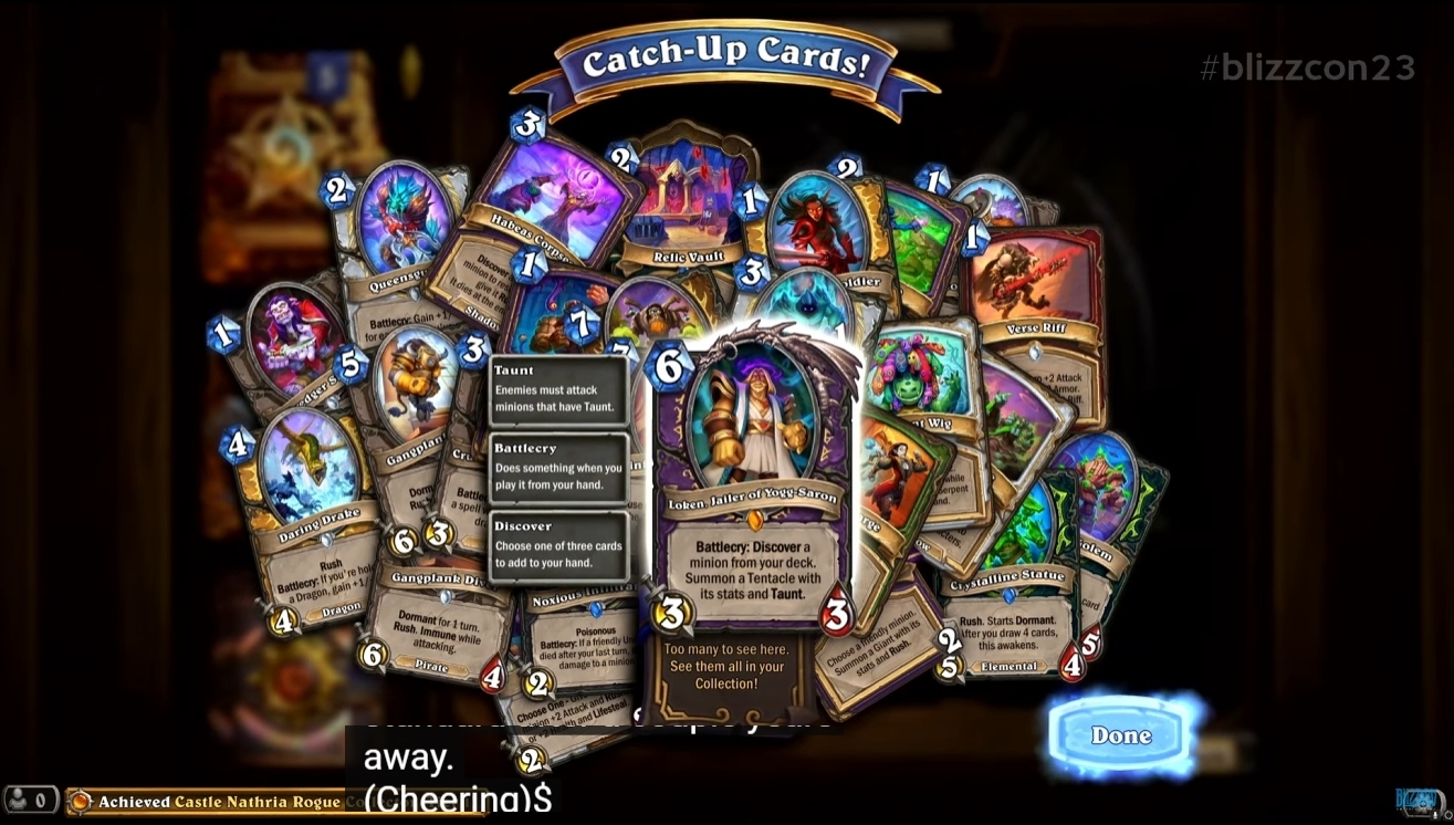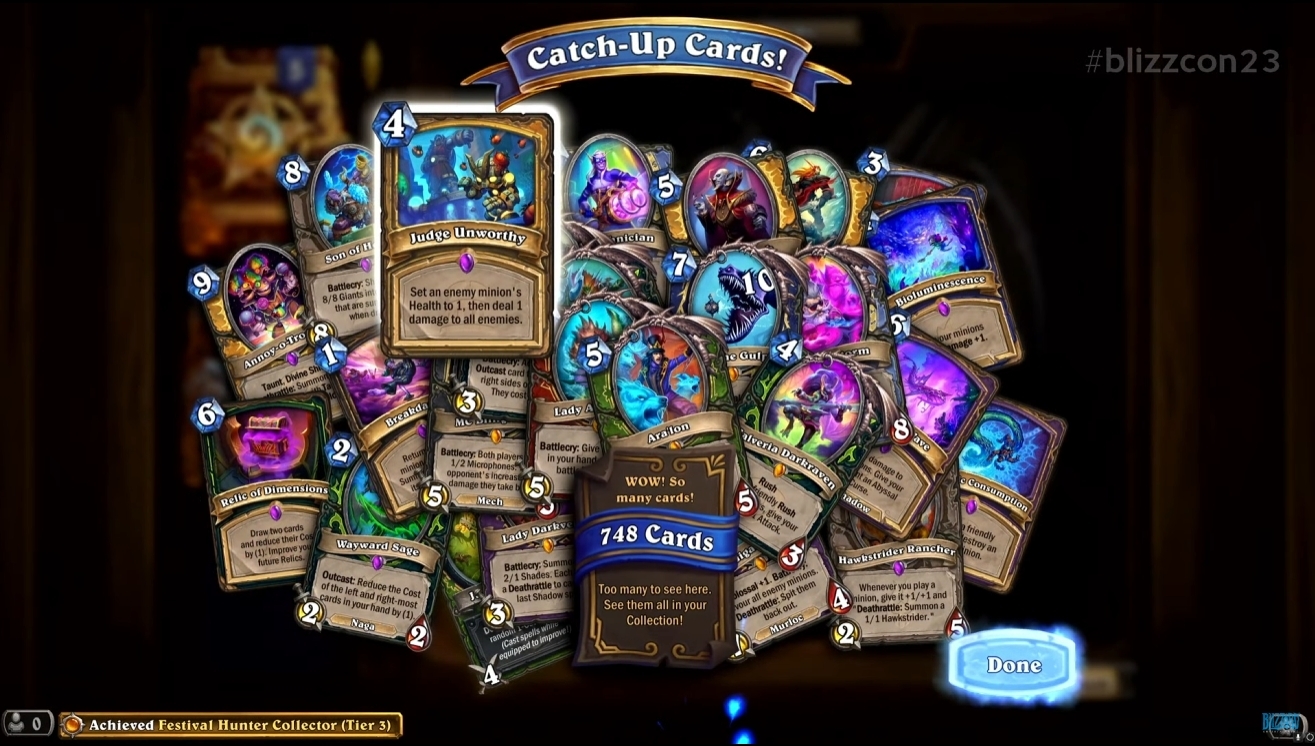 官方指出,今日隆重宣布推出全新的追趕進度包,這種劃時代的卡牌包專門設計用來追上新資料片的進度。每個追趕進度包內含最多 50 張卡牌,同時將會免費贈送一些追趕進度包給所有玩家,並為《決戰荒蕪之地》的超值禮盒和英雄典藏大禮包塞入大量好禮,而且不收額外費用。對於標準規則收藏不多的玩家來說,這代表可能會獲得超過數百張的額外卡牌。