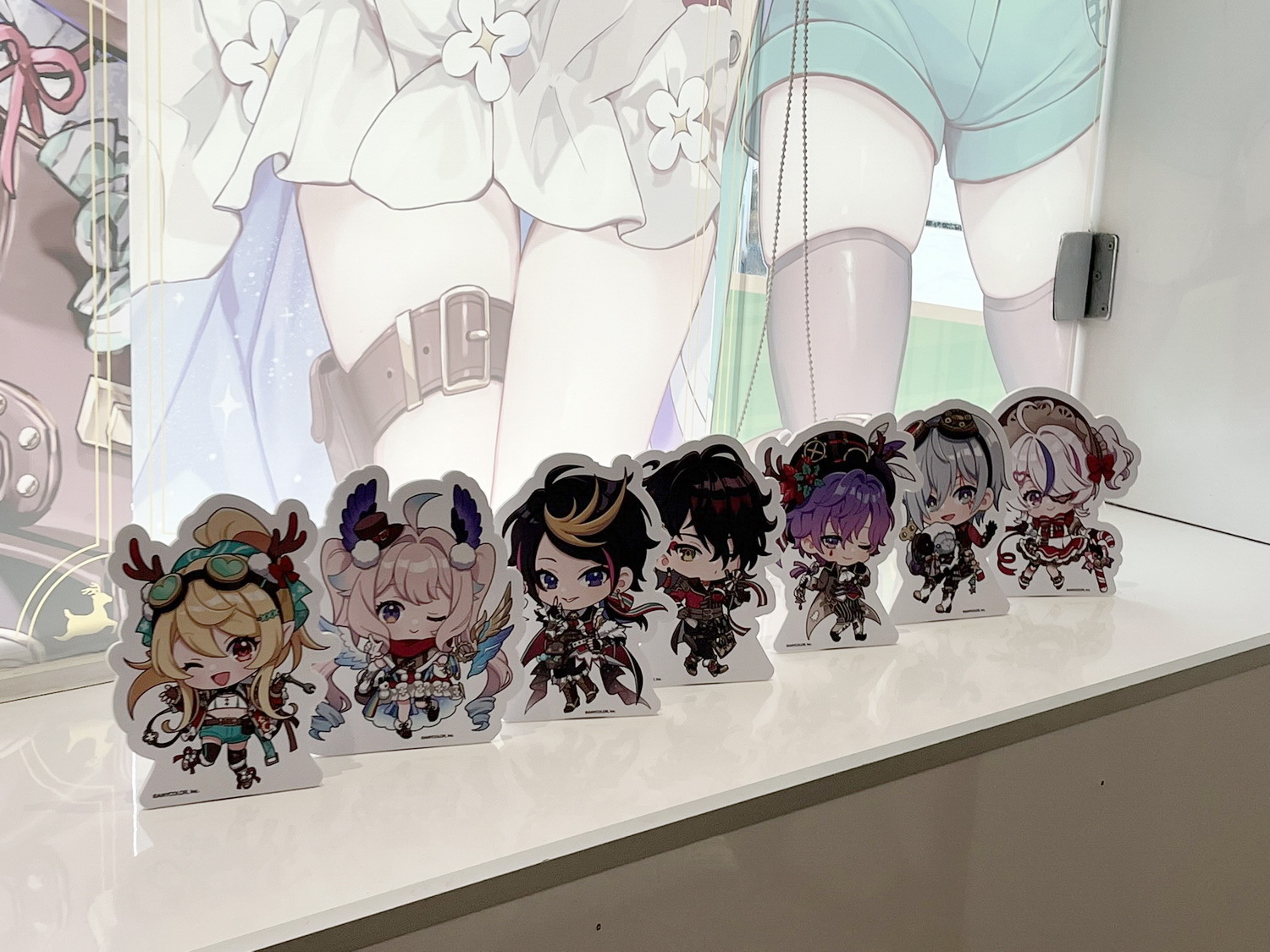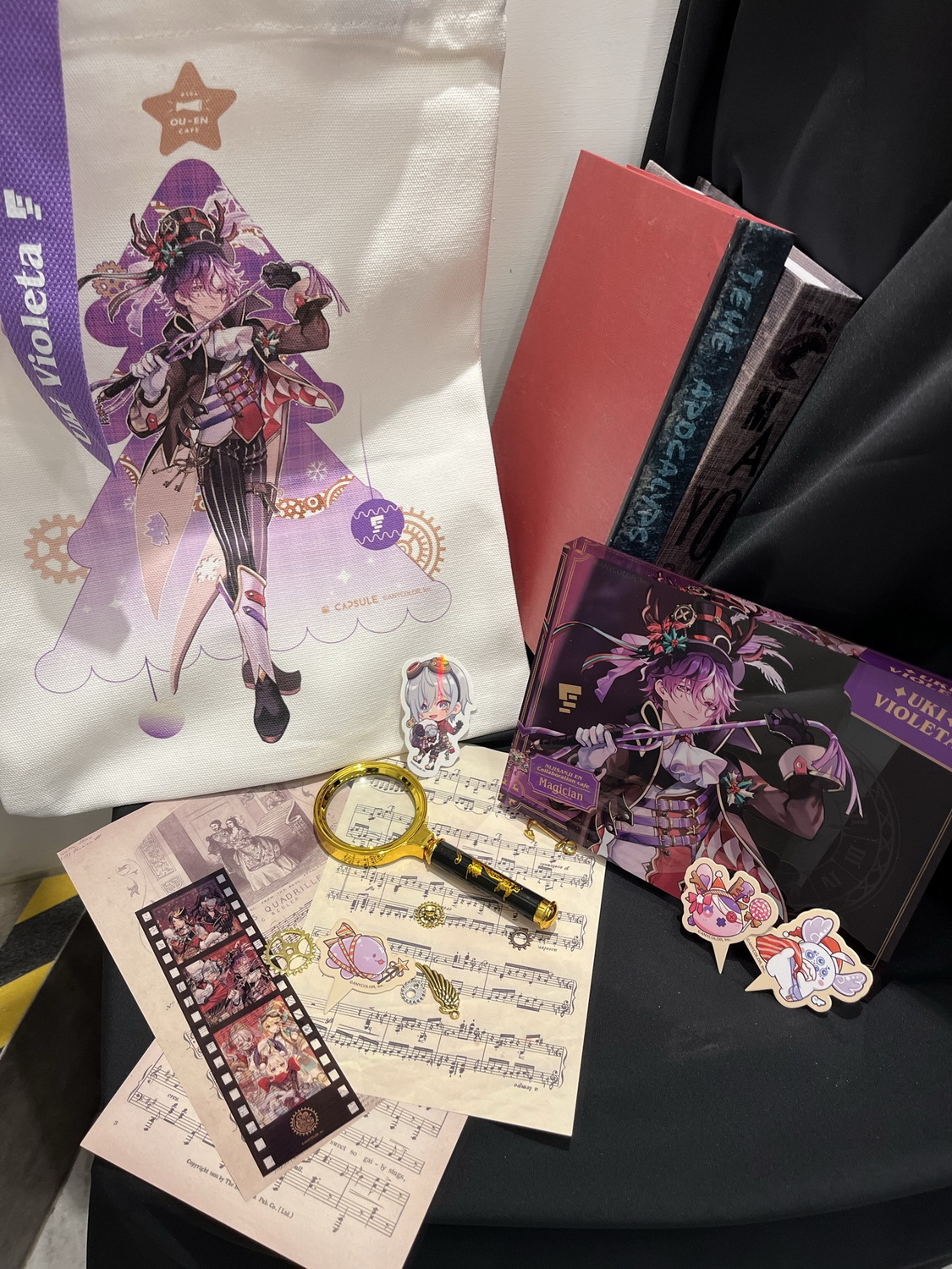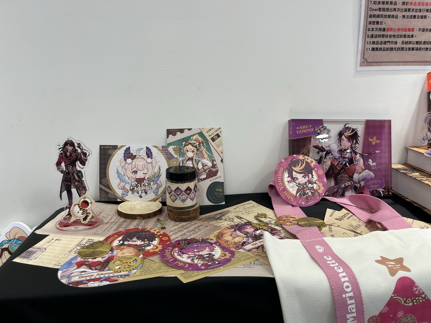 本次 OU-EN cafe 也提供預約來店的粉絲們獨家福利,除了現場才能購買的、立繪 Q 版一次擁有的「L 型資料夾」、不同表情的「貼紙包」和七位成員親筆撰寫的「複製留言色紙」的來店限定周邊品項之外,還有每兩週更換一次的膠片造型小卡作為來店特典提供粉絲蒐集。店內還將隨機播放 Liver 們為台灣粉絲錄製的來「店」答鈴。