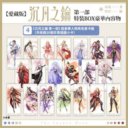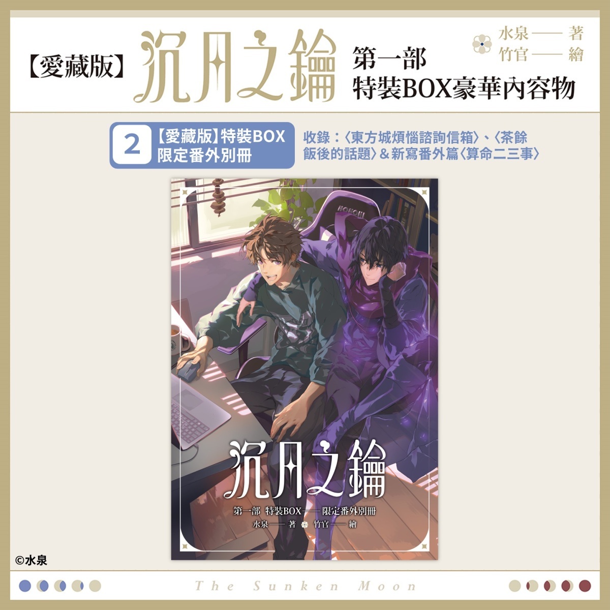 沉月之鑰 第一部》舊版封面圖、內頁黑白插圖與內文,「全新設計書衣」一共八卷附贈首刷特典「水泉老師手寫台詞角色明信片」及「小海報」或「雙面長條海報」。【愛藏版】特裝BOX收錄「限定番外別冊」,內容有〈東方城煩惱諮詢信箱〉、〈茶餘飯後的話題〉以及新寫番外篇〈算命二三事〉。竹官新繪「東方城vs.西方城」角色特繪圖,用以製作搭配兩色風格袖套設計而成的「收藏用書盒」與華麗陣容「摺疊海報」。【愛藏版】特裝 BOX 還豪華收錄《