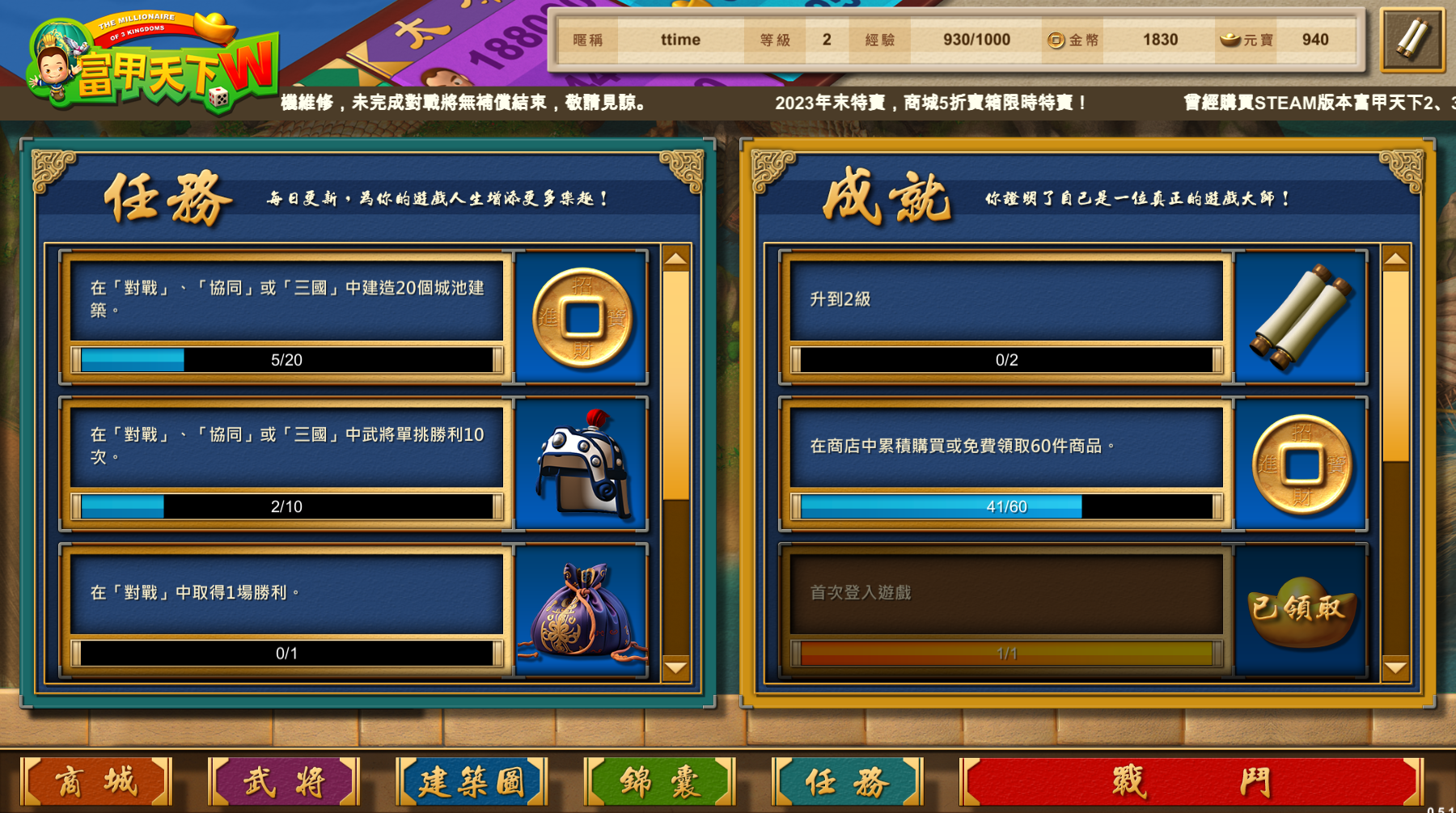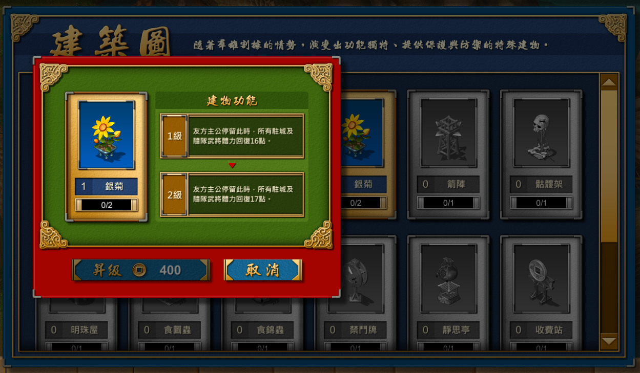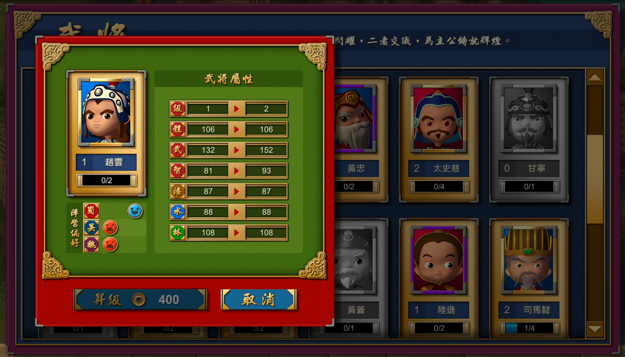 蒐集卡牌升級武將、建築圖和錦囊,升級成功直接參戰