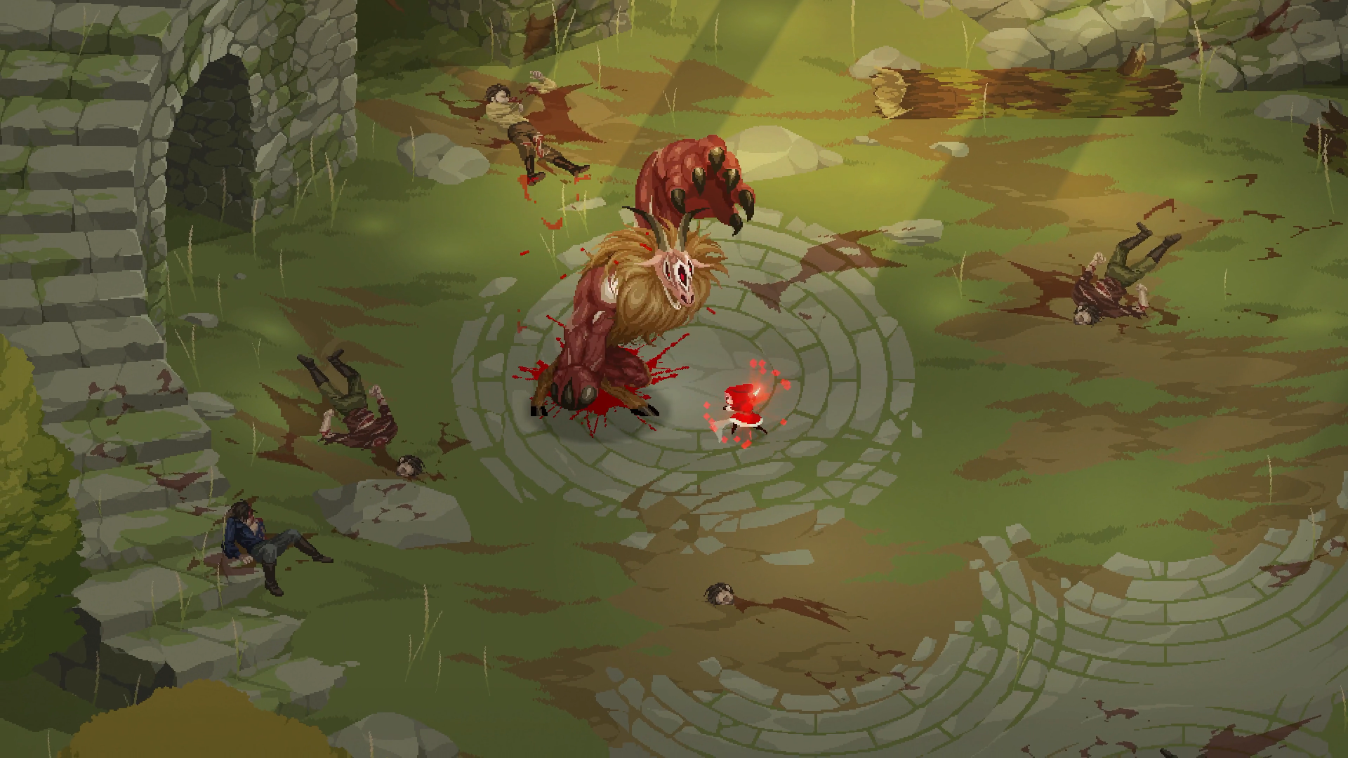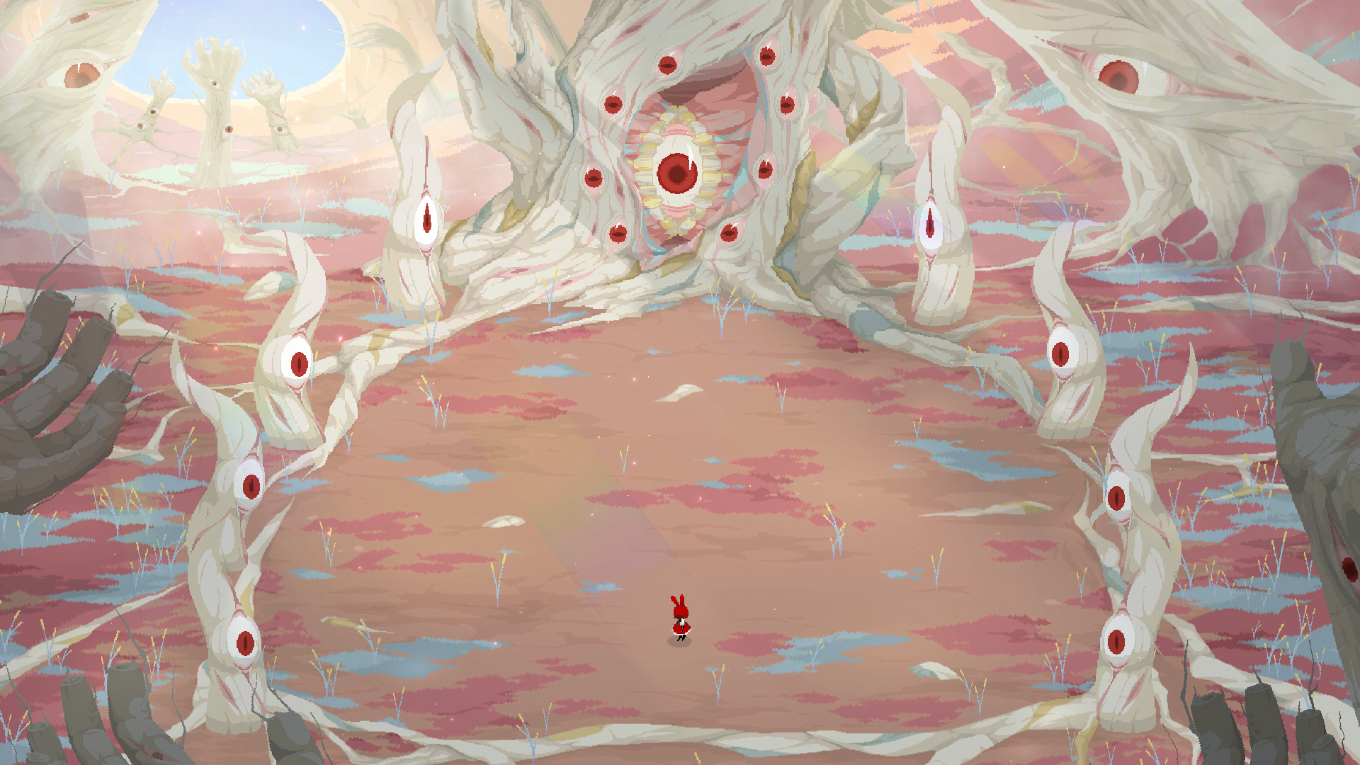 《紅眼露比》為結合黑暗奇幻與 2D 像素風格的 Boss Rush 動作遊戲,故事講述女巫為了製造純血結晶,將「斯卡雷特王國」變成了瀰漫死亡的腐敗之地,被植入純血結晶的生物都成為了怪物 —「血汙之物」。主角「露比」擁有著能夠看到怪物體內純血結晶的能力,只有透過她精準的攻擊才能殺死血汙之物。玩家在遊戲中將扮演從斯卡雷特王城逃出來的公主露比,踏上一場奪回王國的復仇之旅。