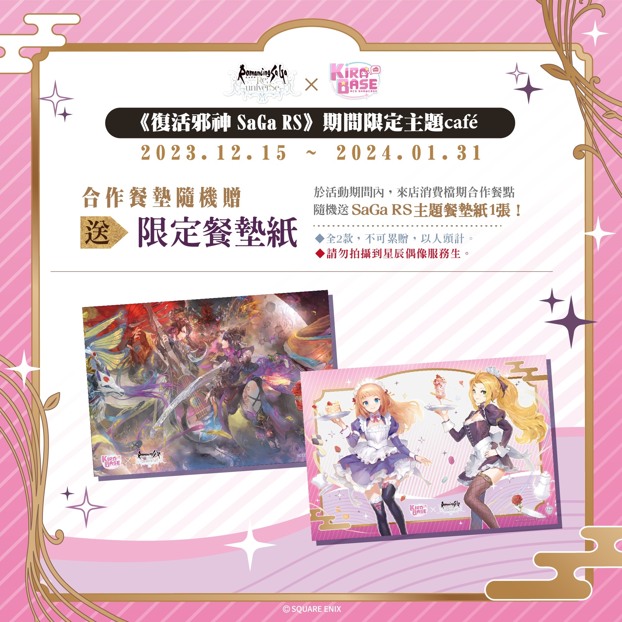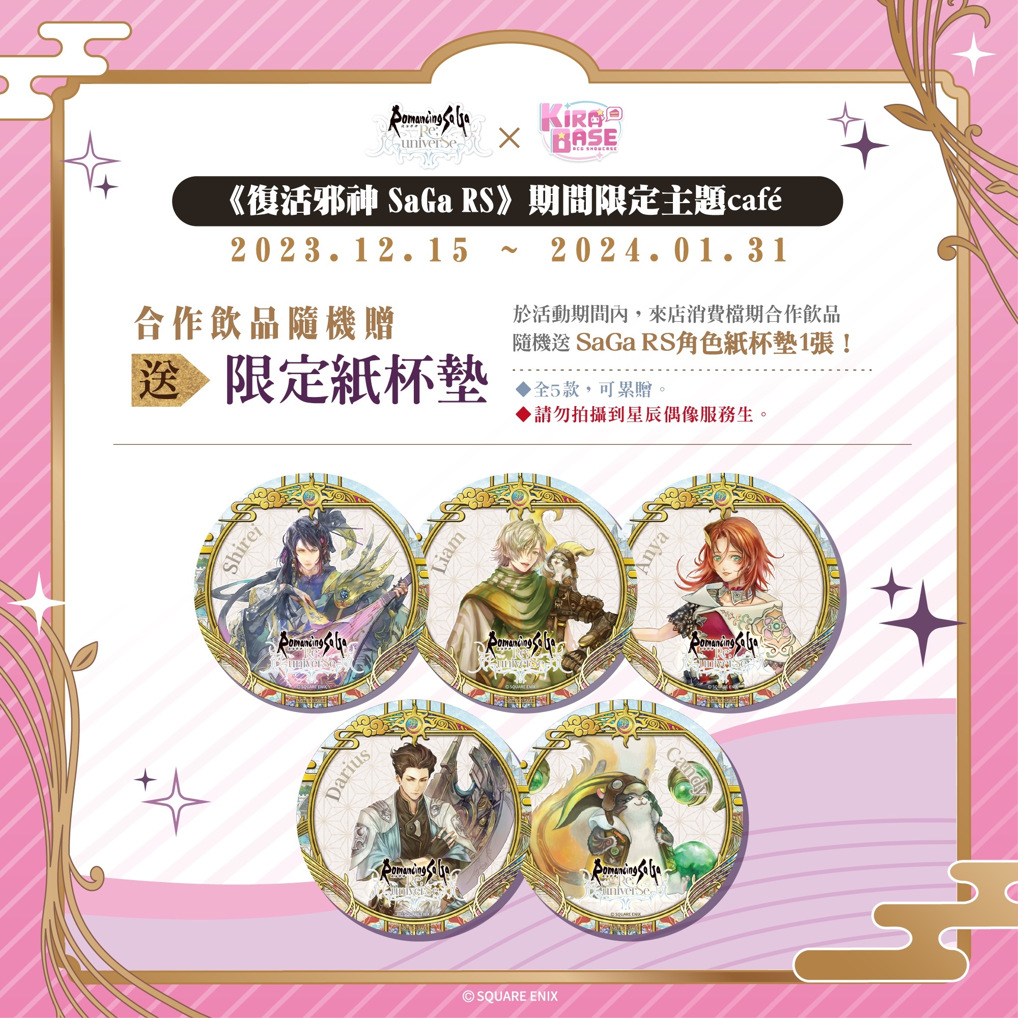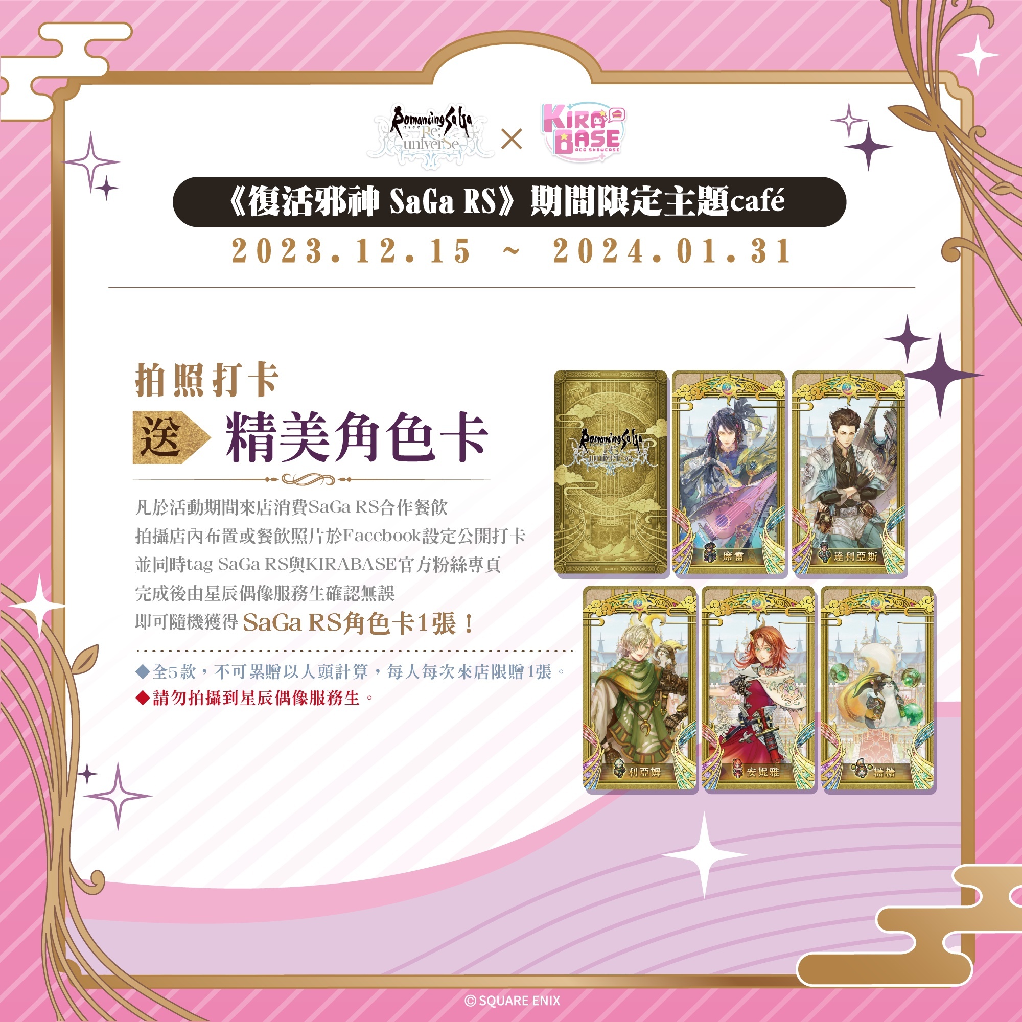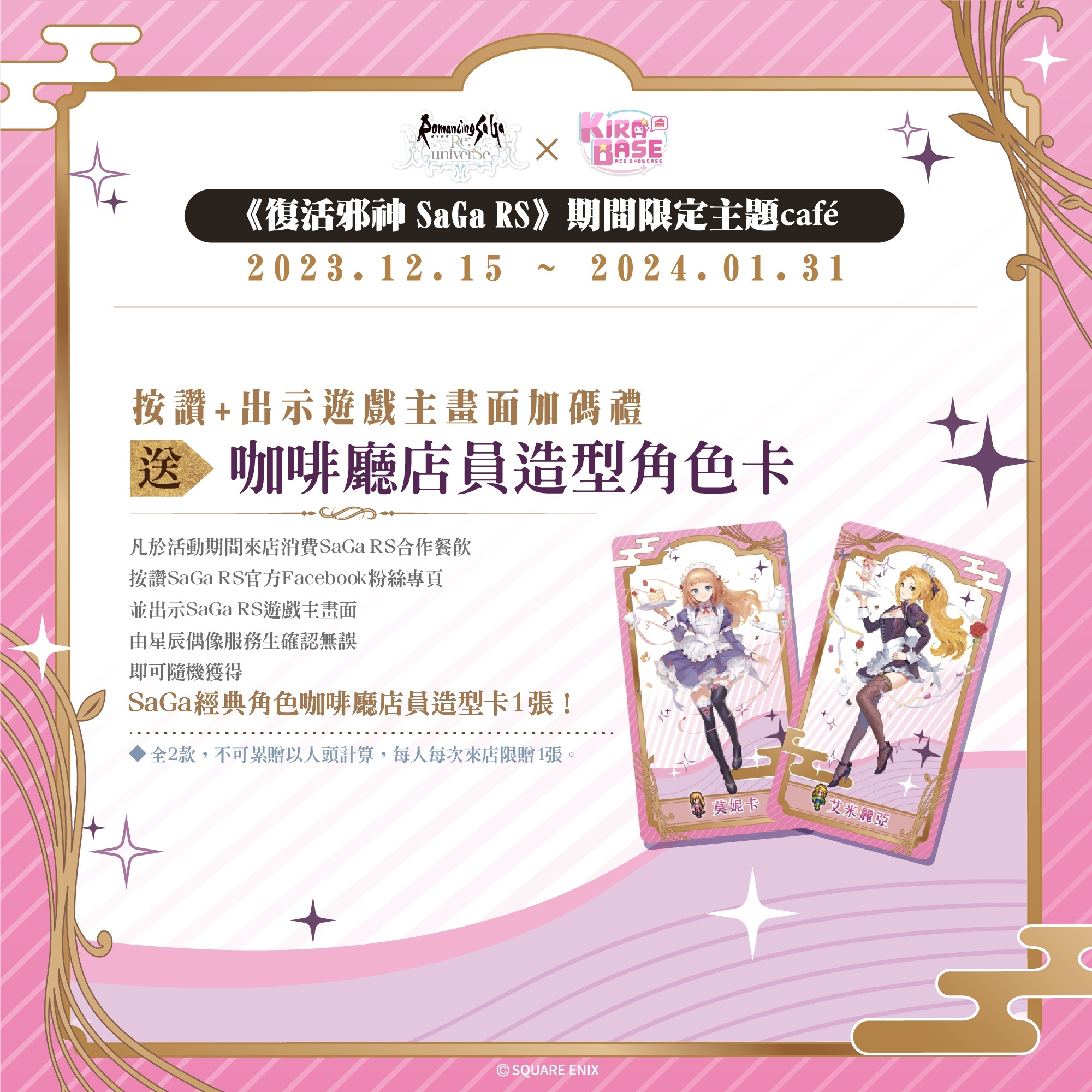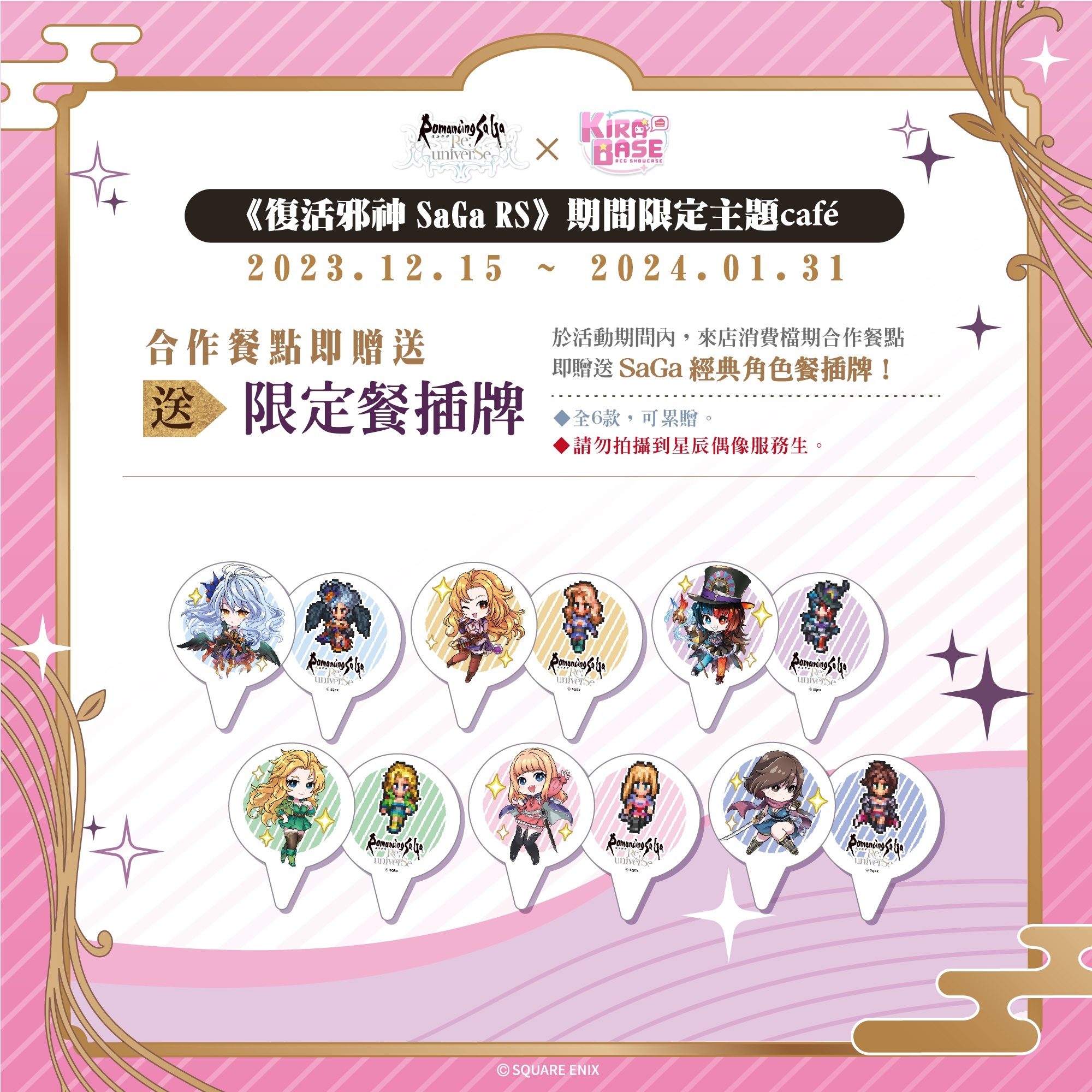 詳細活動資訊、餐點與特典等內容敬請鎖定 SaGa RS 與 KIRABASE 官方粉絲專頁最新消息。期待在這段特別的期間裡,可以與各位玩家們相見!