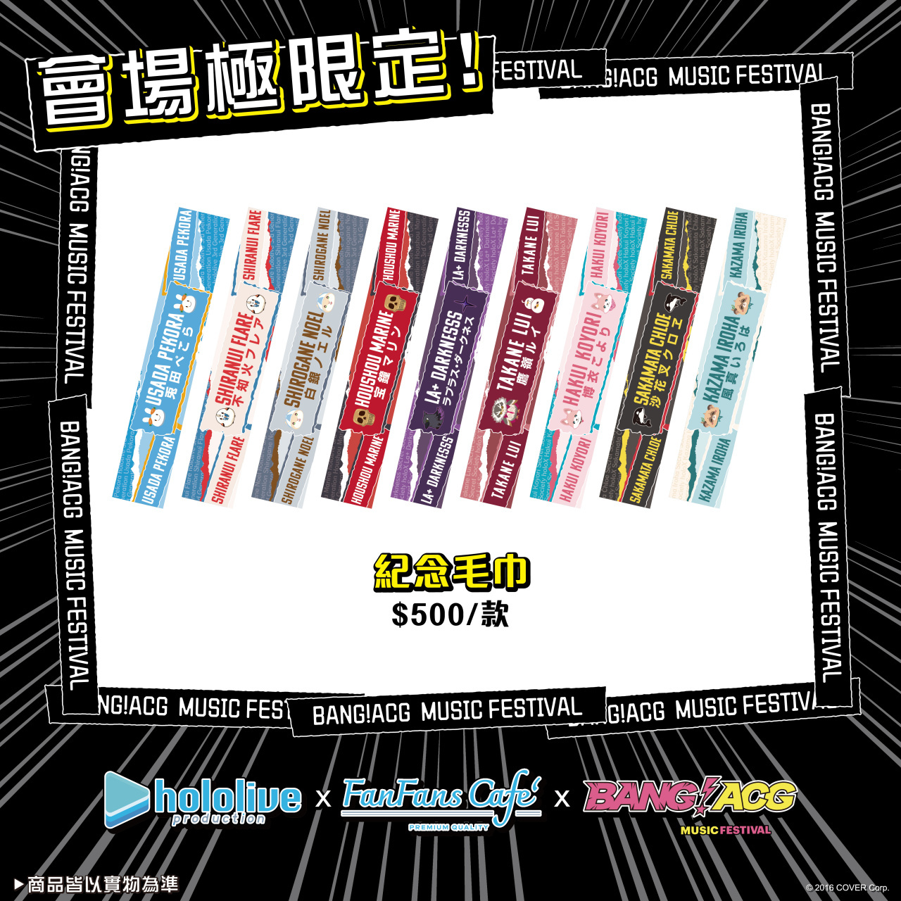 為了這次活動,「初音未來」、「hololive production x FANFANS CAFÉ」都特別帶來限定的合作圖面。現場攤位將販售這次「初音未來」與「BANG!ACG」合作主視覺的紀念 T、紀念寬版毛巾、壓克力鑰匙圈、炫彩大胸章、壓克力板等商品。