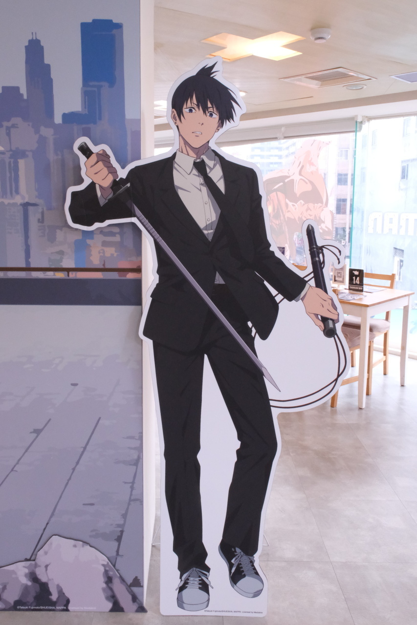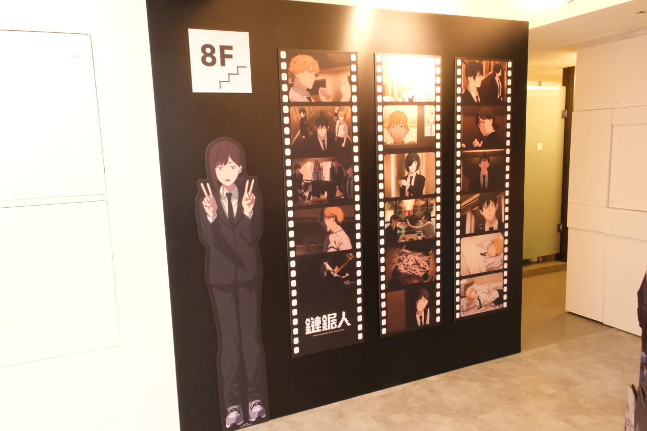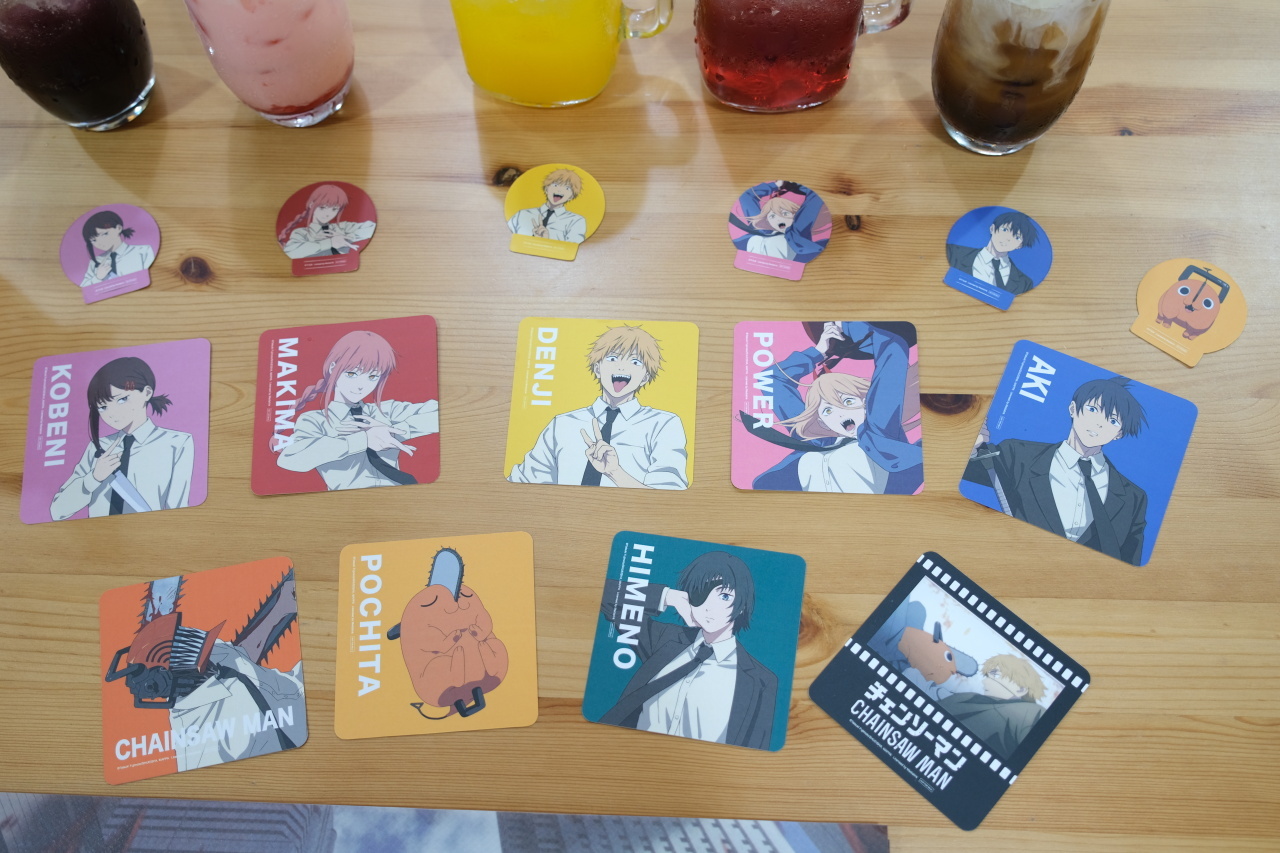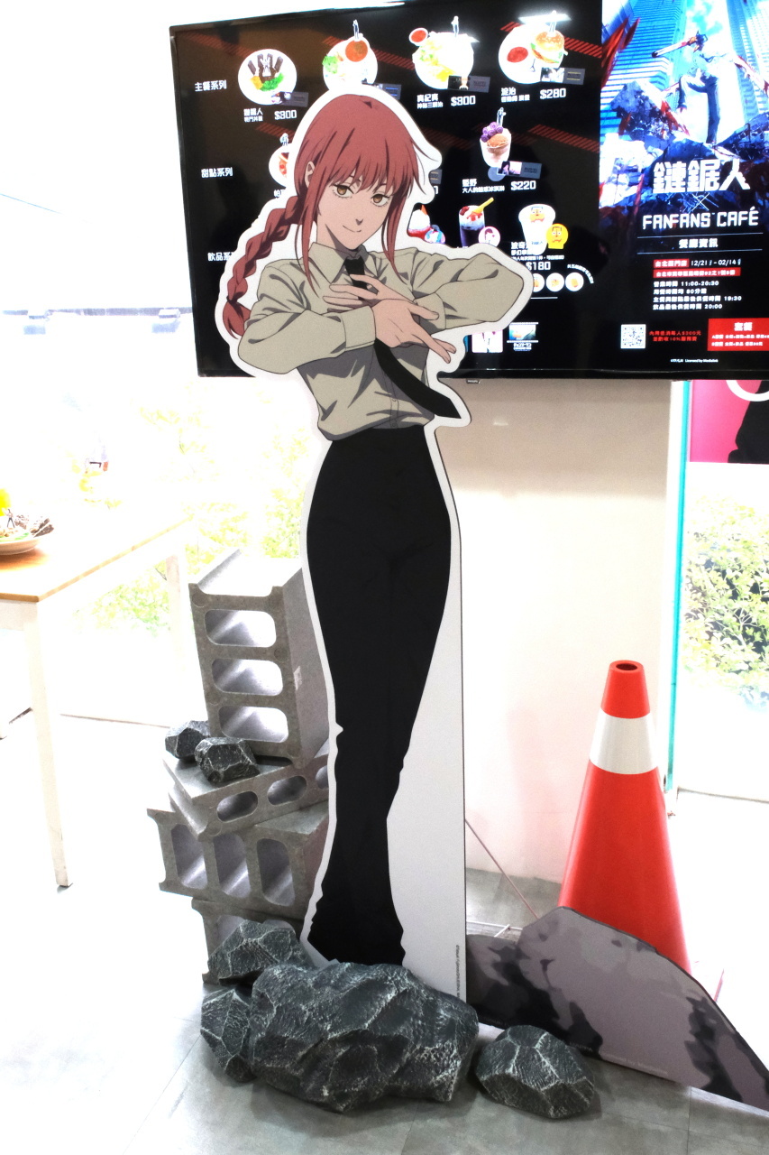 鏈鋸人》的主視覺。進到店面,左手邊有著本次主題咖啡廳的打卡區,而在店內各角落都有角色立牌,有如被公安對魔特異 4 課成員團團包圍保護著一般。