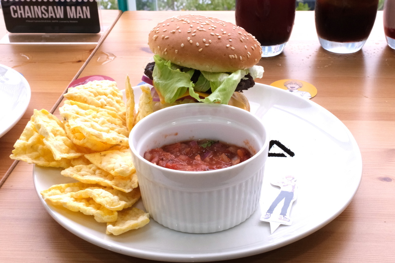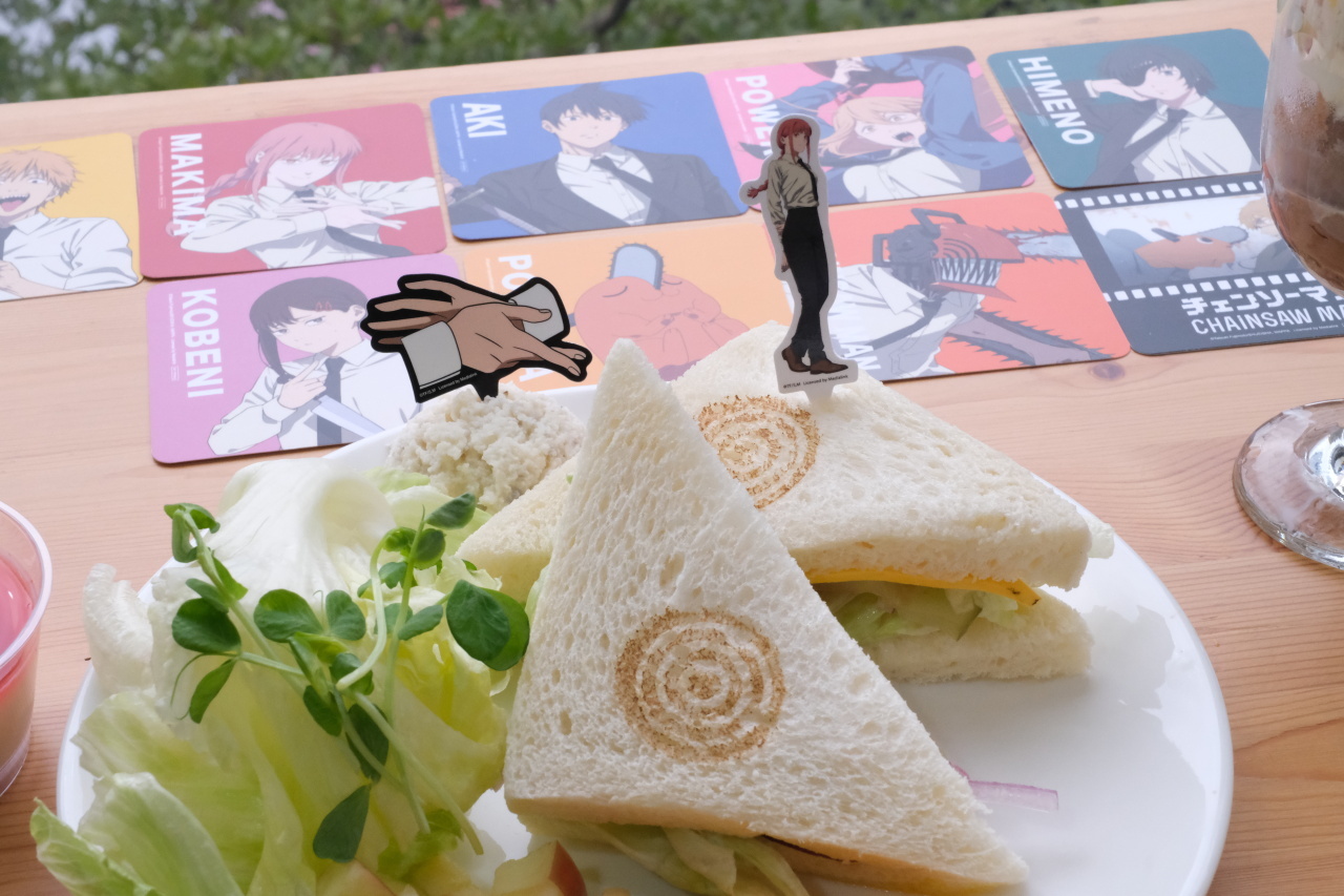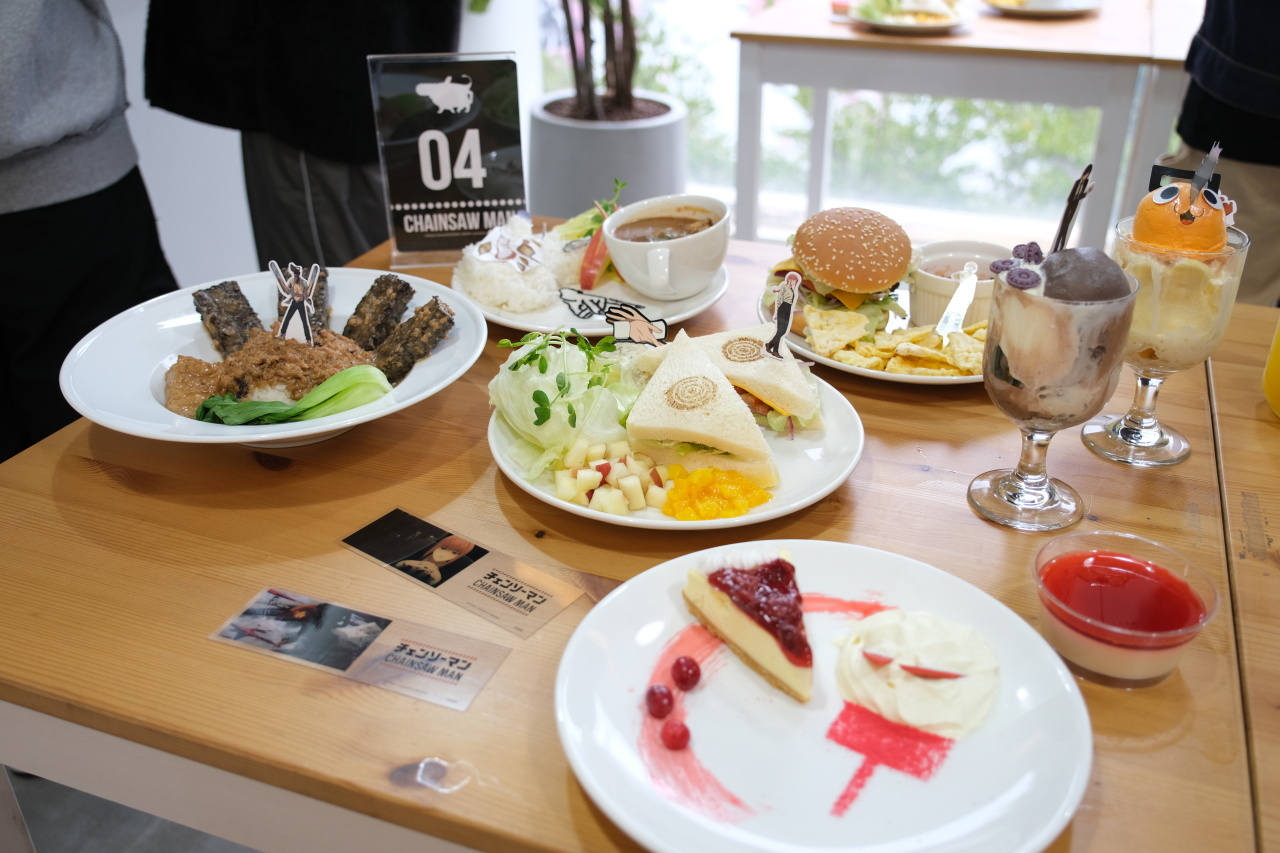 鏈鋸人站在廢墟瓦礫堆上的視覺;以真紀真的招式為參考的「真紀真 神秘三明治」,烙印上真紀真眼睛的圖案;還有以淀治喜歡將各種喜歡的東西加在一起為發想的「淀治 啓動繩 漢堡」;「早川秋 狐狸