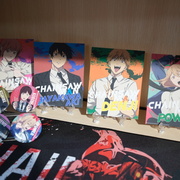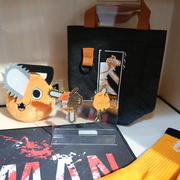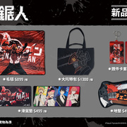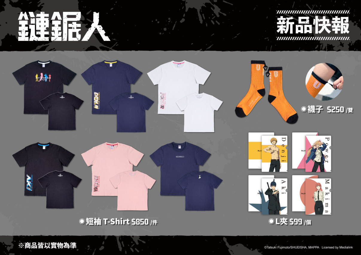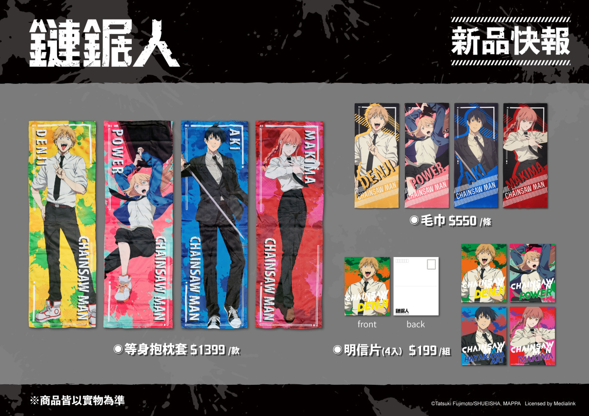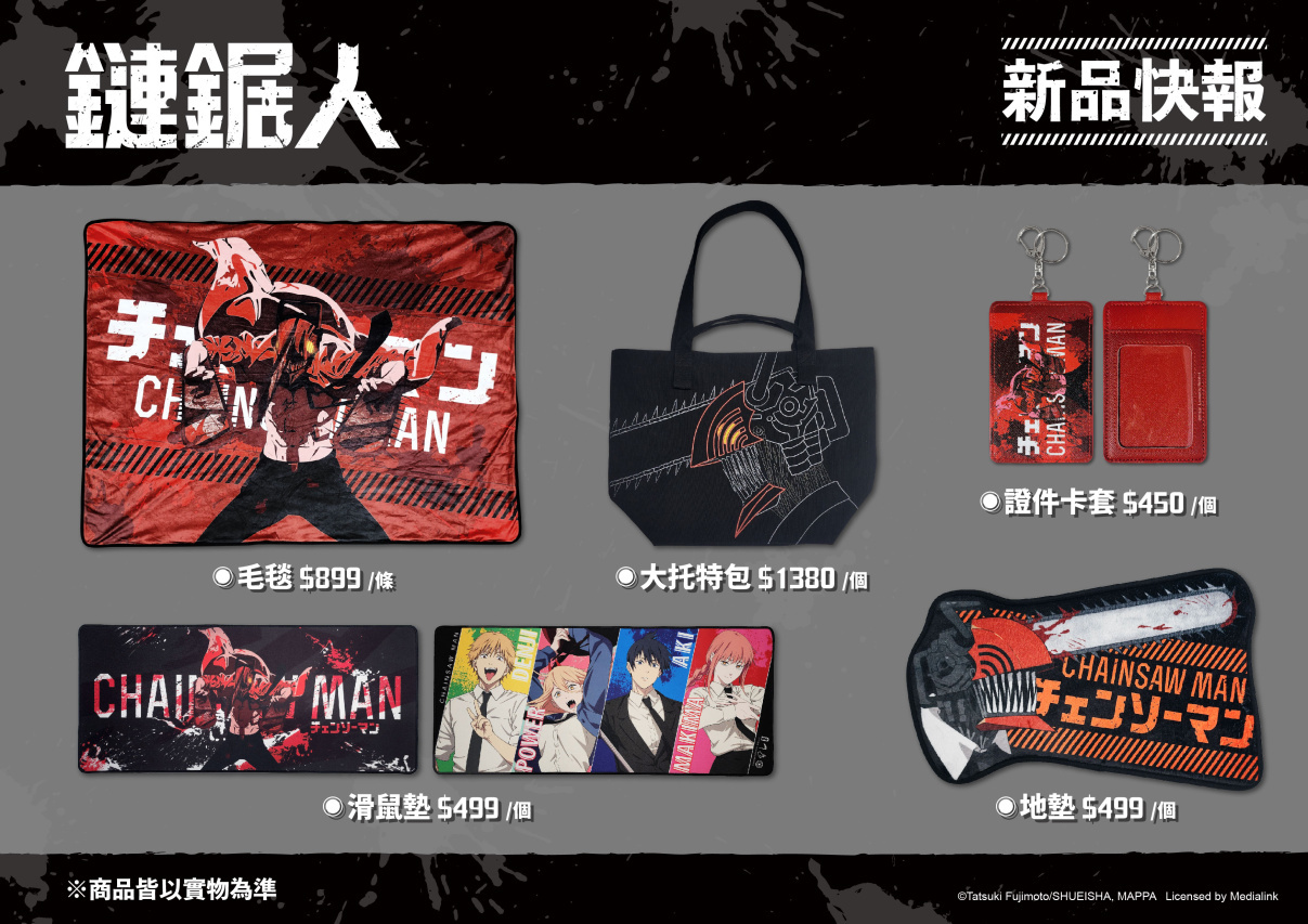 鏈鋸人》正版新商品。由「FANFANS 粉粉」所設計推出的 T-Shirt、地墊、等身抱枕套、毛巾、托特包、滑鼠墊、毛毯、不鏽鋼金屬杯...等,還有像是暗黑系的電繡托特包、有著