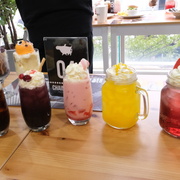 甜點有「姬野 大人的魅惑冰淇淋」,以姬野的形象配上幽靈惡魔的小花裝飾;以帕瓦的形象設計的「帕瓦 血之起士蛋糕」以及可愛的「波奇塔 波奇塔的芒果聖代」,還原波奇塔的造型,還附有一張波奇塔插卡,活動期間只要消費任一主餐或甜點就可以拿到相對應的角色透明小卡。