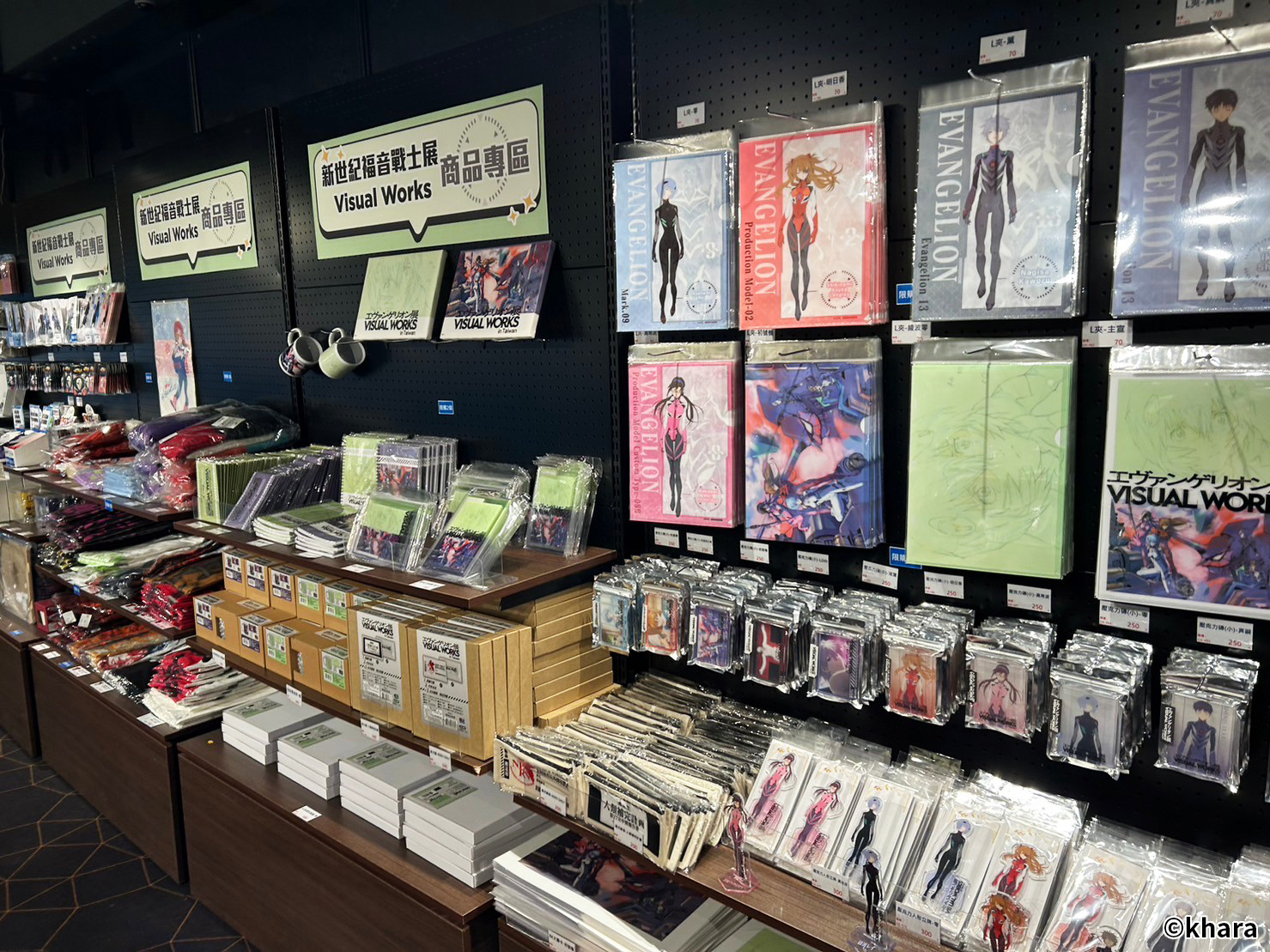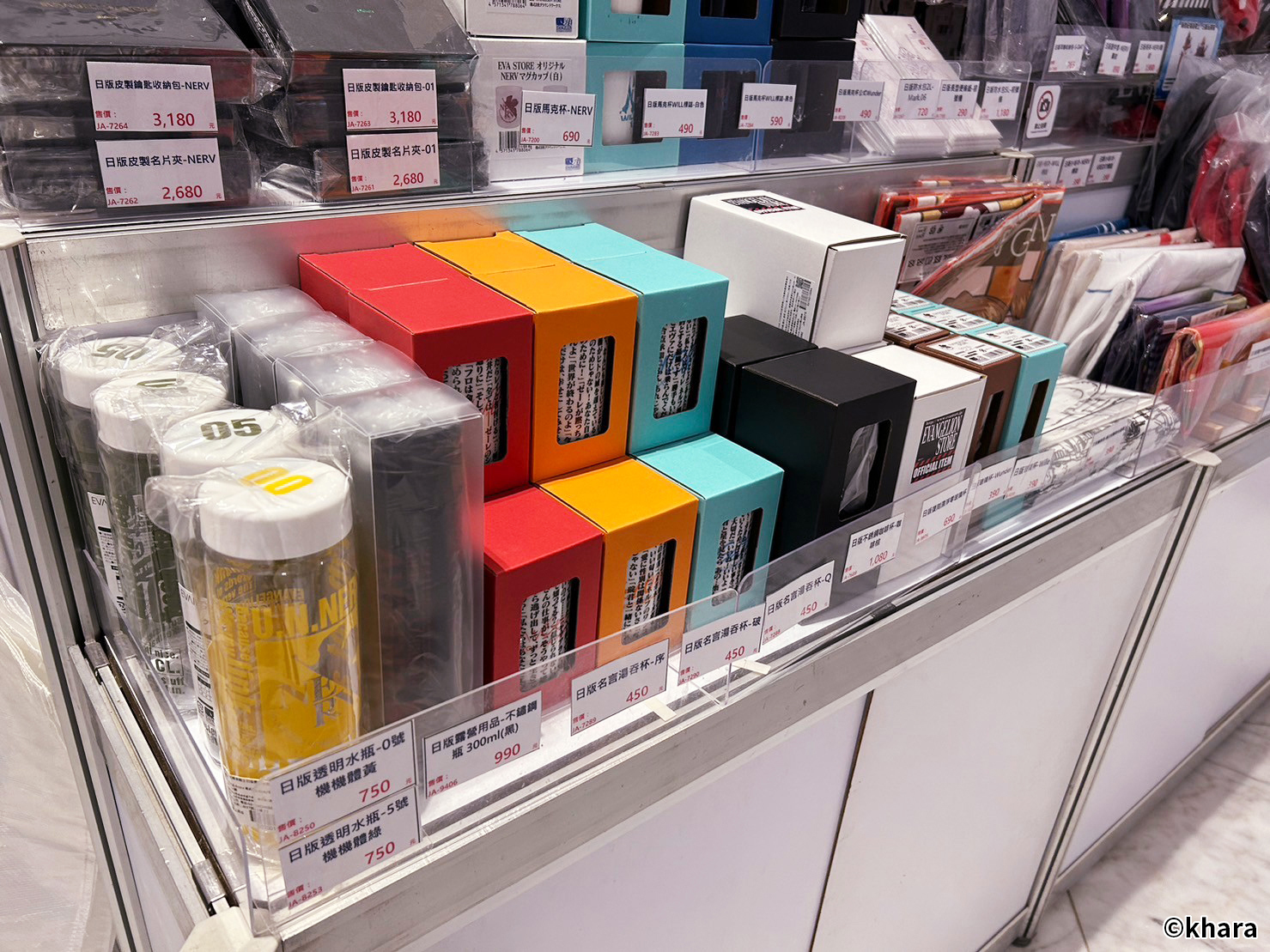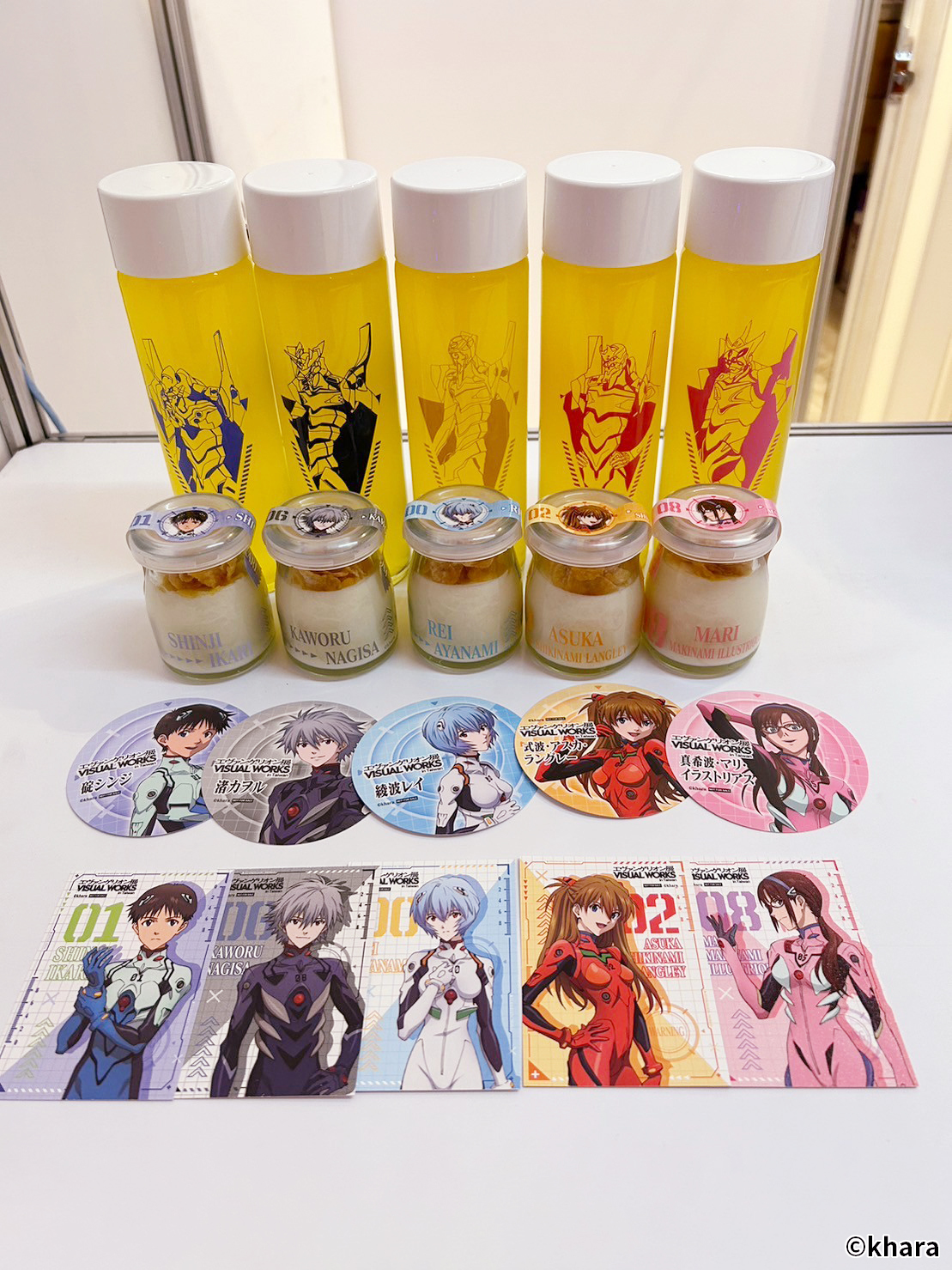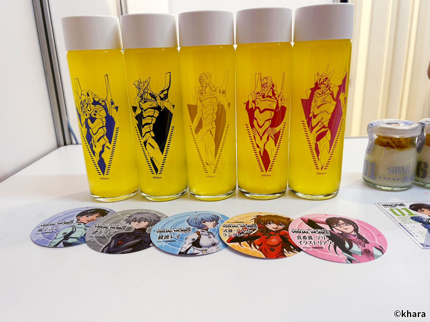 新世紀福音戰士展 VISUAL WORKS 也販售有許多限定商品、周邊精品,包含日版原裝以及台版周邊,還有展覽限定的滿額專屬紀念提袋。在周邊商品部分,還有以 EVA 機體&客製化刻字的金屬軍牌、暱稱「阿水」軟Q可愛的 YURUHSITO 扭蛋印章等紀念小物。還有風味奶酪、L.C.L 柳橙汁,瓶身均有 EVA 元素與機體設計,搭配對應的角色小卡及隨機杯墊。