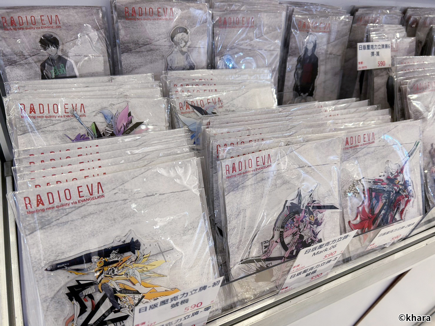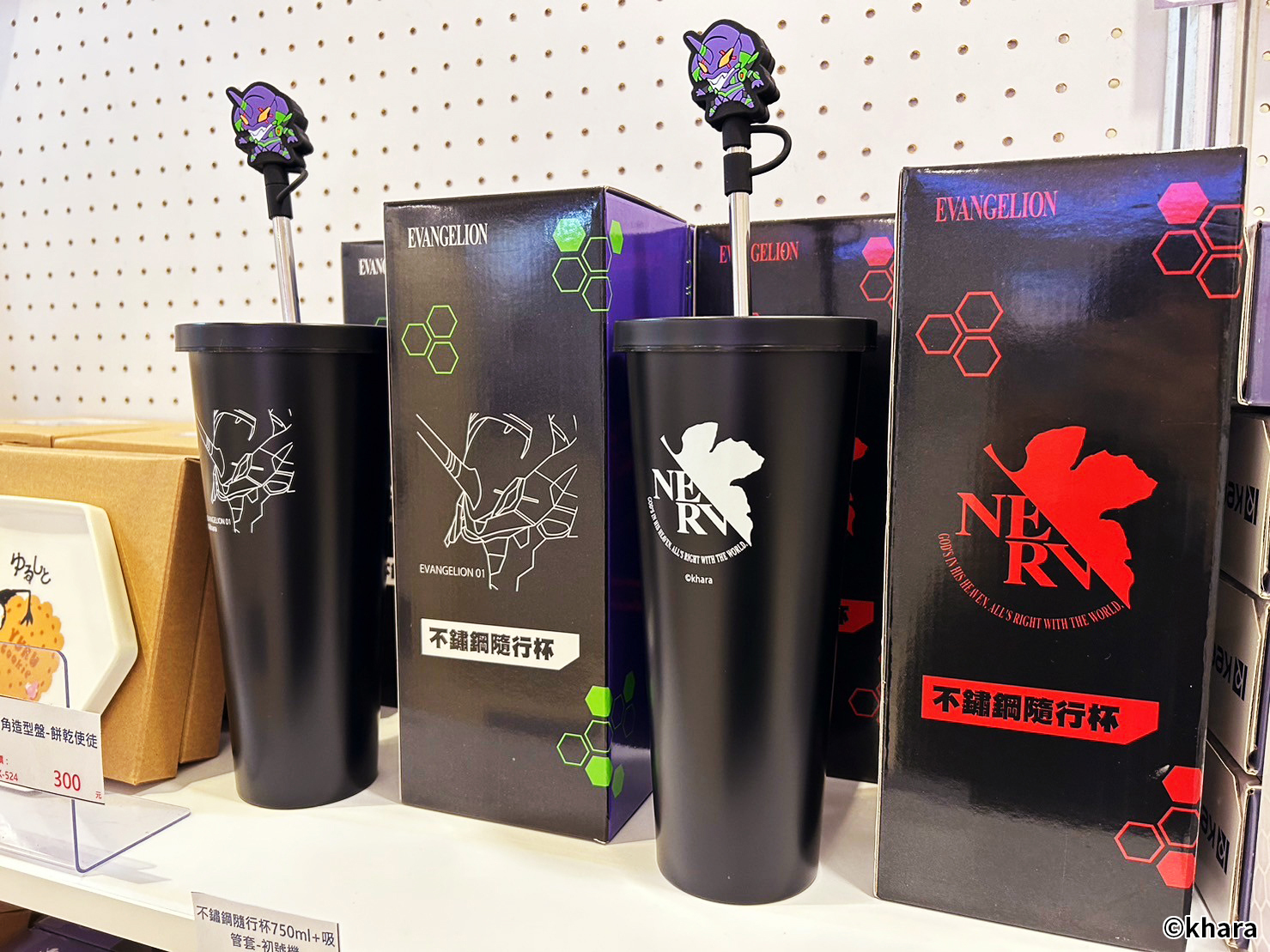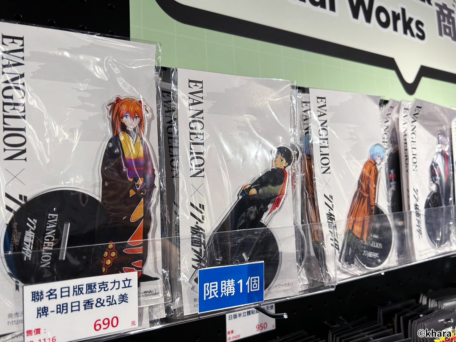 新世紀福音戰士展 VISUAL WORKS 也販售有許多限定商品、周邊精品,包含日版原裝以及台版周邊,還有展覽限定的滿額專屬紀念提袋。在周邊商品部分,還有以 EVA 機體&客製化刻字的金屬軍牌、暱稱「阿水」軟Q可愛的 YURUHSITO 扭蛋印章等紀念小物。還有風味奶酪、L.C.L 柳橙汁,瓶身均有 EVA 元素與機體設計,搭配對應的角色小卡及隨機杯墊。