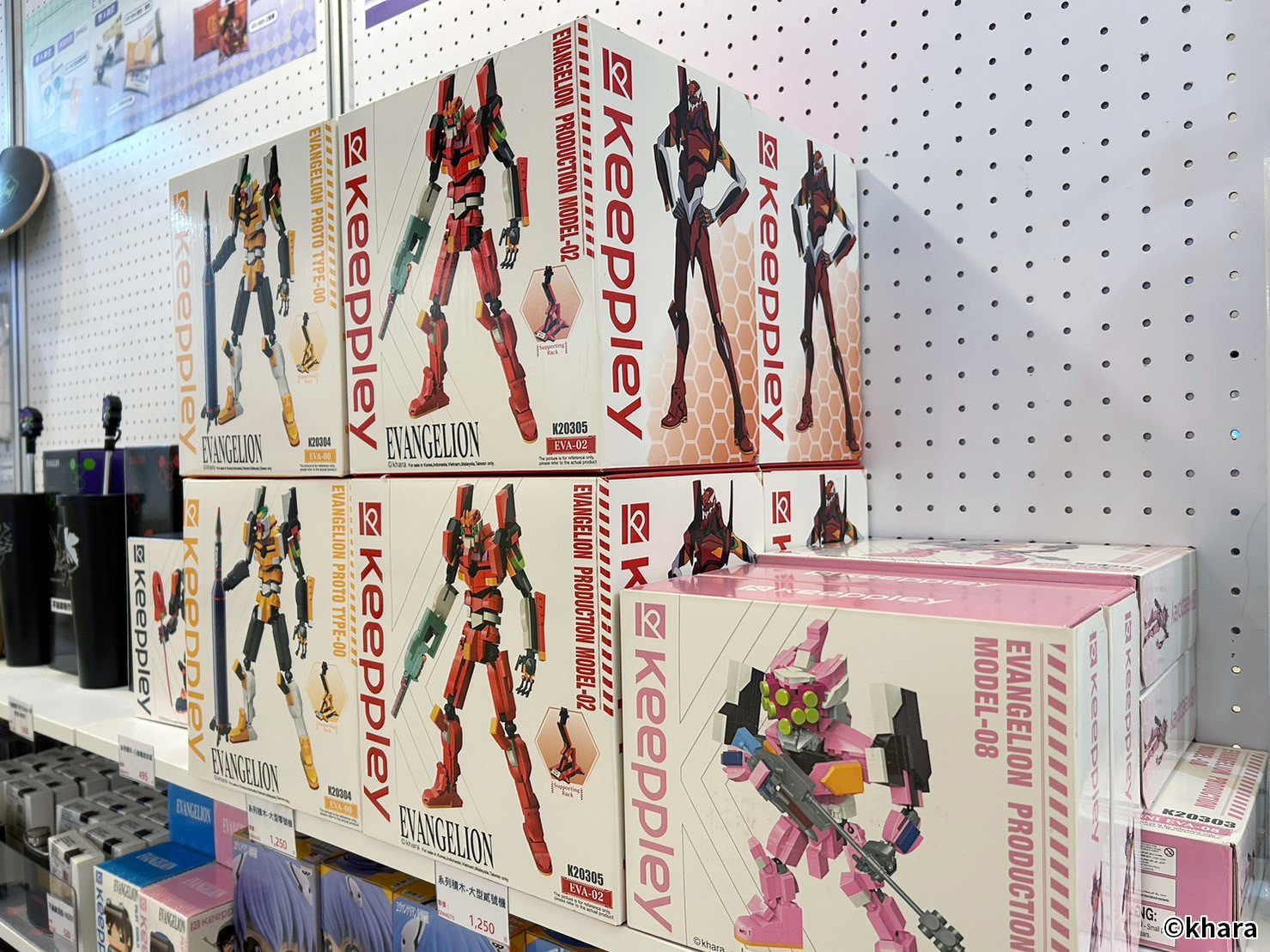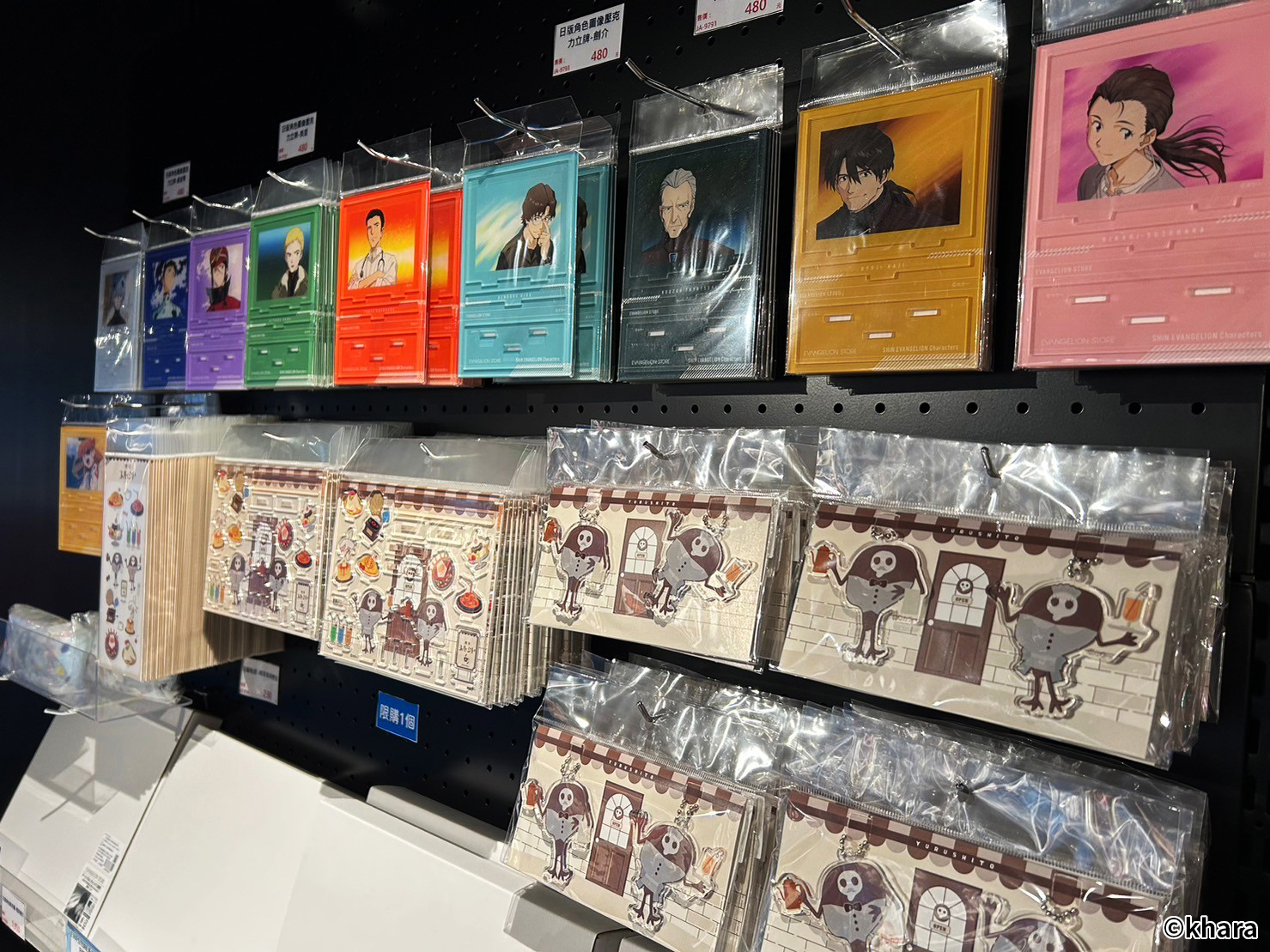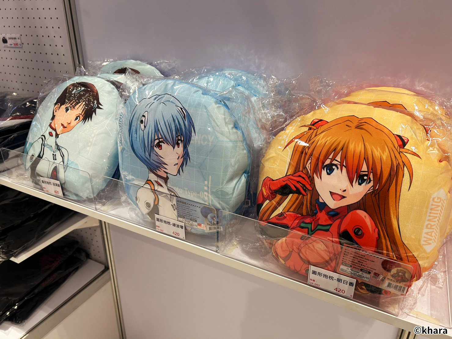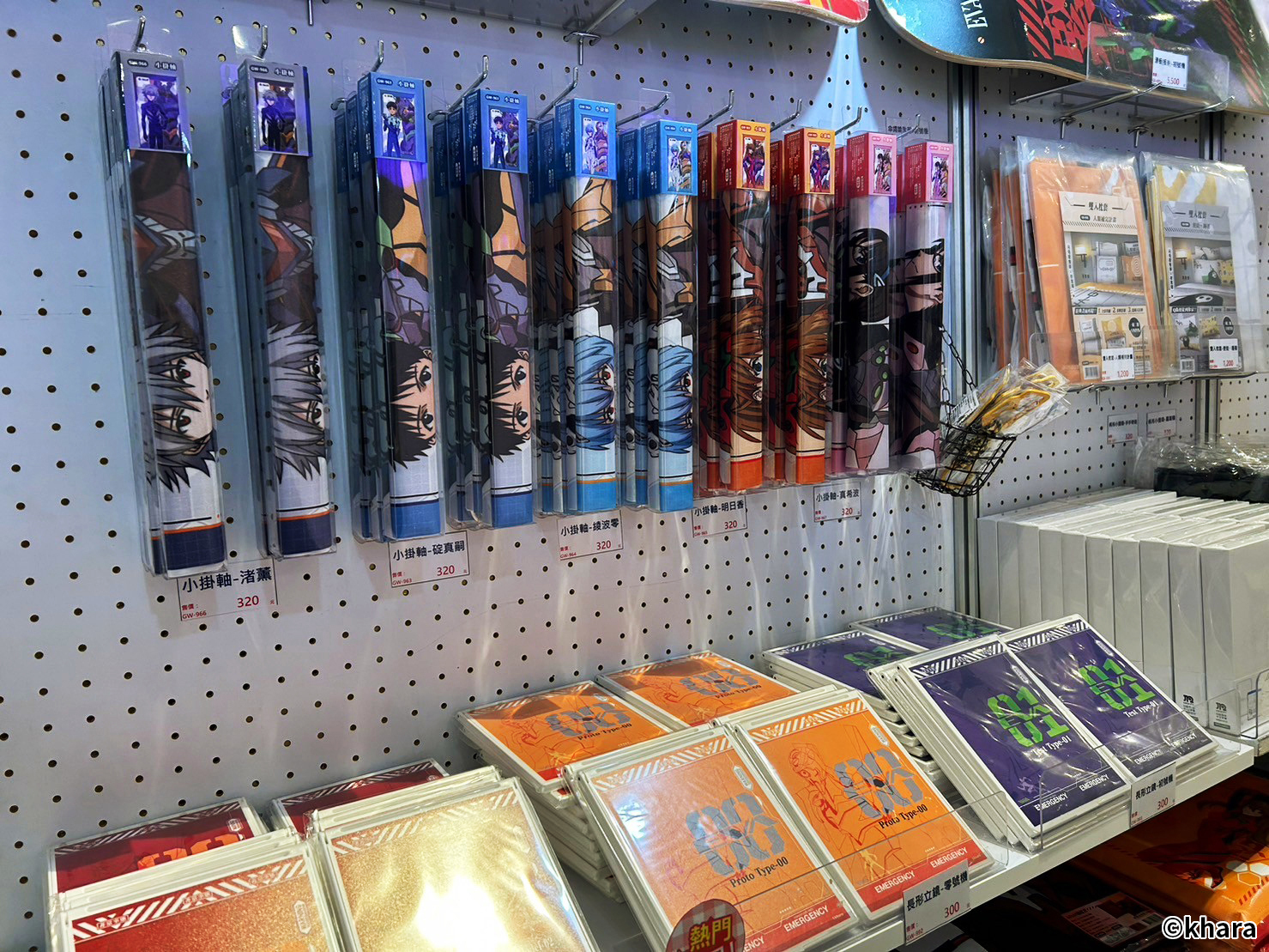 新世紀福音戰士展 VISUAL WORKS 也販售有許多限定商品、周邊精品,包含日版原裝以及台版周邊,還有展覽限定的滿額專屬紀念提袋。在周邊商品部分,還有以 EVA 機體&客製化刻字的金屬軍牌、暱稱「阿水」軟Q可愛的 YURUHSITO 扭蛋印章等紀念小物。還有風味奶酪、L.C.L 柳橙汁,瓶身均有 EVA 元素與機體設計,搭配對應的角色小卡及隨機杯墊。
