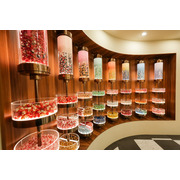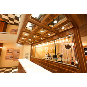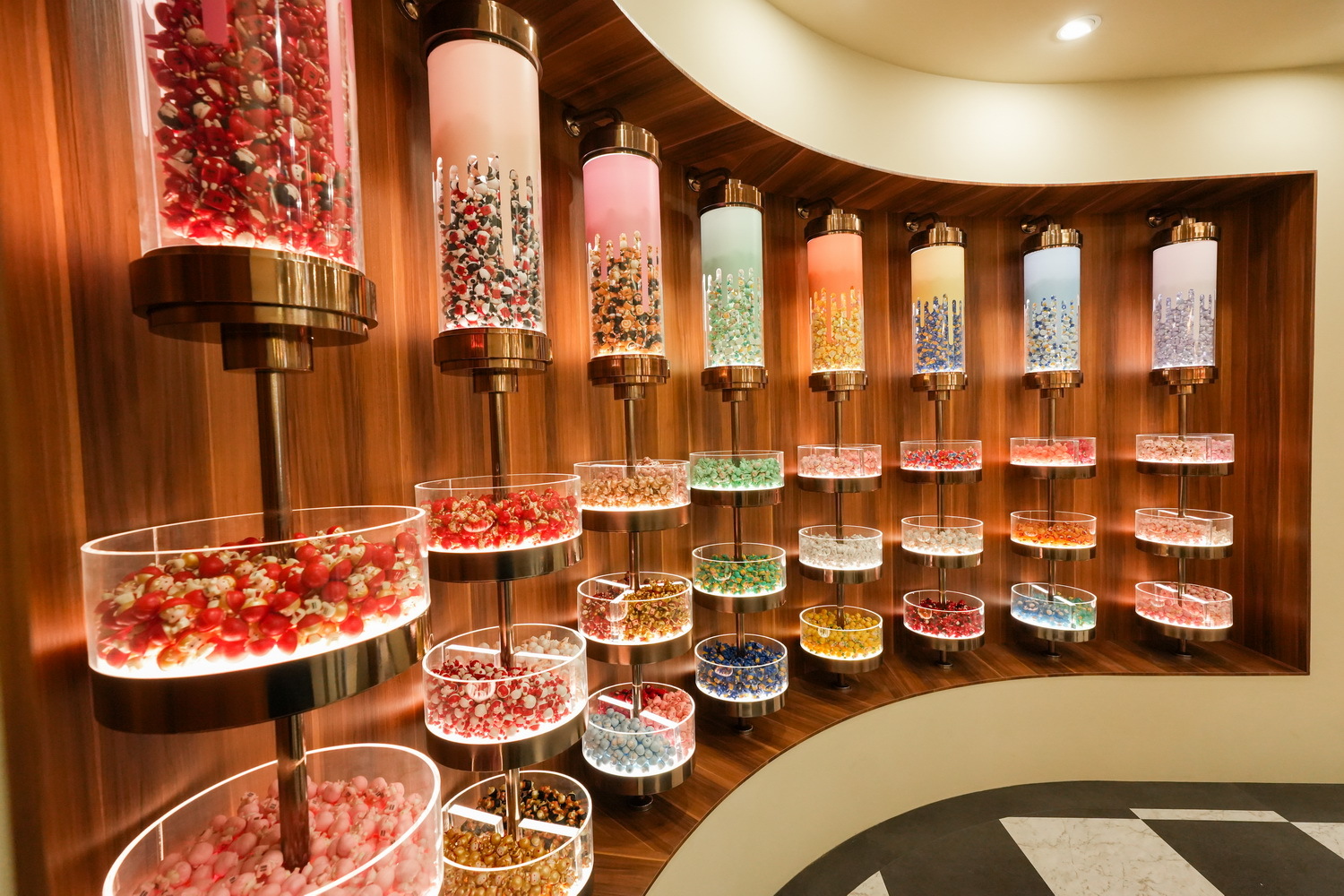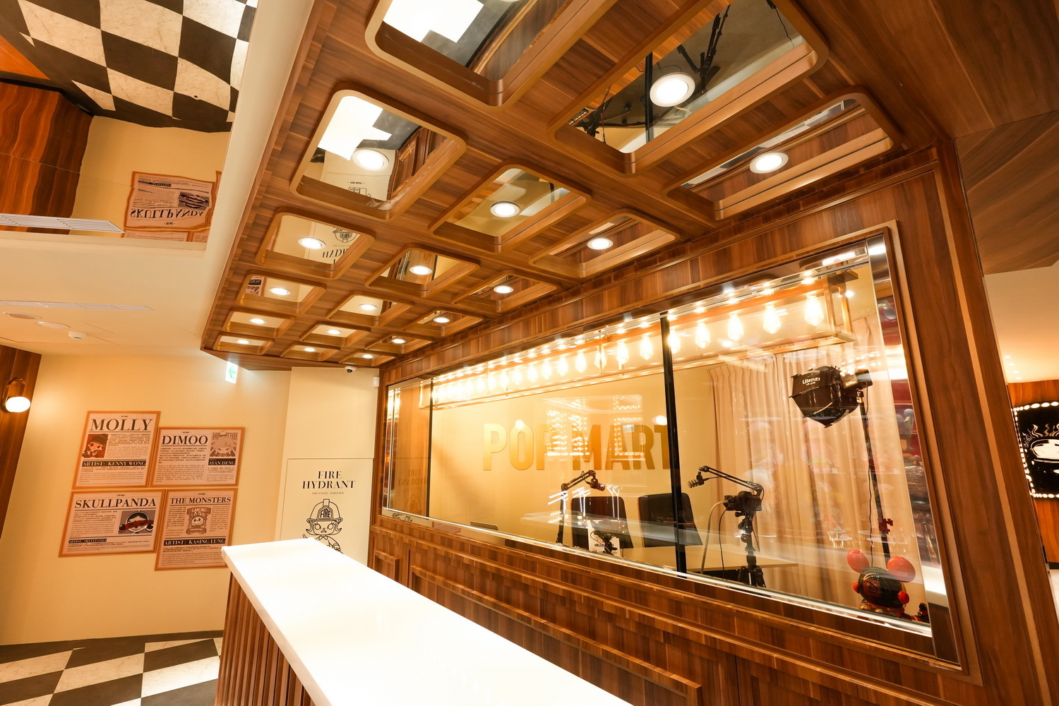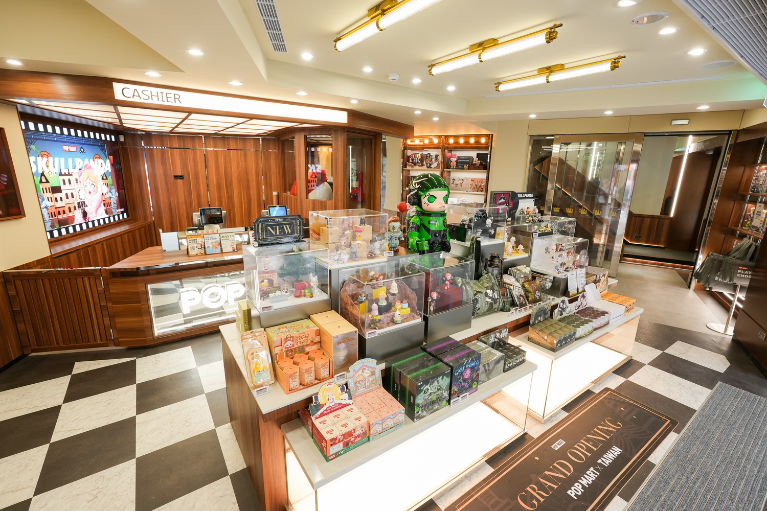 POP MART 西門町旗艦店以復古劇院作為設計概念,一樓門面天花板採用大量燈飾,搭配黑白棋盤格地板及金銅色系裝潢,門市一樓以最新款盲盒商品及西門町旗艦店限定商品迎賓。二樓則以盲盒及大型手辦為主,並且設置全台最大最完整的「萌粒」體驗區,琳瑯滿目的各式萌粒如同糖果一般,展示於透明陳列架,顧客可以選購自己喜歡的造型瓶盛裝。