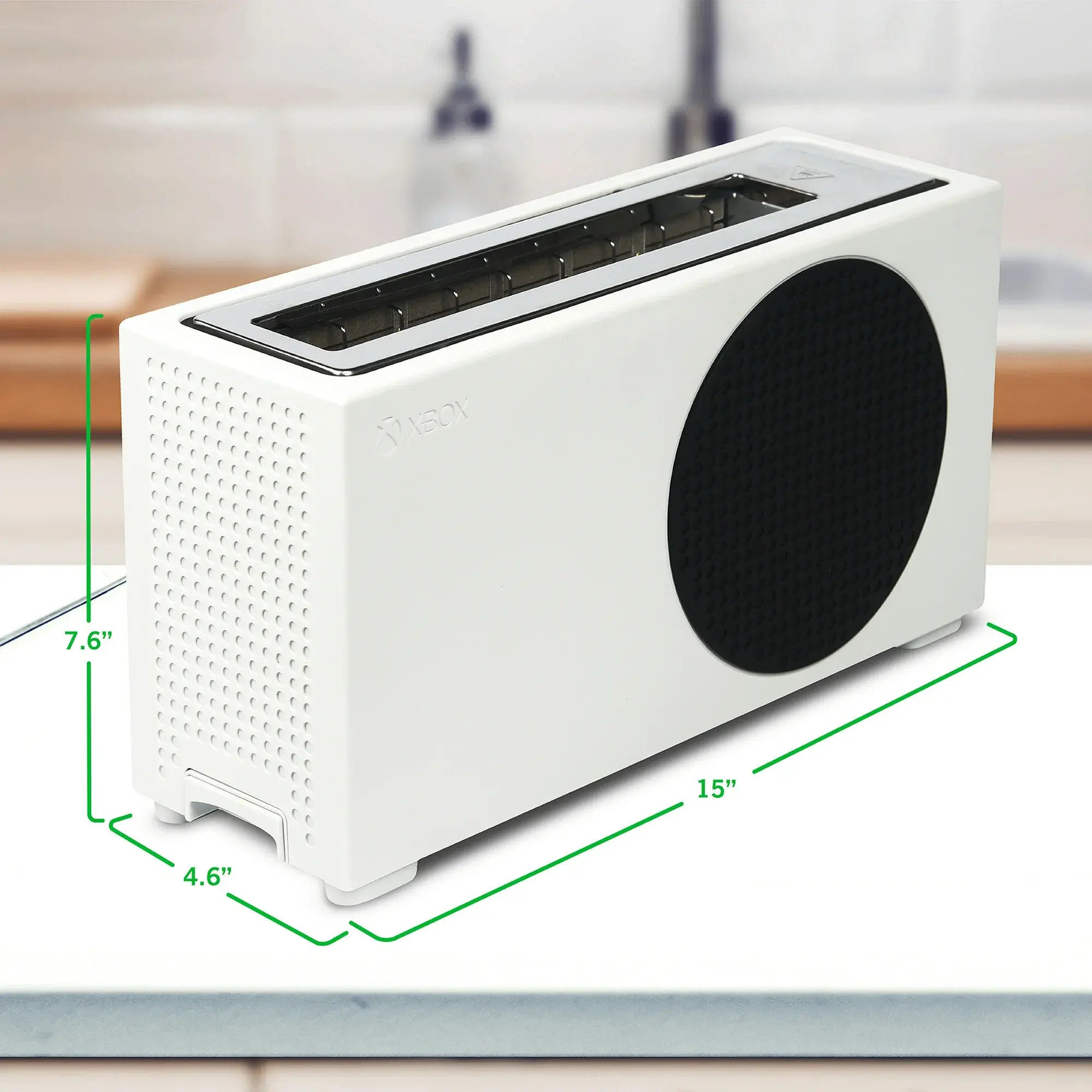 這款烤麵包機活用 Xbox Series S 主機的薄長方體造型來配置加長的烤麵包槽,一次可以烤兩片 12 公分見方的吐司薄片,還可以在麵包上烙印下 Xbox 的標誌。提供 6 段烘烤火力設定與 LED 倒數顯示器,以及一般烘烤、解凍與貝果烘烤 3 種功能設定。具備防堵塞功能、自動溫度控制、可拆卸麵包屑托盤和不沾塗層板。