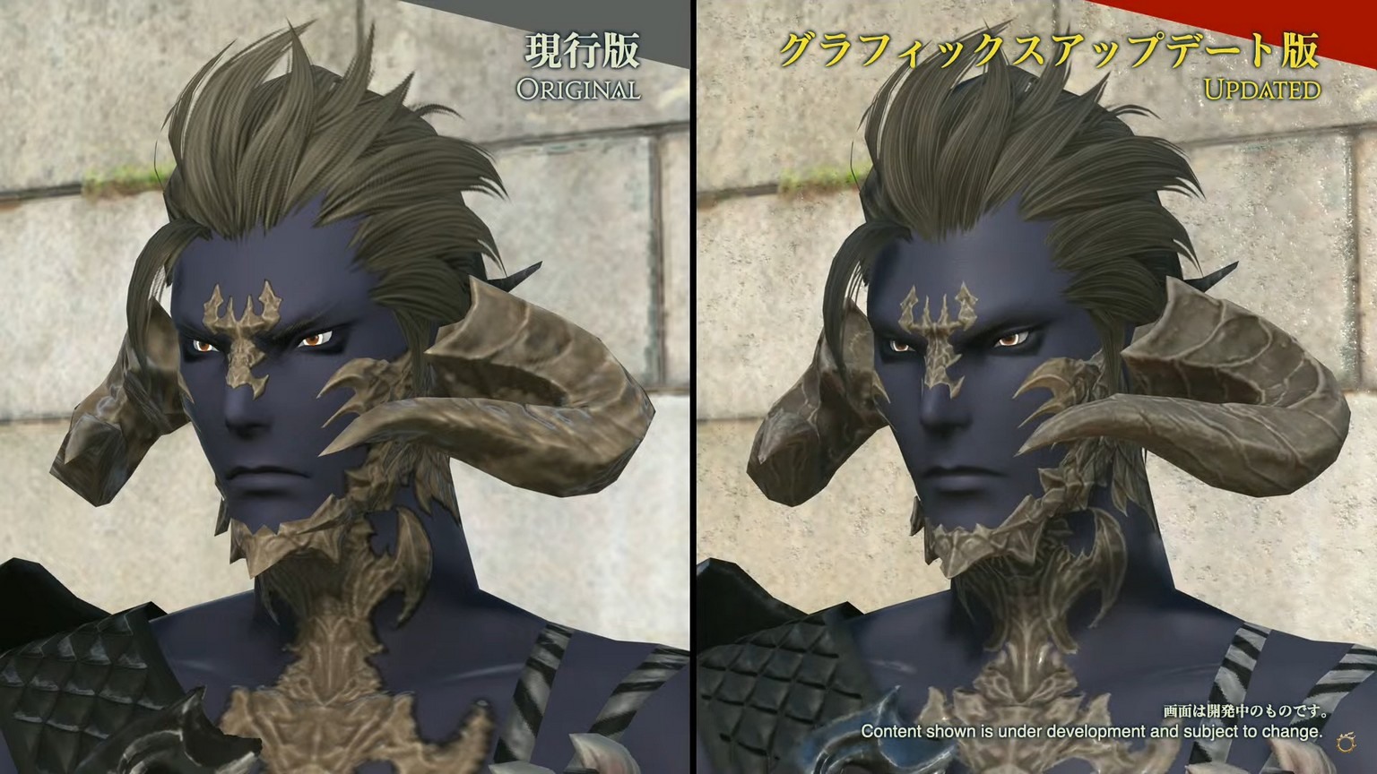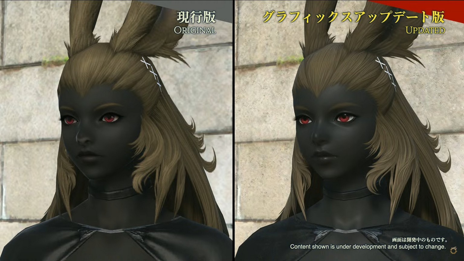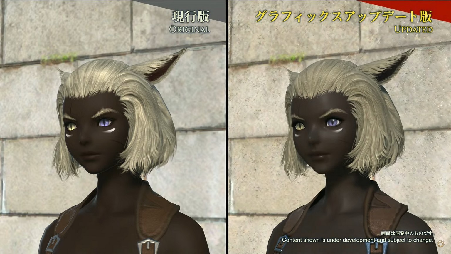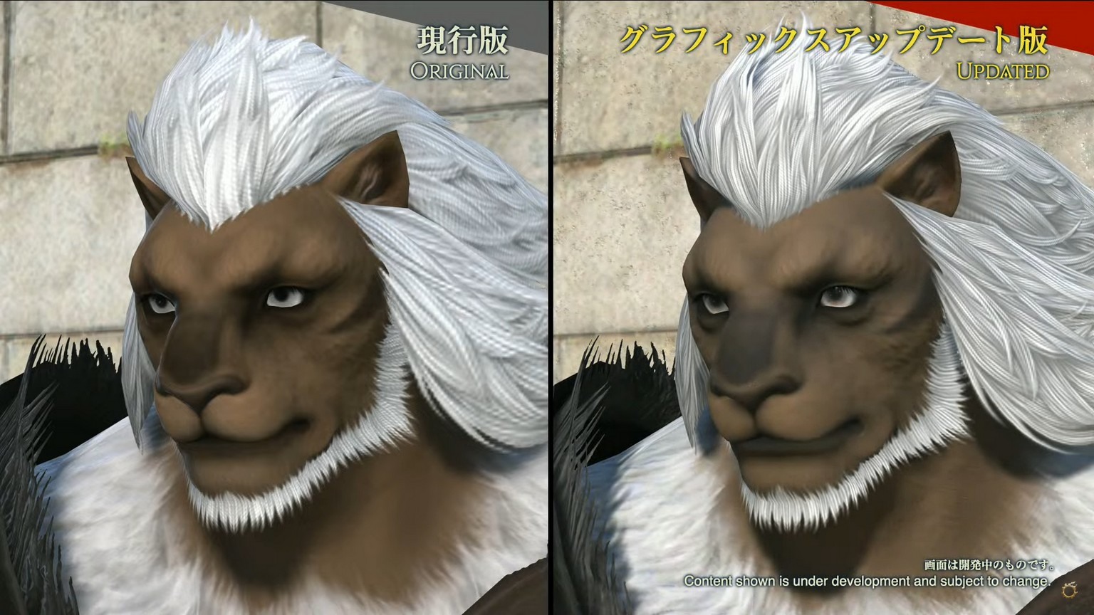 接下來則是報告了預定會伴隨遊戲 7.0 版本更新,進行的第一次遊戲畫面更新的進度。這次主要是以各個種族在更新前後的差別這種方式公開情報。更新目標之一是提昇創角時可以使用的更多不同表現手法,但要以不破壞玩家對各種族抱持的印象作為前提,所以在製作更新的時候都有特別顧慮到這個問題。有些種族乍看之下可能還看不太出來有什麼差別,但仔細一看就會發現在比如說表面質感、光影表現,以及肌膚的細膩程度等等方面的各種細節都有極大幅度的變化。