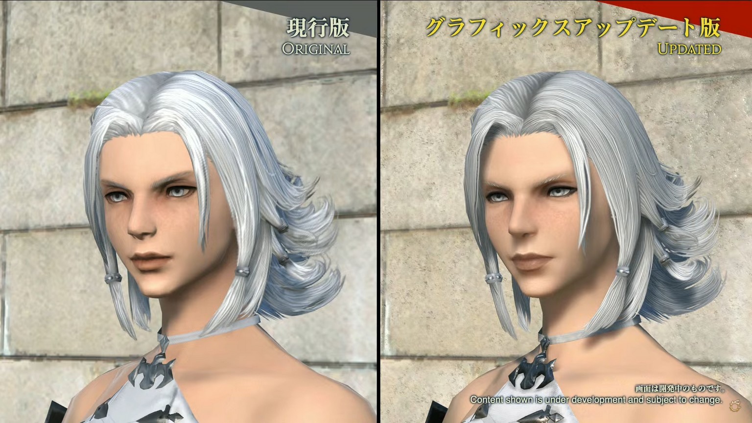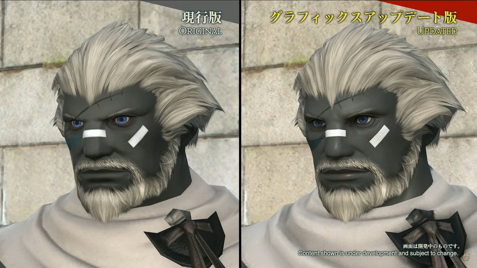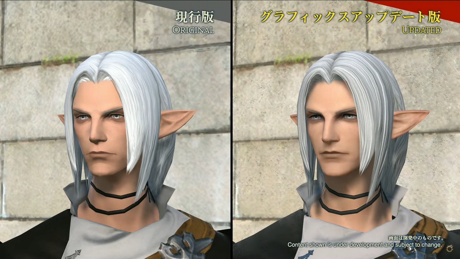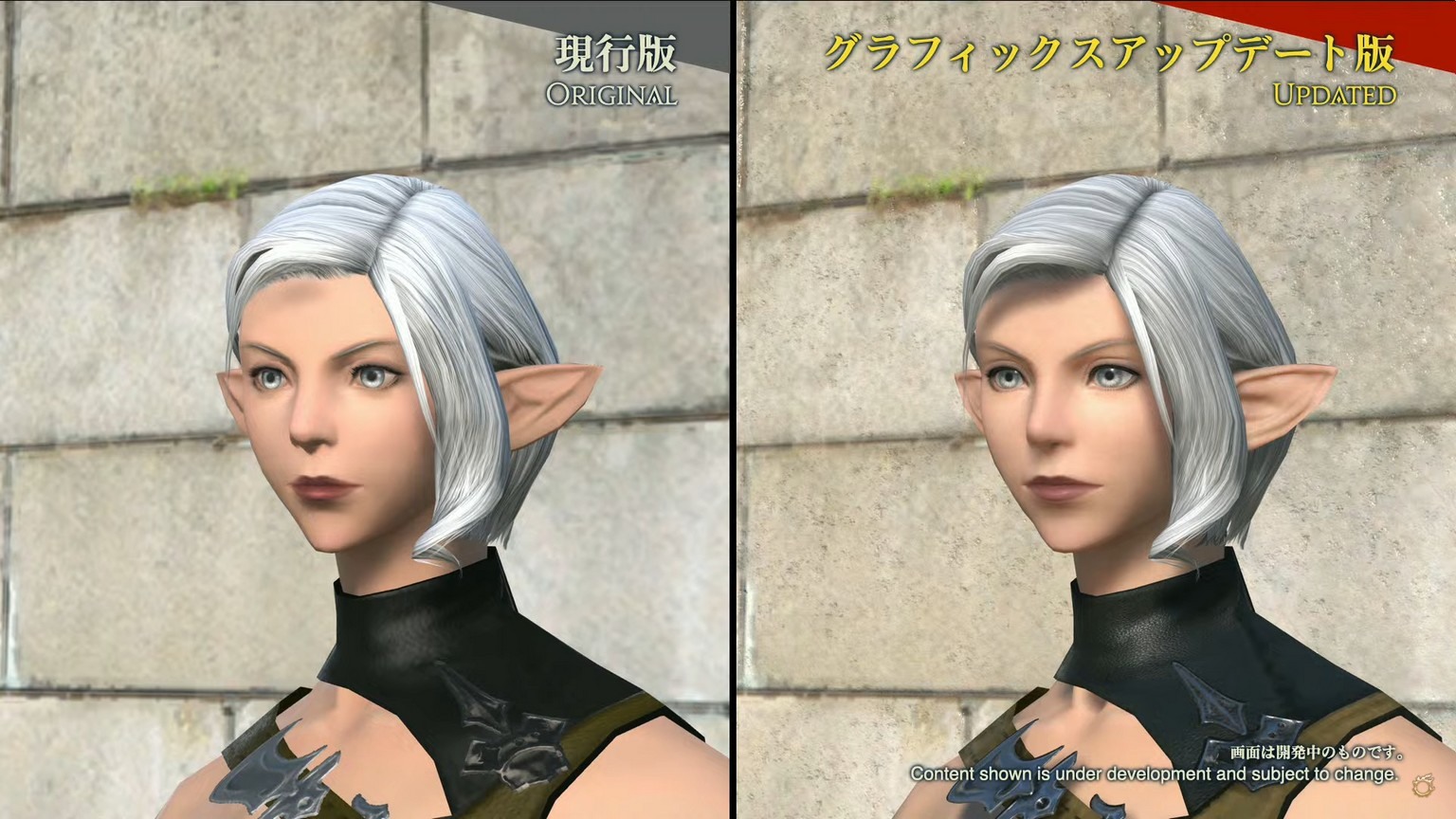 接下來則是報告了預定會伴隨遊戲 7.0 版本更新,進行的第一次遊戲畫面更新的進度。這次主要是以各個種族在更新前後的差別這種方式公開情報。更新目標之一是提昇創角時可以使用的更多不同表現手法,但要以不破壞玩家對各種族抱持的印象作為前提,所以在製作更新的時候都有特別顧慮到這個問題。有些種族乍看之下可能還看不太出來有什麼差別,但仔細一看就會發現在比如說表面質感、光影表現,以及肌膚的細膩程度等等方面的各種細節都有極大幅度的變化。