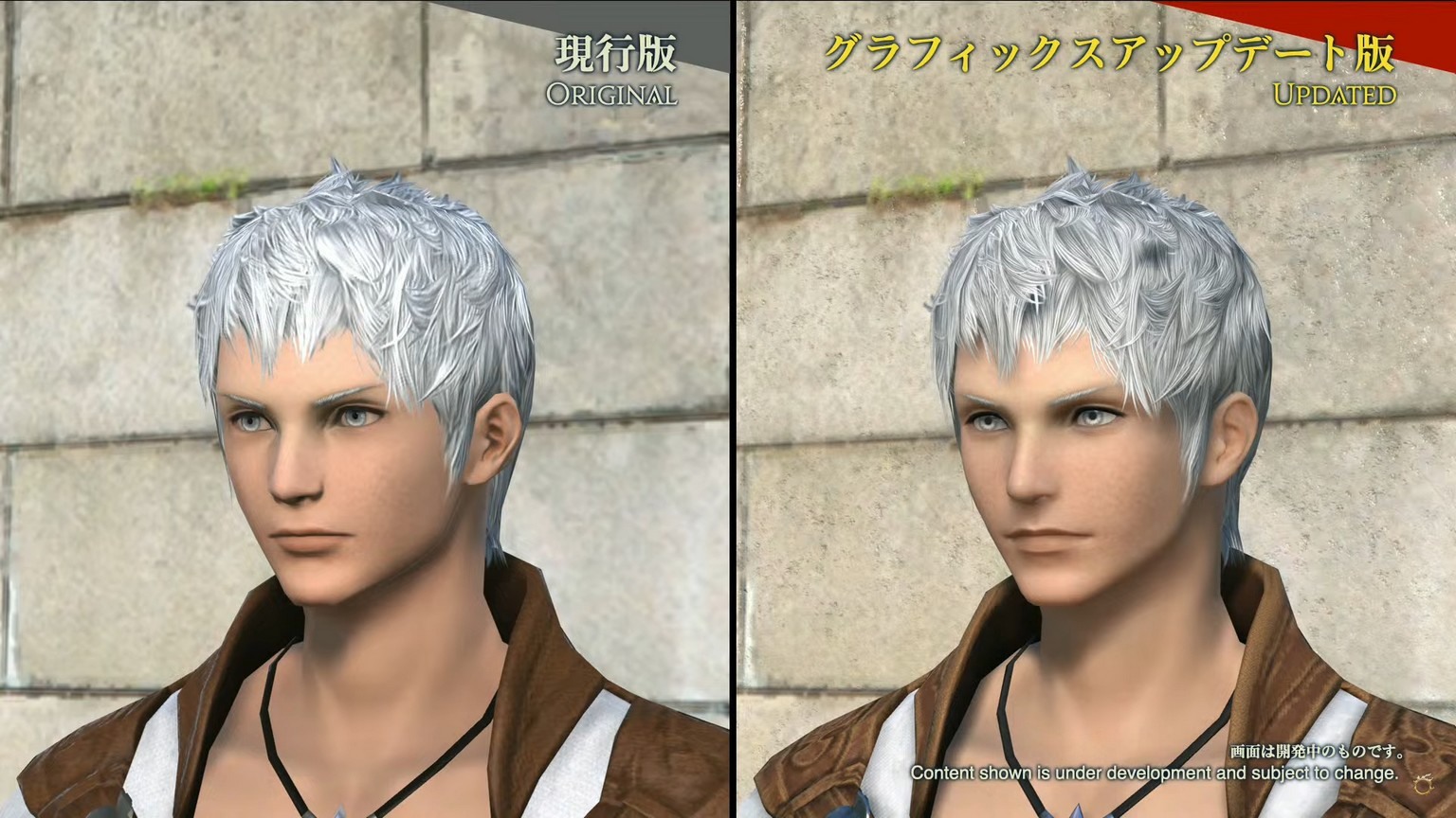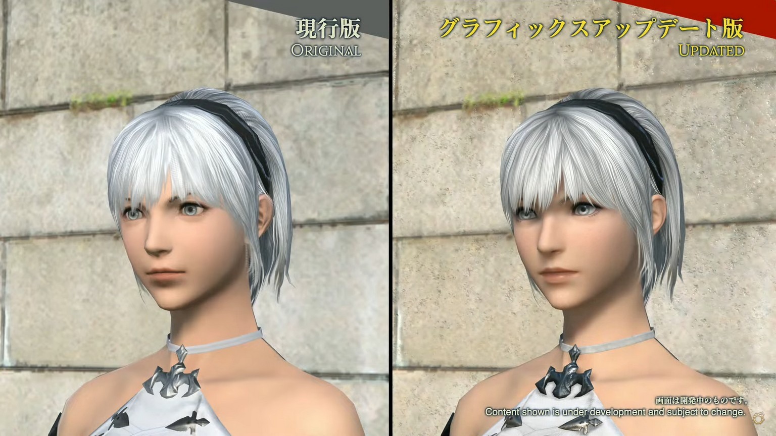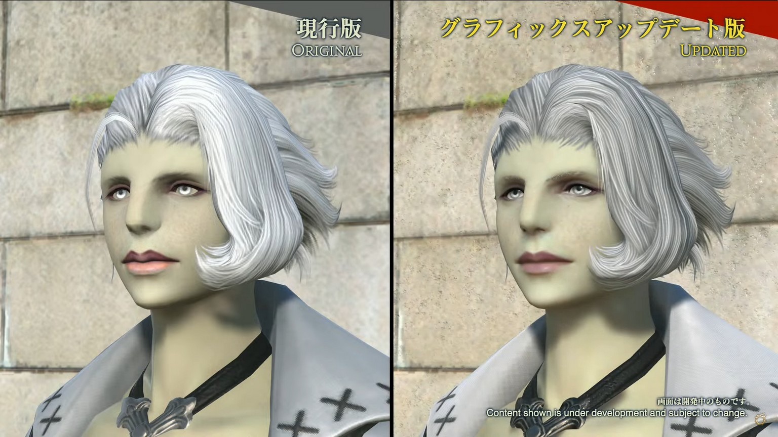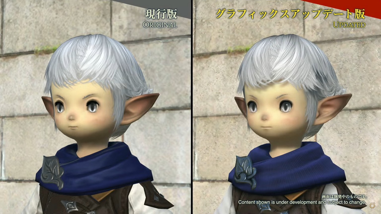接下來則是報告了預定會伴隨遊戲 7.0 版本更新,進行的第一次遊戲畫面更新的進度。這次主要是以各個種族在更新前後的差別這種方式公開情報。更新目標之一是提昇創角時可以使用的更多不同表現手法,但要以不破壞玩家對各種族抱持的印象作為前提,所以在製作更新的時候都有特別顧慮到這個問題。有些種族乍看之下可能還看不太出來有什麼差別,但仔細一看就會發現在比如說表面質感、光影表現,以及肌膚的細膩程度等等方面的各種細節都有極大幅度的變化。
