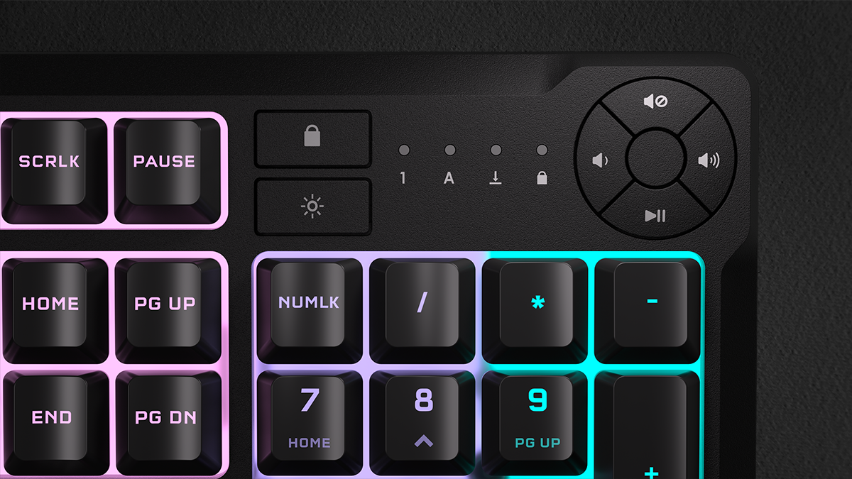 K55 CORE 為遊戲對戰帶來所需的各種功能和能力。專用 Win Lock 可防止您意外按下 Windows 鍵破壞連擊,您只需輕點按鈕即可調整 RGB 亮度。12 按鍵翻轉可確保您以 1,000 Hz 的快速輪詢率完成最抓狂的按鍵操作。