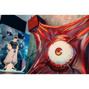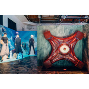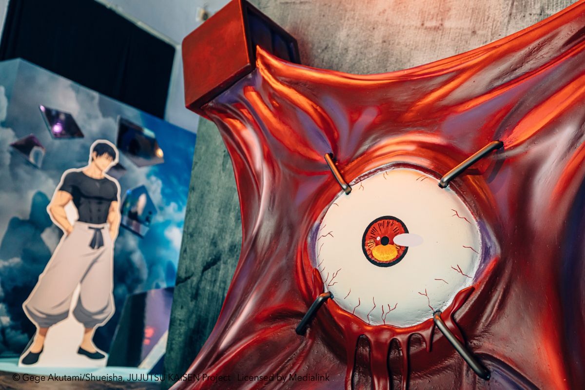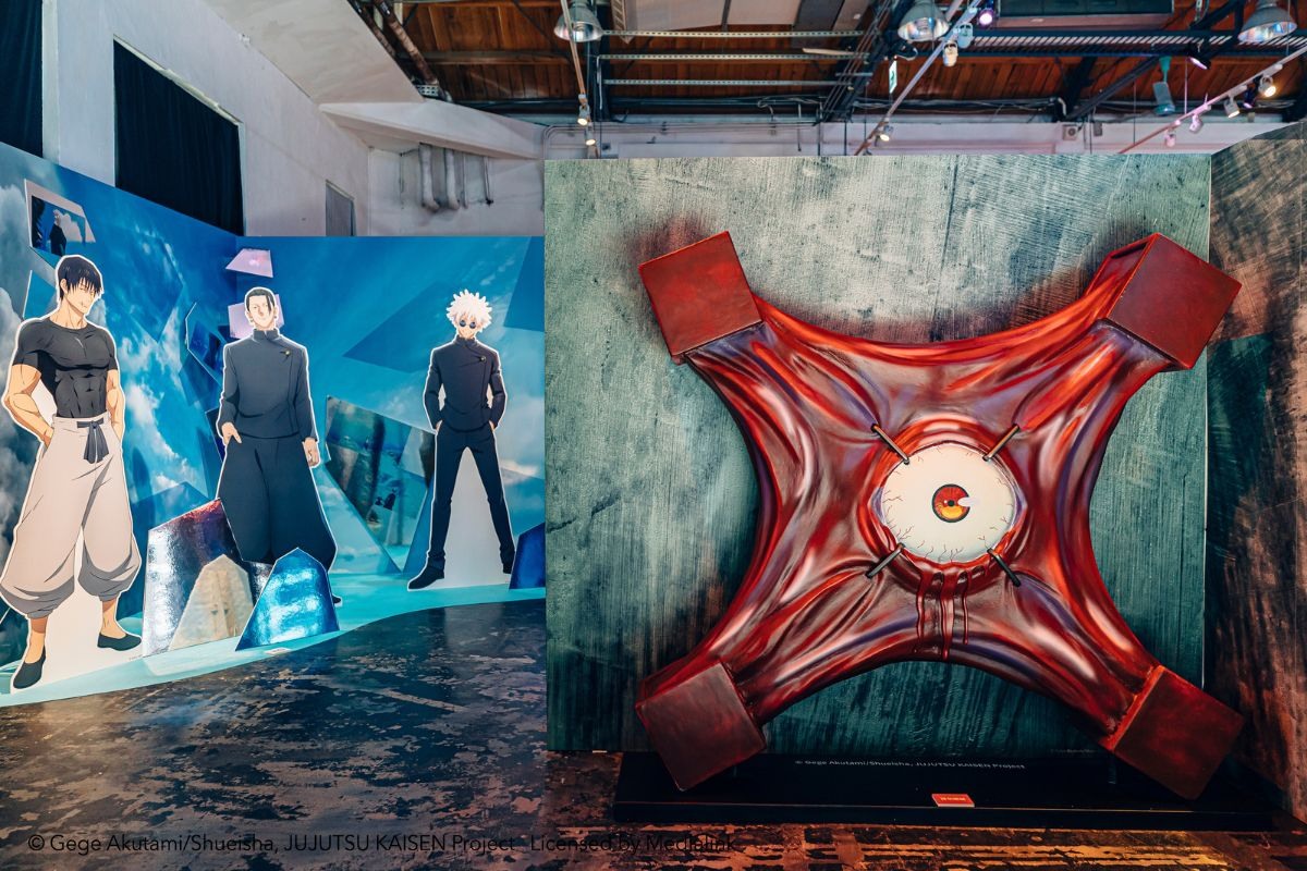 台北華山場所 1:1 打造成五條悟的封印之地-獄門疆,高達 180 公分的獄門疆營造出一種深沉神秘的氛圍。而在台中場,主辦單位活用臺中驛鐵道文創園區中的鐵道特色,呼應澀谷車站情節,打造一眼望不盡的 13 米長主視覺長廊,將整個「懷玉、玉折篇」與「澀谷事變篇」場景一覽無遺。巨大的牆面不僅呈現出「懷玉、玉折篇」的藍天背景青春氣息,還還原了「澀谷事變篇」全員奮力一戰的震撼場面。
