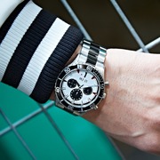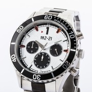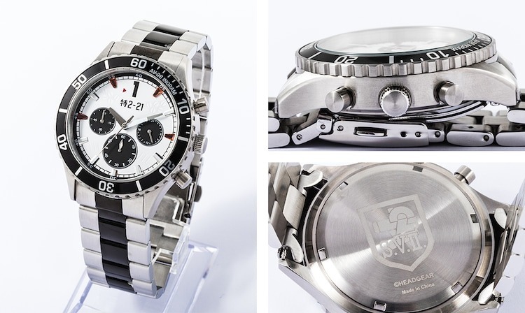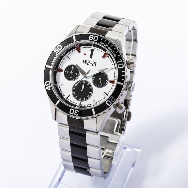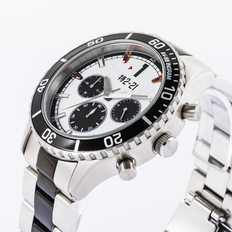 機動警察》AV-98 英格蘭姆 1 號機聯名腕錶,整體配色就是以英格蘭姆的機體造型出發,除了可以看到外框上有著「AV-98 INGRAM」外,錶盤的 1、3、9、11 點鐘方向則是以紅色的透明材質象徵著警示燈,而在錶盤中間有著「特 2-21」的編號,指針則是配合英格蘭姆頭部造型進行設計。