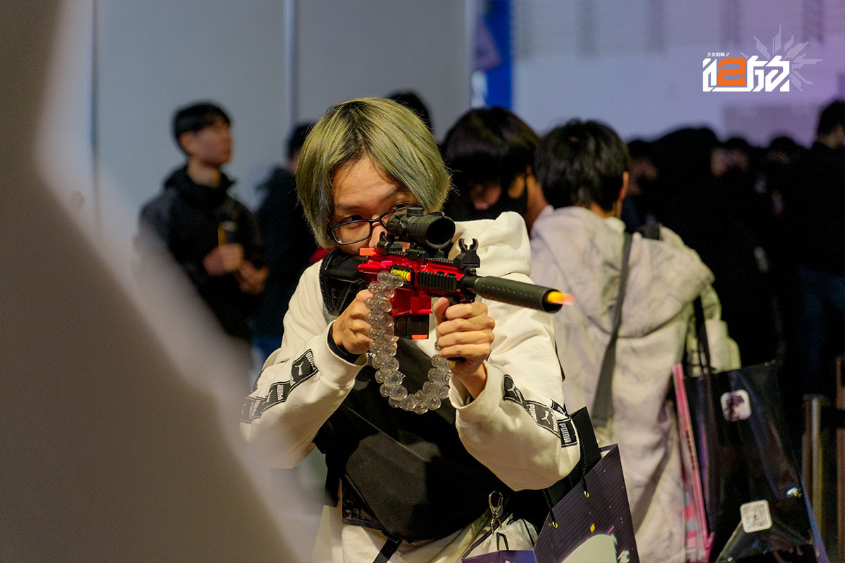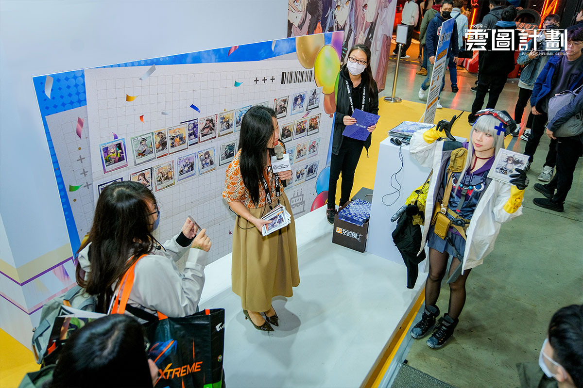 少女前線 2:追放》作為其 IP 系列的最新力作,官方於現場以遊戲中的場景打造多靶位的射擊遊戲區,重現遊戲中多位人形需同時在戰鬥場景中與敵方戰鬥的遊戲設定。於此同時,官方邀約知名 Coser 演繹首波宣傳即獲得高人氣的人形角色「維普蕾」、「閃電」和「克羅麗科」,到場的玩家們可邀約人形一起使用拍貼機作紀念。