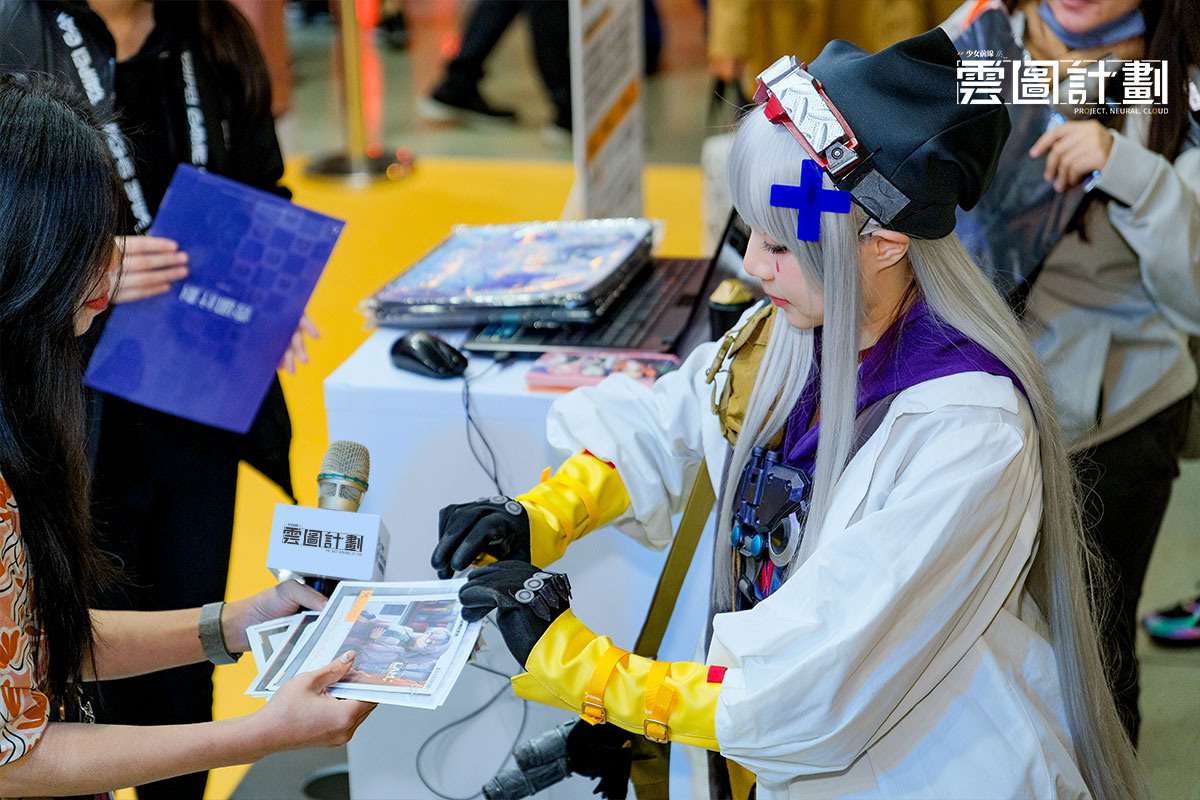 雲圖計劃》不僅提供每一位到場簽到的玩家紀念贈禮,每天的互動遊戲環節更是送出許多精美周邊贈禮。不僅考驗玩家們對於遊戲設定的了解,還考驗對於人形們的熟悉度,現場除了手機連線答題的遊戲外,也新穎地使用特製的角色生日牌卡進行互動遊戲,現場氣氛相當溫馨熱鬧。