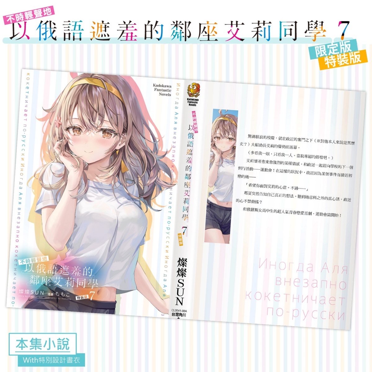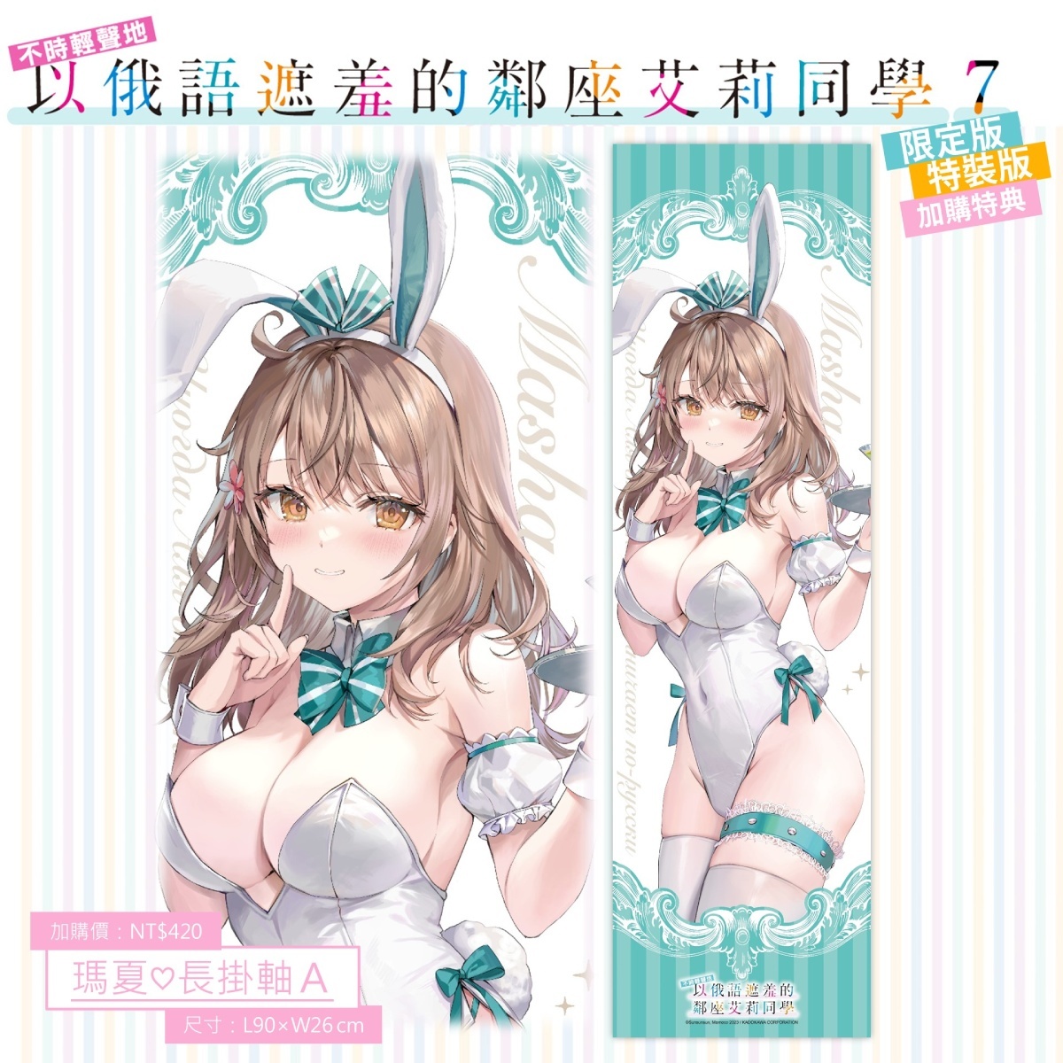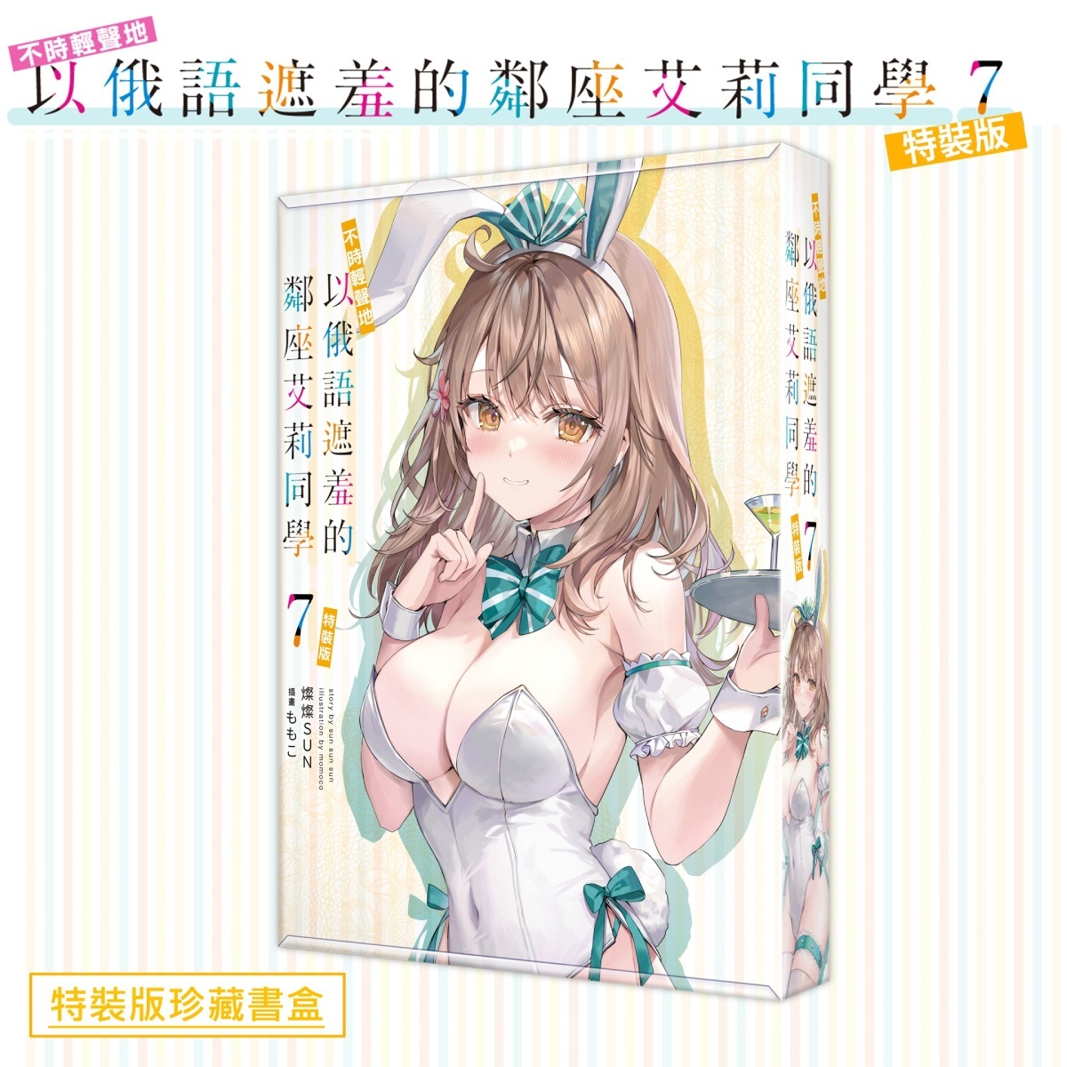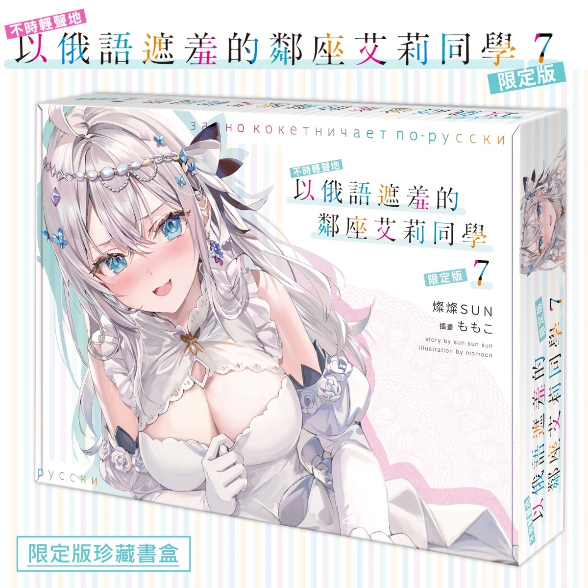不時輕聲地以俄語遮羞的鄰座艾莉同學(7)》限定版收錄特典:「公主艾莉♡掛軸」、「哥德羅莉艾莉♡滑鼠墊」;特裝版特典:「瑪夏♡雙面抱枕套」、「艾莉&瑪夏♡方形徽章組」,雙版本皆收錄「本集小說With特別設計書衣」及「珍藏書盒」。凡預購/購買特裝及限定版,皆可以加購限定特典「瑪夏♡長掛軸A(台灣角川限定)」及「相機風壓克力鑰匙圈 A」。限定版將於台灣角川會場與官網獨家販售;特裝版自即日起開放事前預購至 2/19(一),於官網完成預購再加碼贈送一萬點紅利點數(每會員限兌換乙次)。