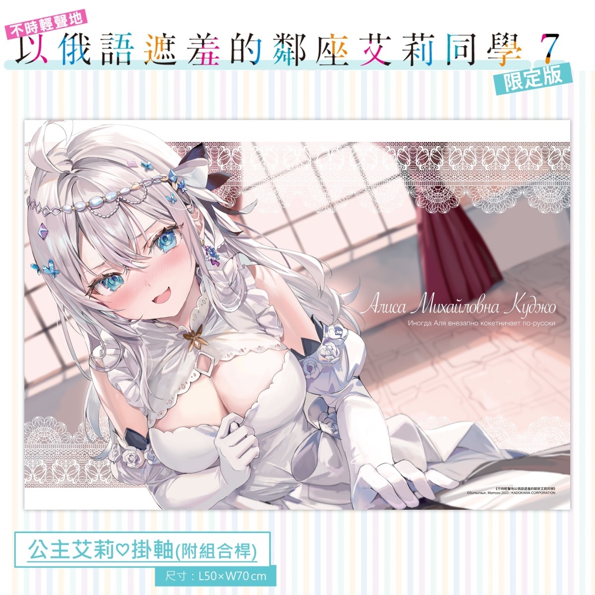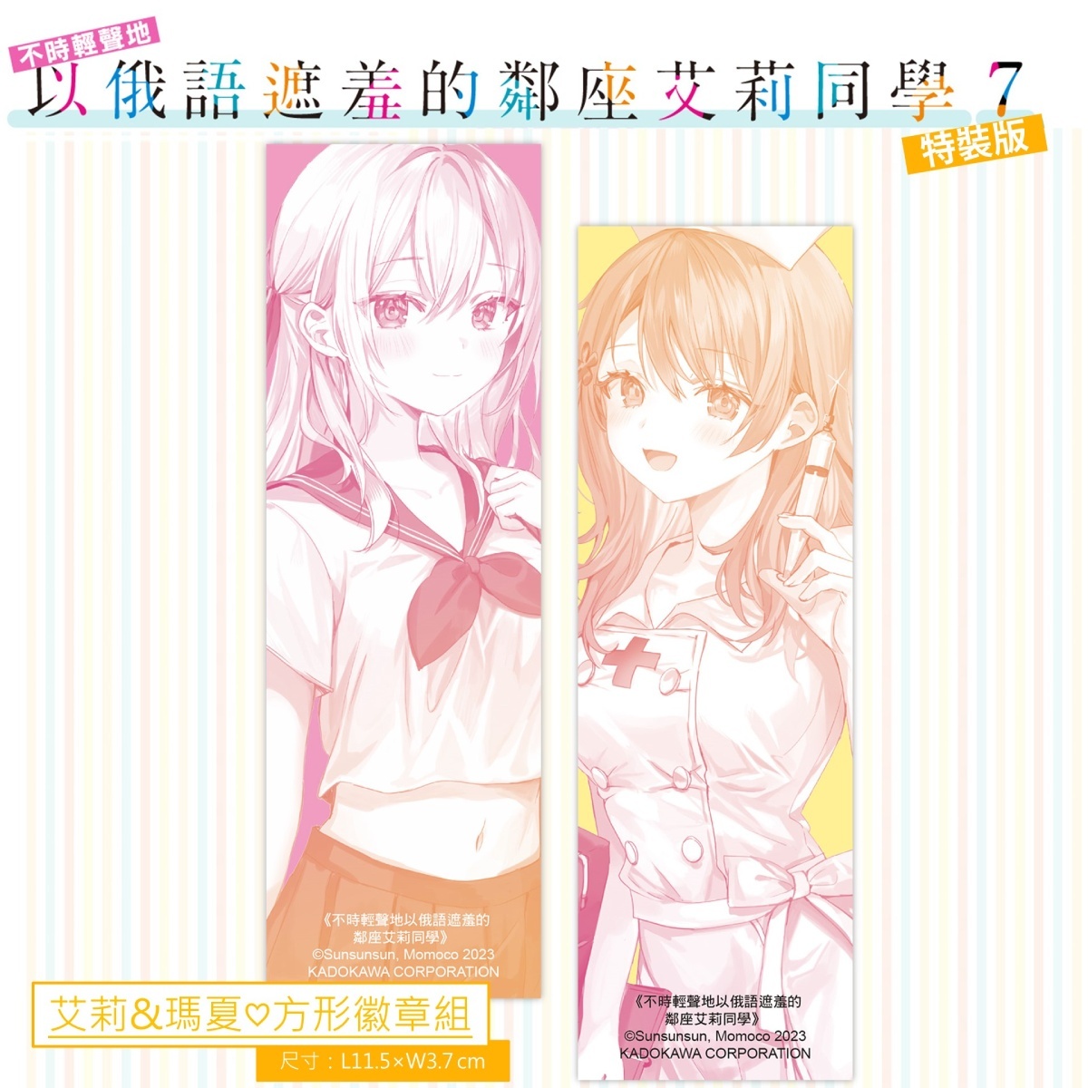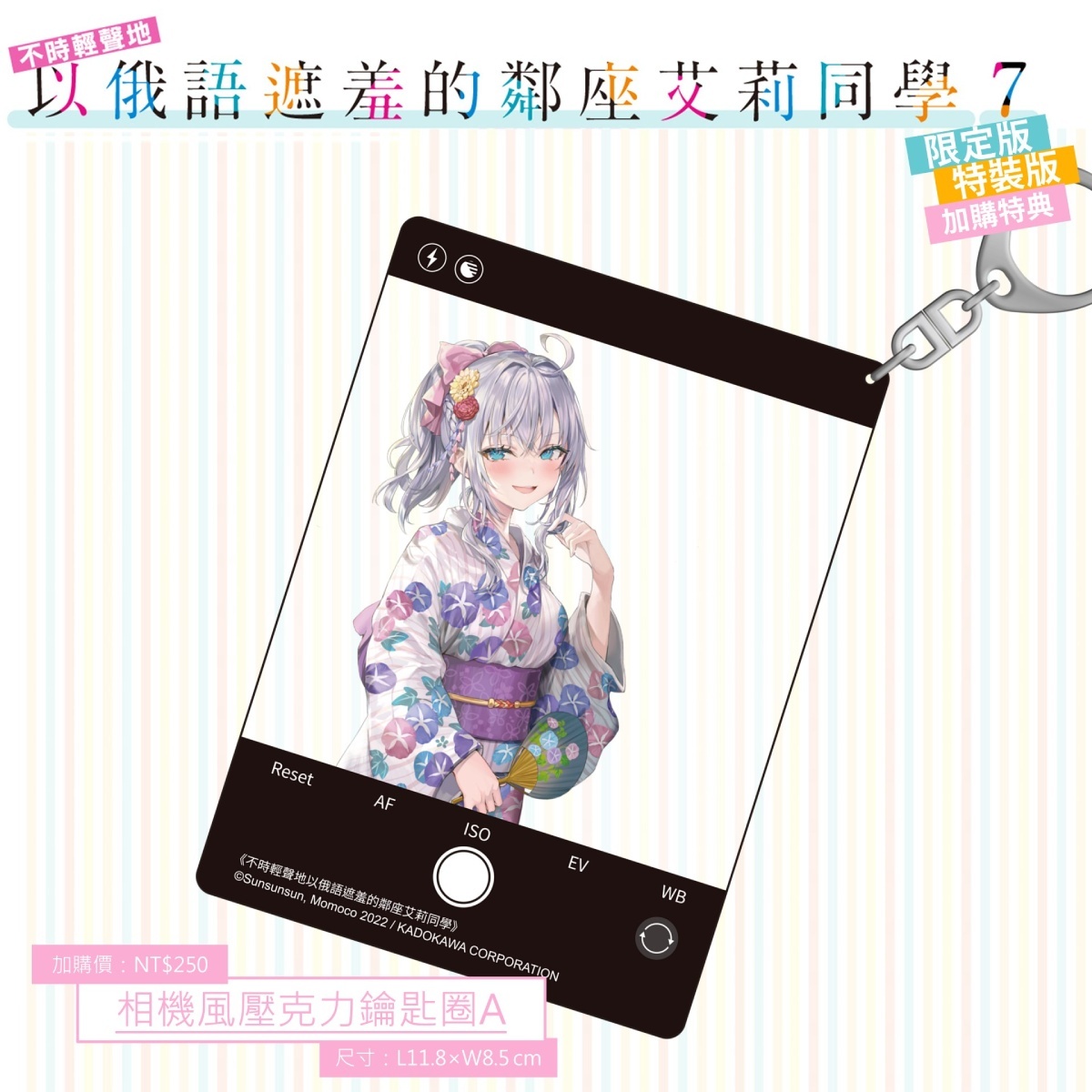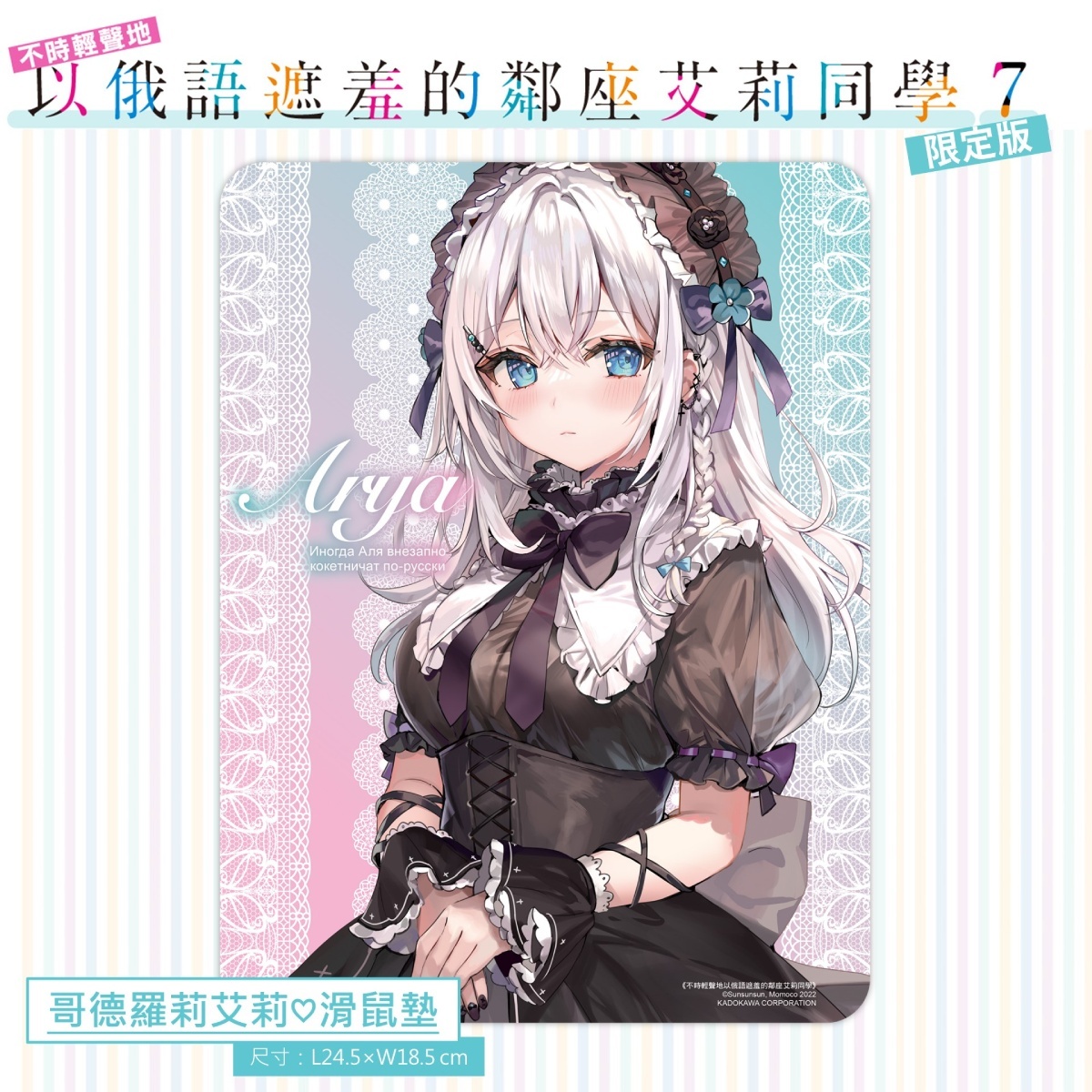 不時輕聲地以俄語遮羞的鄰座艾莉同學(7)》限定版收錄特典:「公主艾莉♡掛軸」、「哥德羅莉艾莉♡滑鼠墊」;特裝版特典:「瑪夏♡雙面抱枕套」、「艾莉&瑪夏♡方形徽章組」,雙版本皆收錄「本集小說With特別設計書衣」及「珍藏書盒」。凡預購/購買特裝及限定版,皆可以加購限定特典「瑪夏♡長掛軸A(台灣角川限定)」及「相機風壓克力鑰匙圈 A」。限定版將於台灣角川會場與官網獨家販售;特裝版自即日起開放事前預購至 2/19(一),於官網完成預購再加碼贈送一萬點紅利點數(每會員限兌換乙次)。