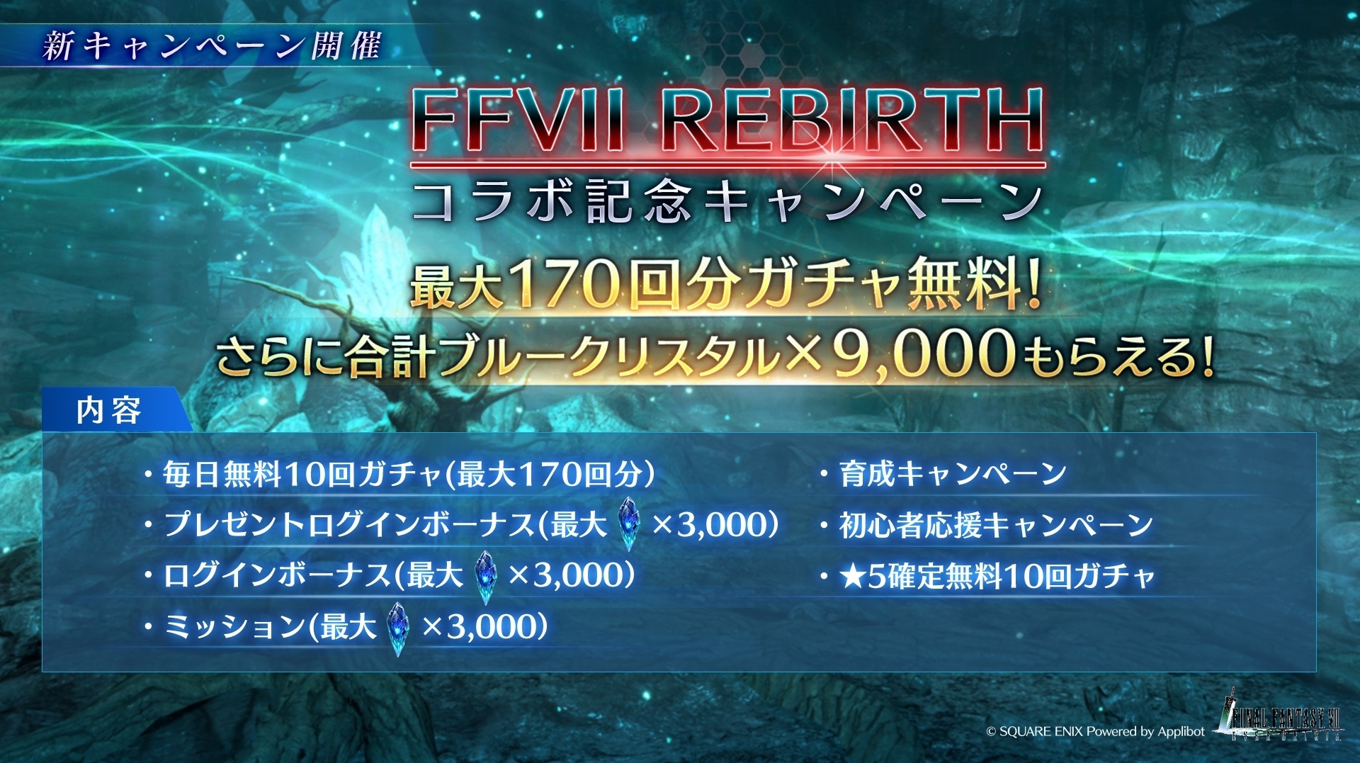 在合作活動「英雄賽菲羅斯 - 序幕(英雄セフィロス ― プロローグ)」中,玩家可以體驗賽菲羅斯和克勞德前往調查魔晄爐的故事。 此外,目前正在舉辦可獲得新首頁背景的活動任務、最多可抽取 170 次的免費扭蛋以及可獲得「藍水晶×9000」的活動。