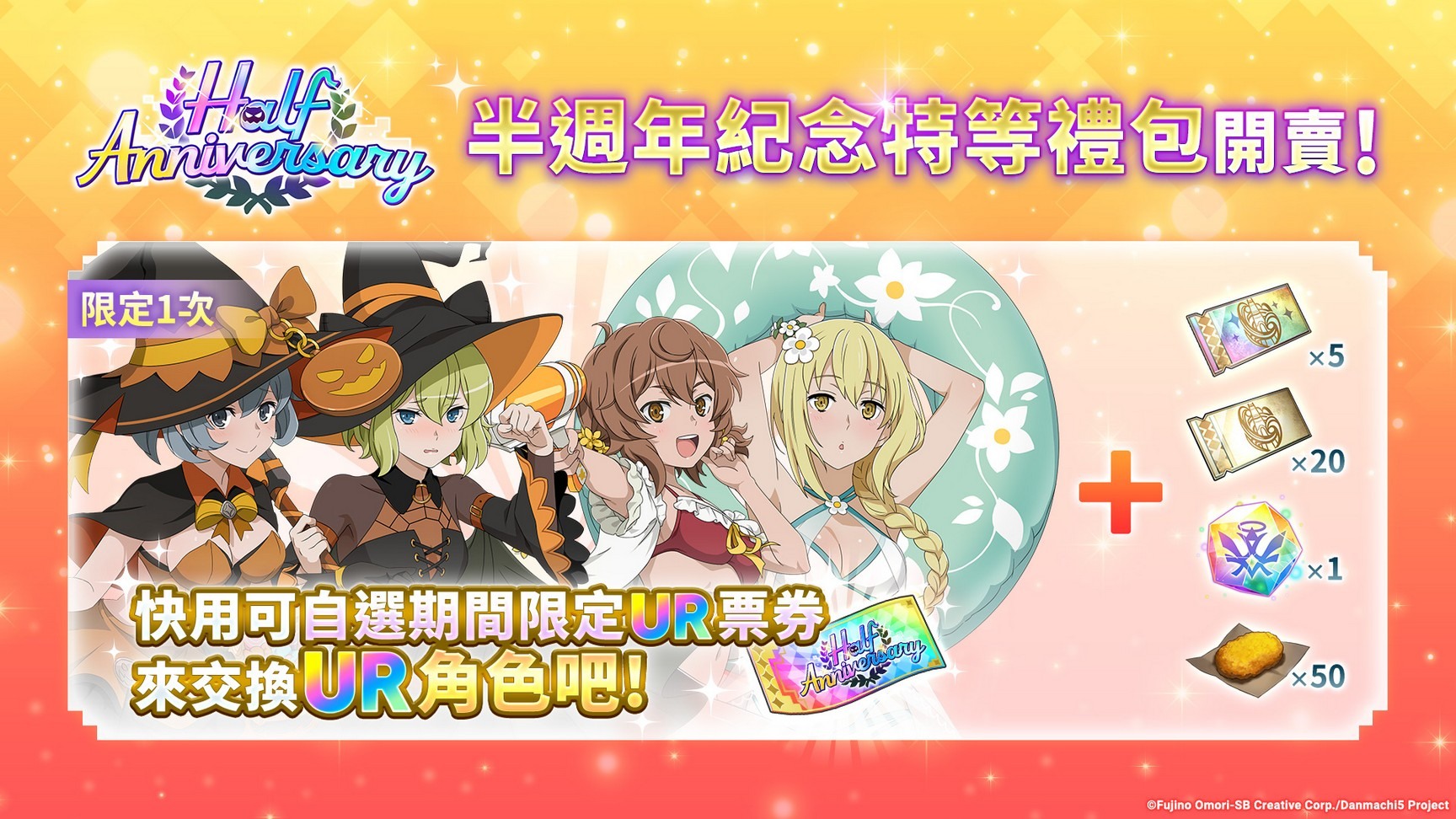 將販售多款半周年限定禮包,內含可兌換 2023 年 10 月 31 日前登場 UR 角色的「【0.5 週年紀念】可自選期間限定 UR 角色確定轉蛋票券」或是「UR 角色確定轉蛋票券」等超值商品。