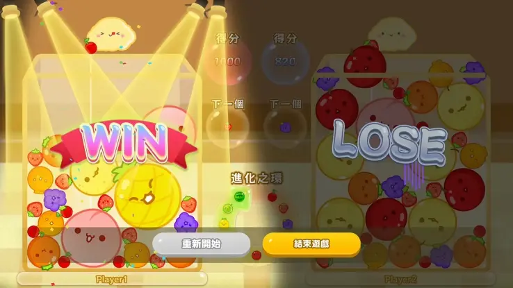 「攻擊模式」裡,讓對手遊戲結束的玩家就能獲勝。每第 5 次合成,玩家可以將「合成」的水果送到對手的盒子裡,快來送大水果給對手吧!