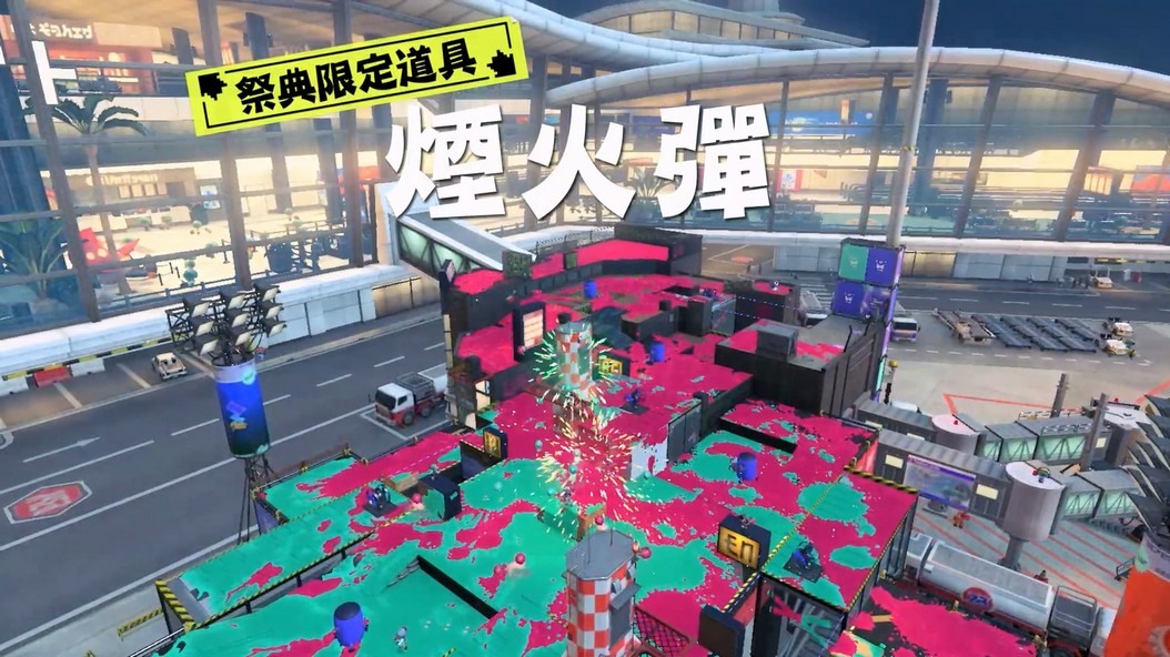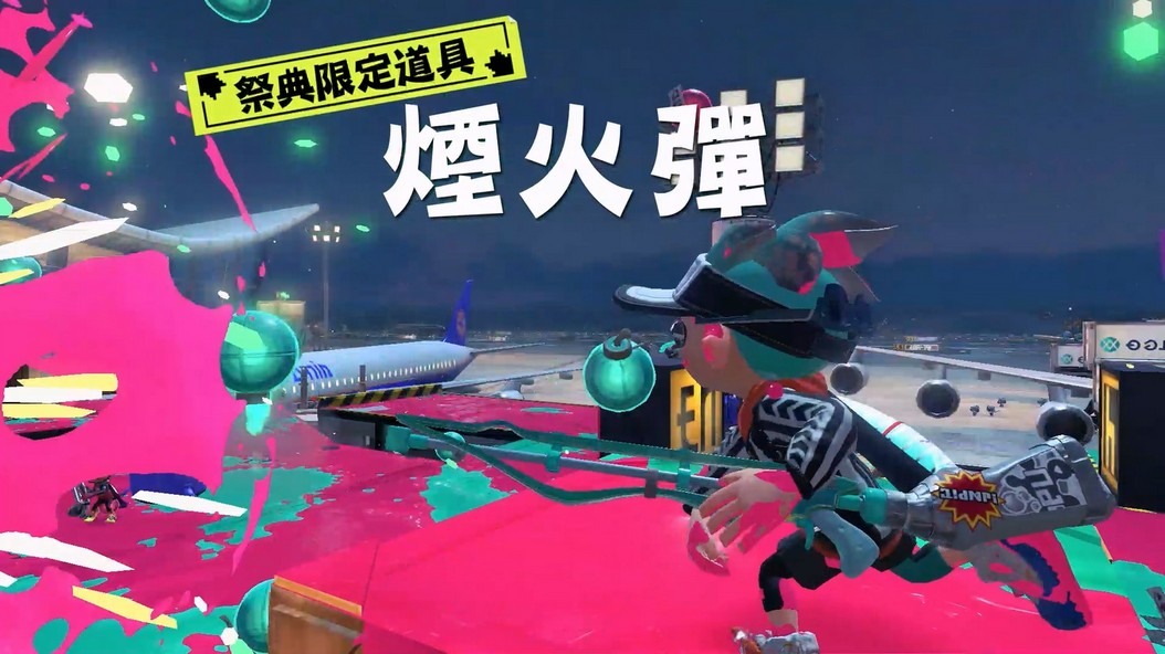 接著,從下次的祭典開始會提供新的限定道具「煙火彈」,投擲出去將發射墨汁煙火,能夠把周圍塗上顏色。盡情發射煙火,將祭典的夜空變得